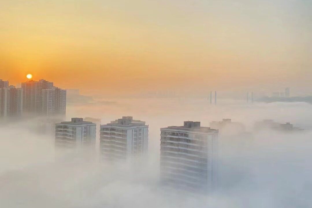 品鉴:初升太阳,云雾缭绕,仿佛置身在仙境,俯看大地的辽阔。)