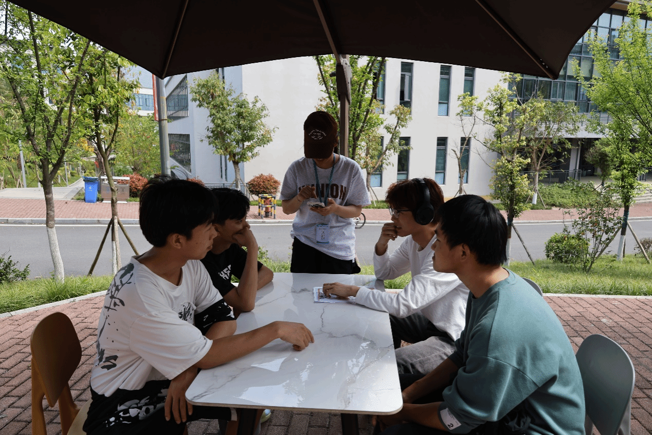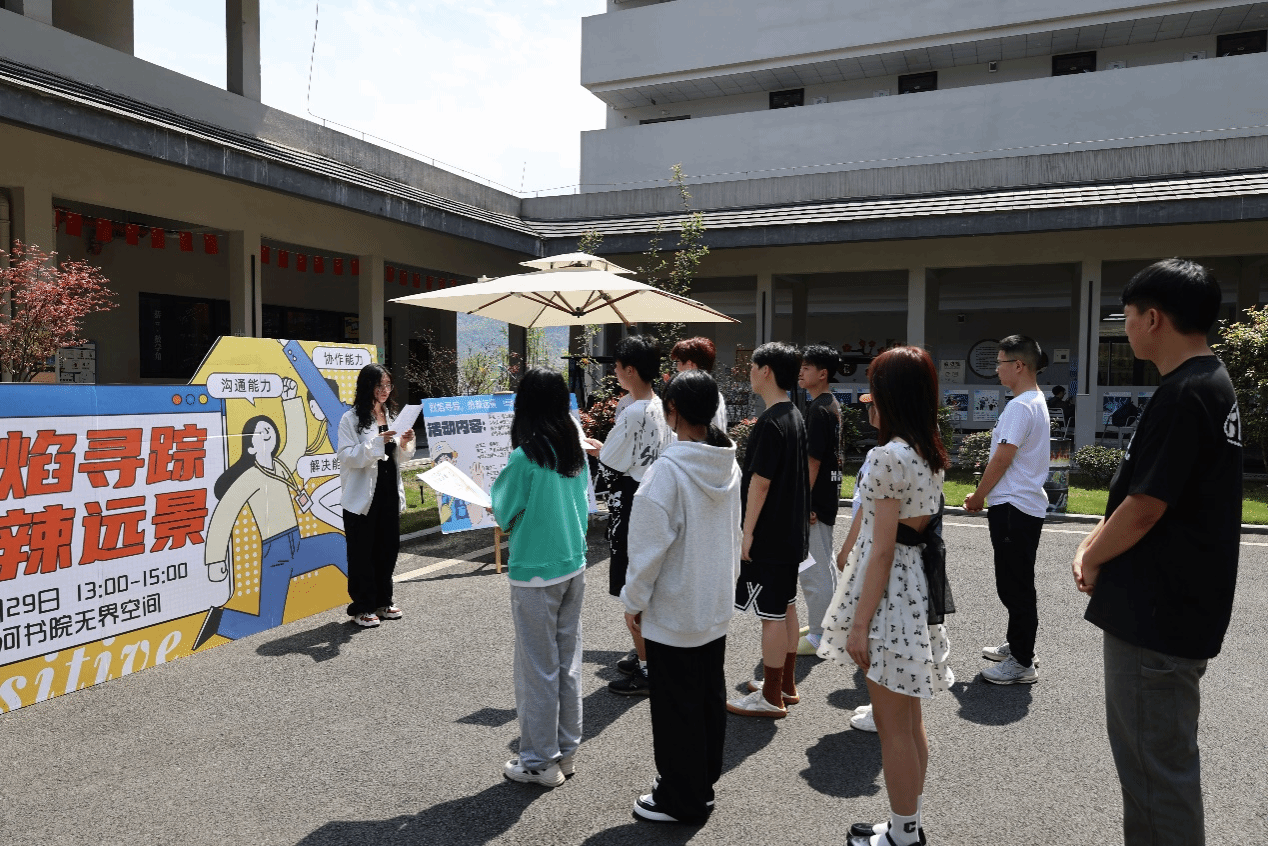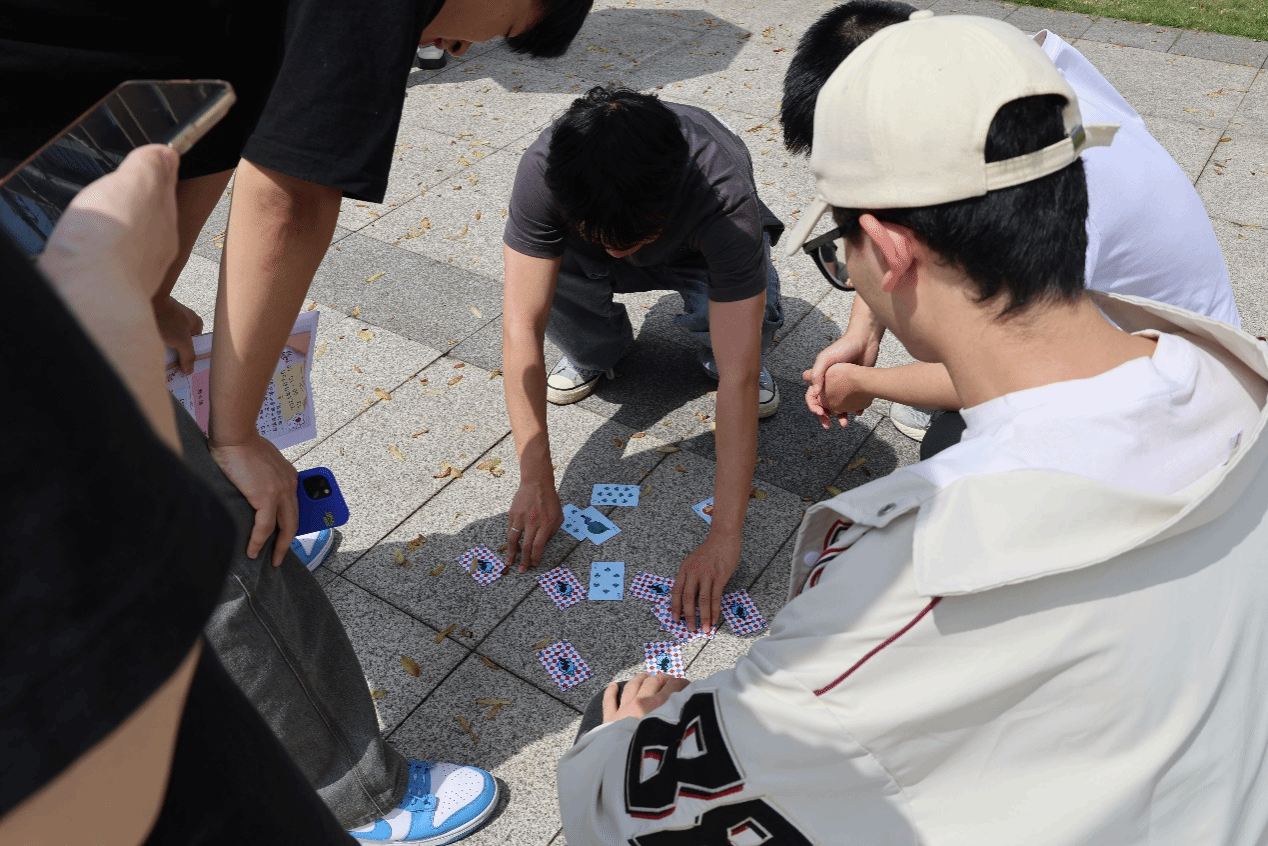 活动伊始,所有活动参与者如约汇聚在綦河书院中庭,随着工作人员详细讲解游戏规则和积分之后,同学们有序地开始游戏。游戏环节的第一章是在711商店的附近,参赛者也是迅速察觉了这个“宝地”,在“你比我猜”这个游戏中,各个队伍笑料频出,从“完全get不到”到“心有灵犀一点通”, 团队间的协作能力在游戏过程中快速提升;同时,有的队伍快速找到了下一个目标地——图书馆前广场。这里考验的是策略和团队合作的“解锁谜题”游戏.尽管,队员们各执其词,但在游戏规则的框架下,他们不得不商量出一个最佳的解决方案,当然,也不乏有队伍协商无果而遗憾败北。接下来的挑战点隐蔽在东溪食堂旁,是大家熟知的“无声世界”环节,挑战者需根据提示猜测歌曲,虽然看似简单,实则需要敏锐的听力和团队协作。最后一块地点引人注目但极具挑战性,“达芬奇密码”不仅检验了团队的合作精神,更是挖掘了选手们的决策力与判断力!