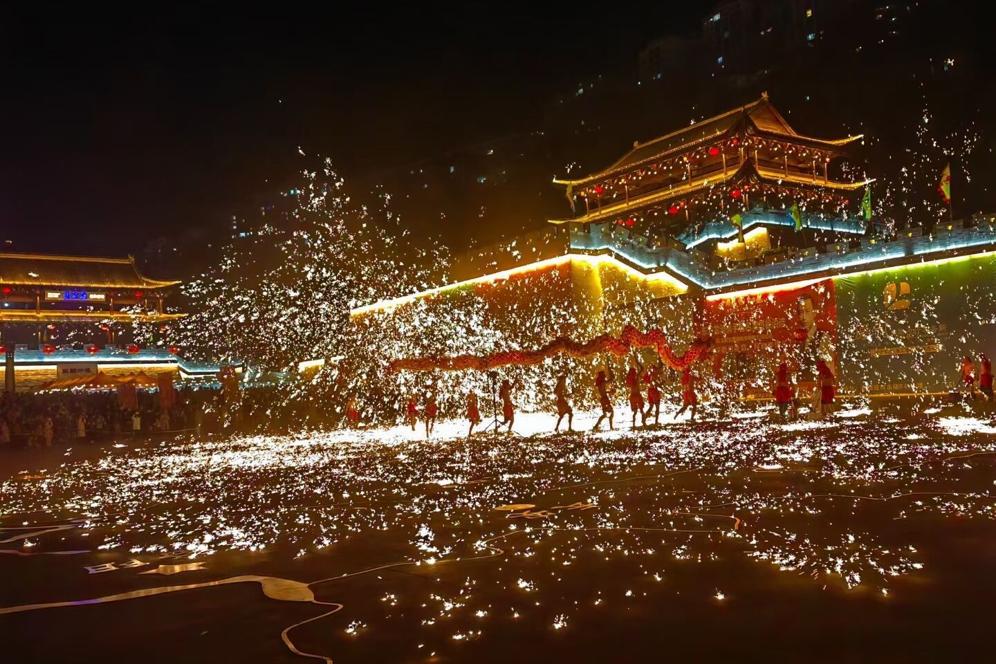 点评:火树银花星满天,兄弟姐妹齐欢颜,满天飞舞的火花与舞龙相结合,宛如真龙在空中飞舞,年味扑面而来。