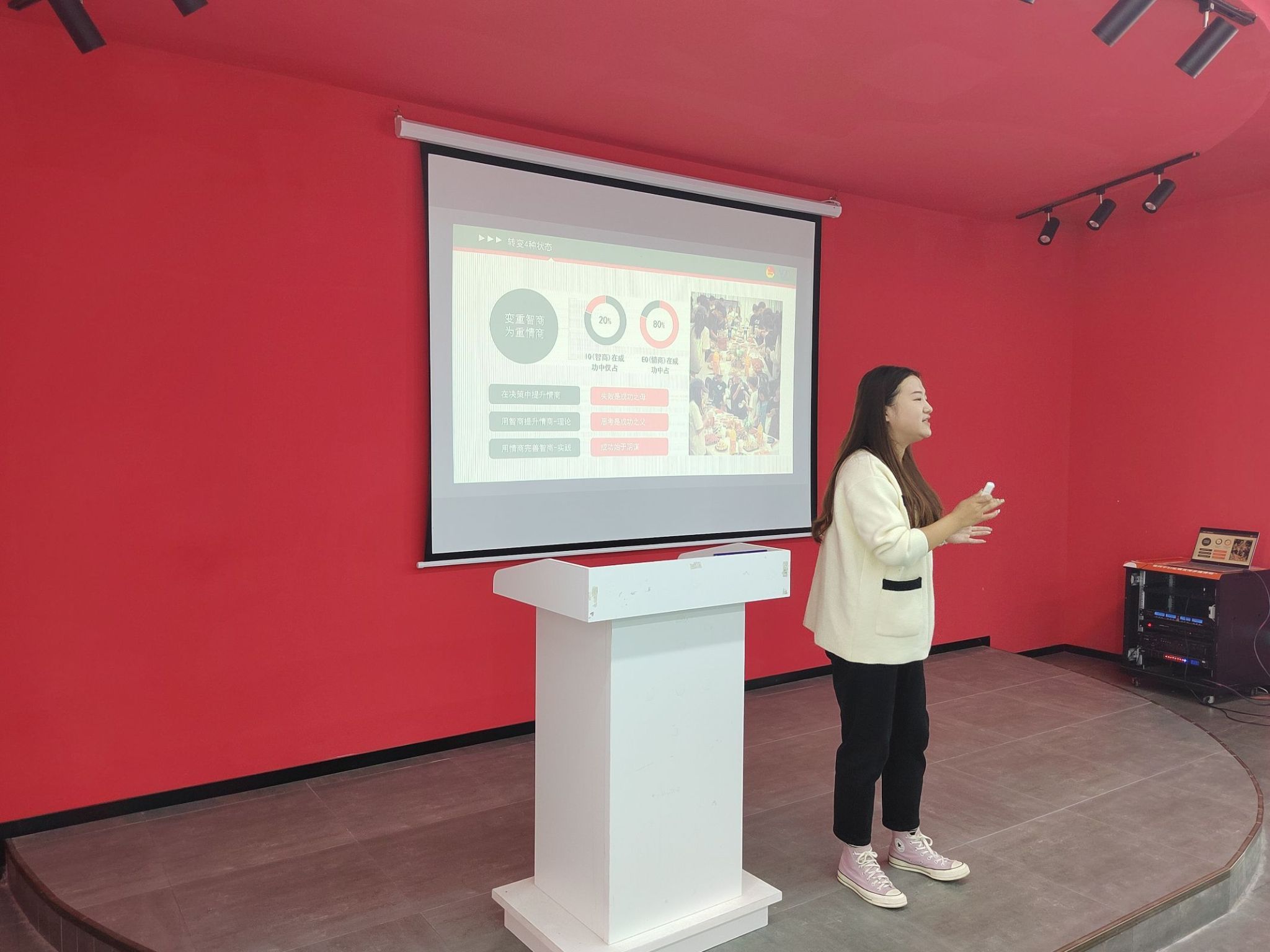 杨老师通过展现成功人士的情商在成功中占比高达百分之八十,再次向同学们强调了高情商的重要性。为了让同学们更好地认清差距与不足的概念,杨老师特地进行了深度剖析,分析表明,在生活工作中,要敢于承认差距,勇于承认不足。只有看到了差距才会努力,看到了不足才会奋斗,这两者并列却不完全相同,是构建和谐团体的重要因素。在分清概念后,一定少不了强化。“有位一定要有为”,在该有的位置做好该尽的责任,不要因为居于高位而贬低他人。