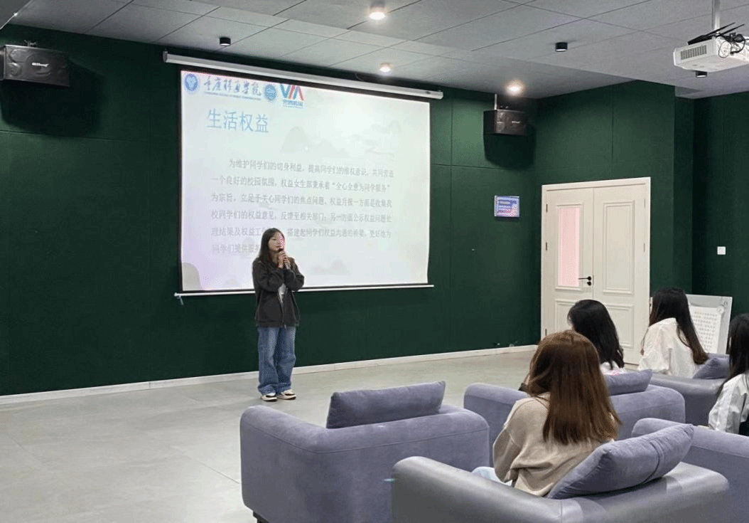 活动开始,首先宣讲的就是生活权益方面,由权益女生部部长谭莹带领大家系统认知权益保护。在讲述中,谭莹部长细致的讲解了大家该如何维护自己的权益,让同学们知道了在权益方面我们能为自己争取到什么,同时为同学们提供了维权渠道。