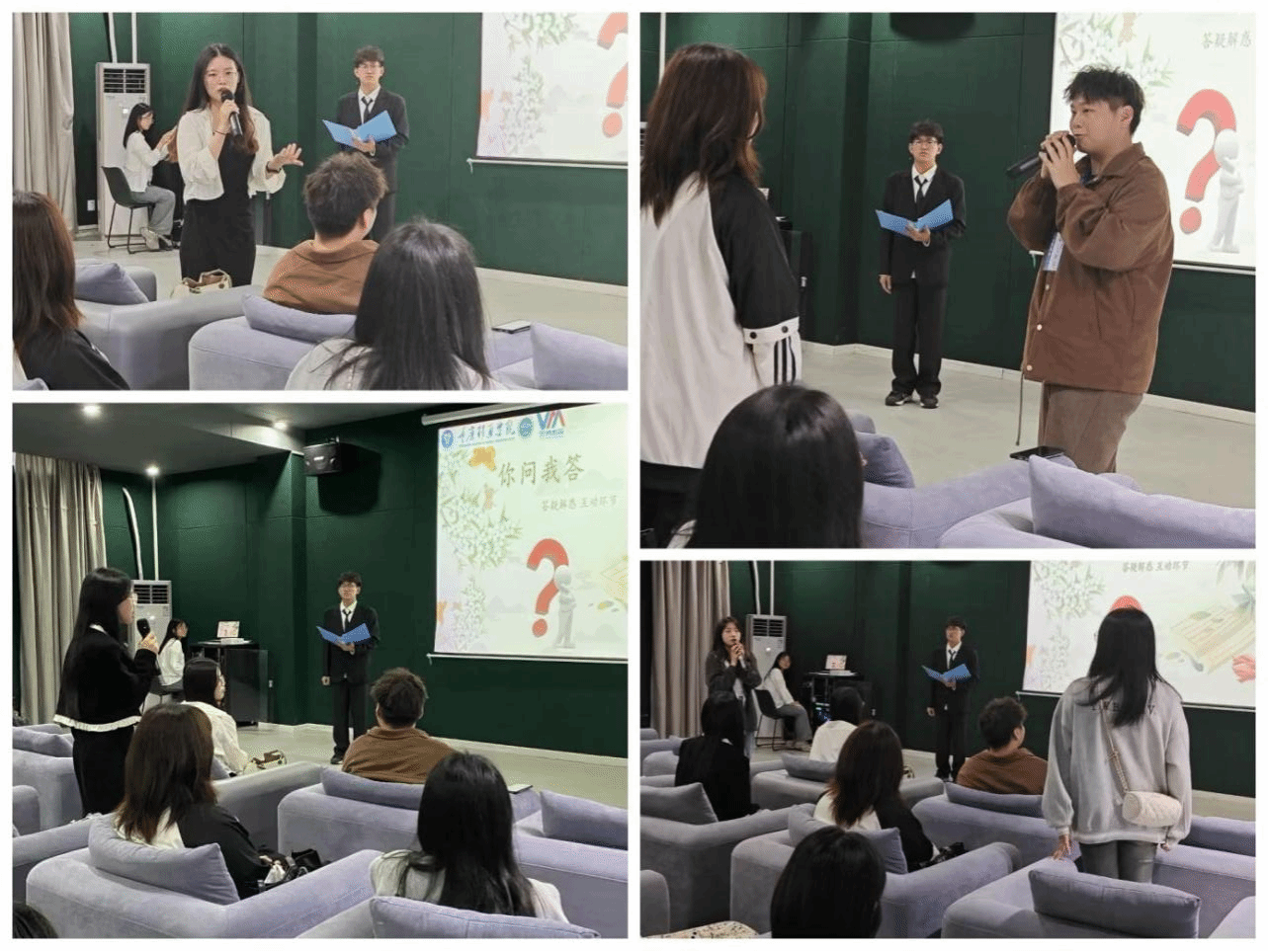 当三位宣讲人讲解完后,为了提高大家对于活动的参与度,开始了由主办方专门设计的第四个板块——“你问我答”环节。由现场的同学提出自己生活中的问题,首先一位参与者向谭莹部长提出了有关食堂方面的问题,主要是食堂种类问题和食堂配送问题,谭莹部长和蔡娜老师也给出了可以向食堂部门人员提建议的解决方案,很好的保障了学生的食堂权益;还有一位参与者向杨嘉鹏楼长提出了关于宿舍方面的问题,宿舍隐私和宿舍晾晒大件衣物也在双方互动中得到较好的解决方案。在为同学们进行答疑解惑中,大家的热情显而易见得提高,现场气氛十分活跃。