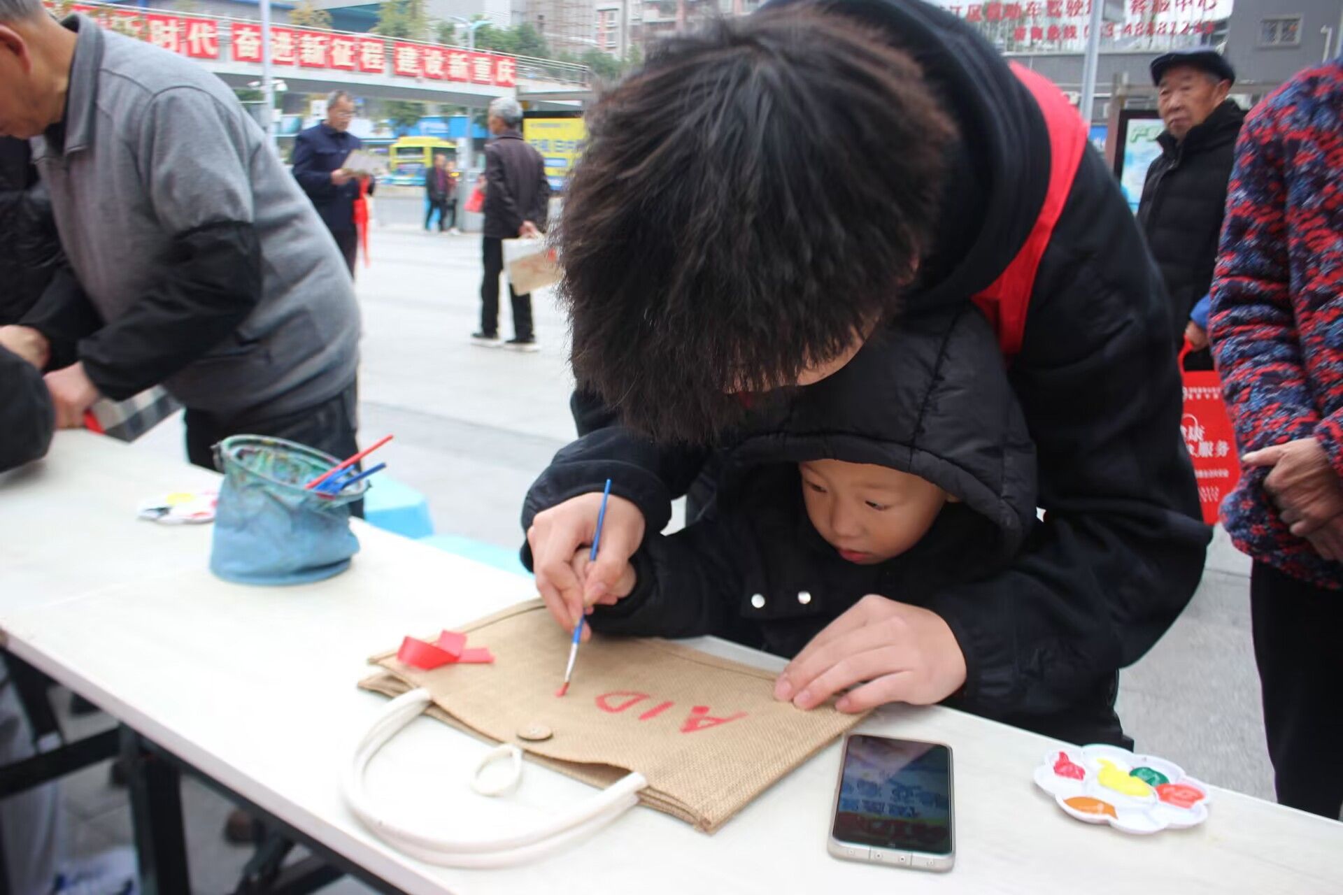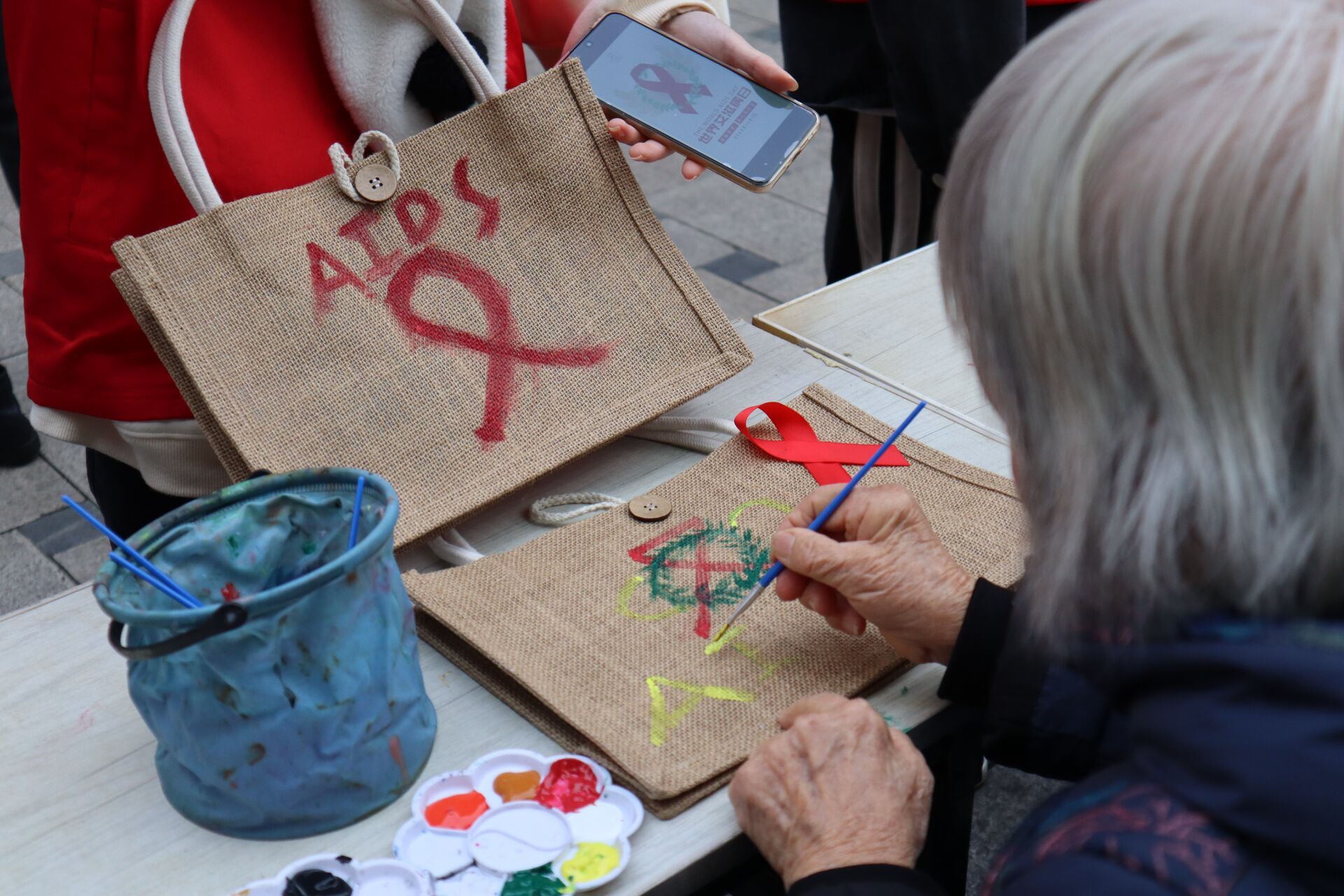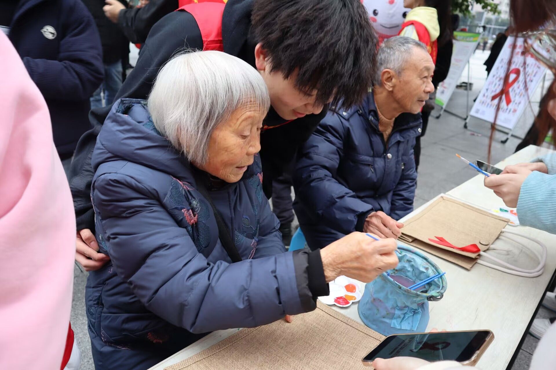 活动伊始,各年龄段的市民纷纷加入防“艾”宣传活动中。志愿者们引导并辅助参与者亲手绘制手提袋,现场洋溢着浓厚的防“艾”氛围。同时,活动中还穿插艾滋病防治知识的宣讲环节,在此过程中市民积极向志愿者提问,寻求相关信息,志愿者们则耐心细致地解答疑问,并向公众介绍天使关“艾”志愿服务专项支队的相关活动及其周边信息。