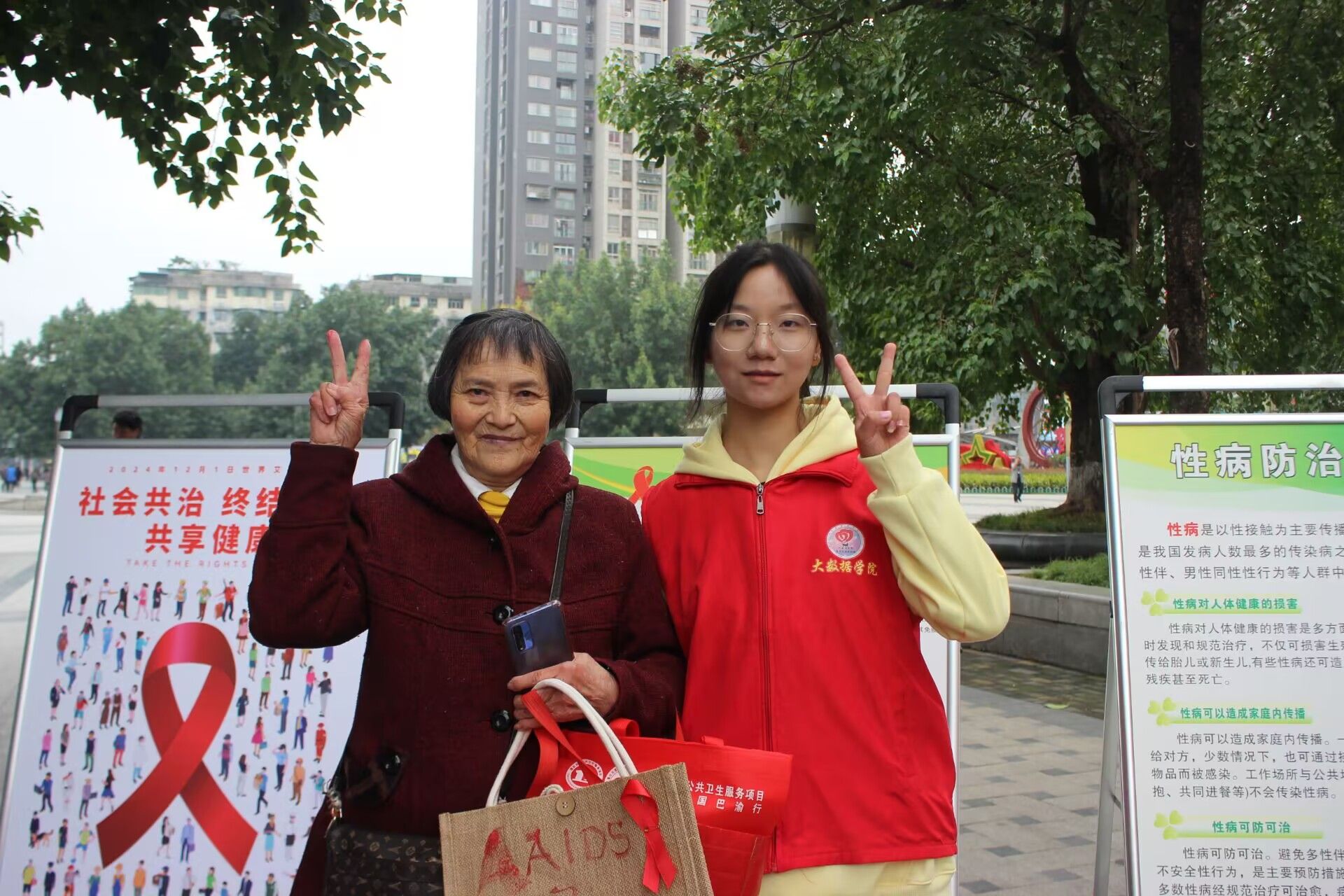 为了普及性病和艾滋病、生殖健康的关系,强调预防艾滋病的重要性。2024年11月28日,大数据学院天使关“艾”志愿服务专项支队在綦江区文龙街道营盘山广场举办一场以“社会共治,终结艾滋,共享健康”为主题的宣传活动。此次活动旨在倡导全社会各界共同参与,推动“主动检测”与“促进生殖健康行动”,倡导感染者早发现,携手抗击艾滋病和性病,切实维护人民群众的身体健康和生命安全。