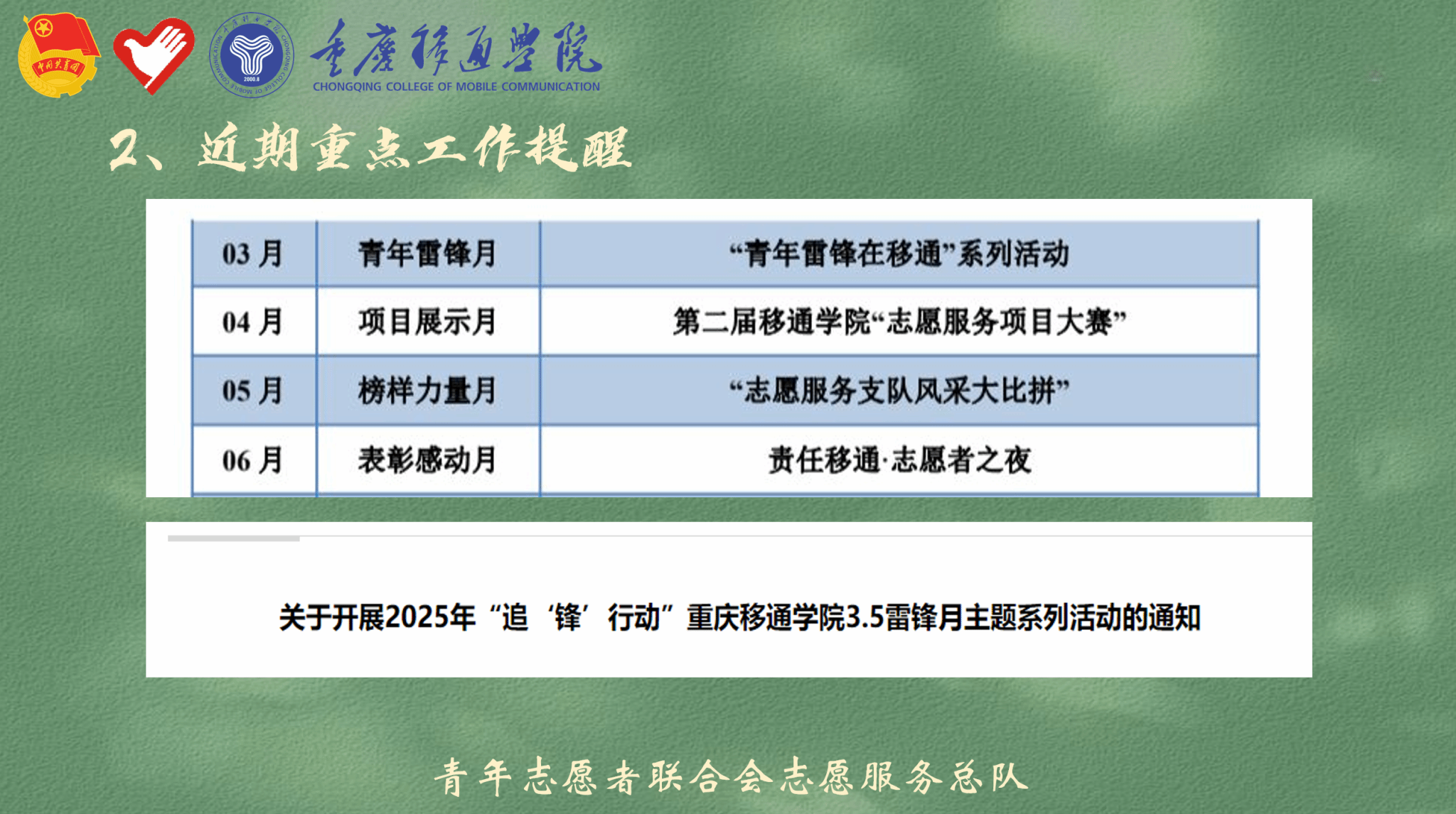 聚焦"一月一主题"移通学子在行动专项工作,会议着重强调近期重点任务的推进与落实,60+雷锋月系列活动的推进工作也成为本次会议的探讨重点,姜馨怡老师从“月月有活动”“活动质量推进”“活动后期推广”几方面进行后期工作重点部署,通过建立工作提醒机制,引导各支队关注关键时间节点与核心工作内容,有效避免工作疏漏,确保志愿服务项目有序推进,为全年工作规划奠定战略性基础。