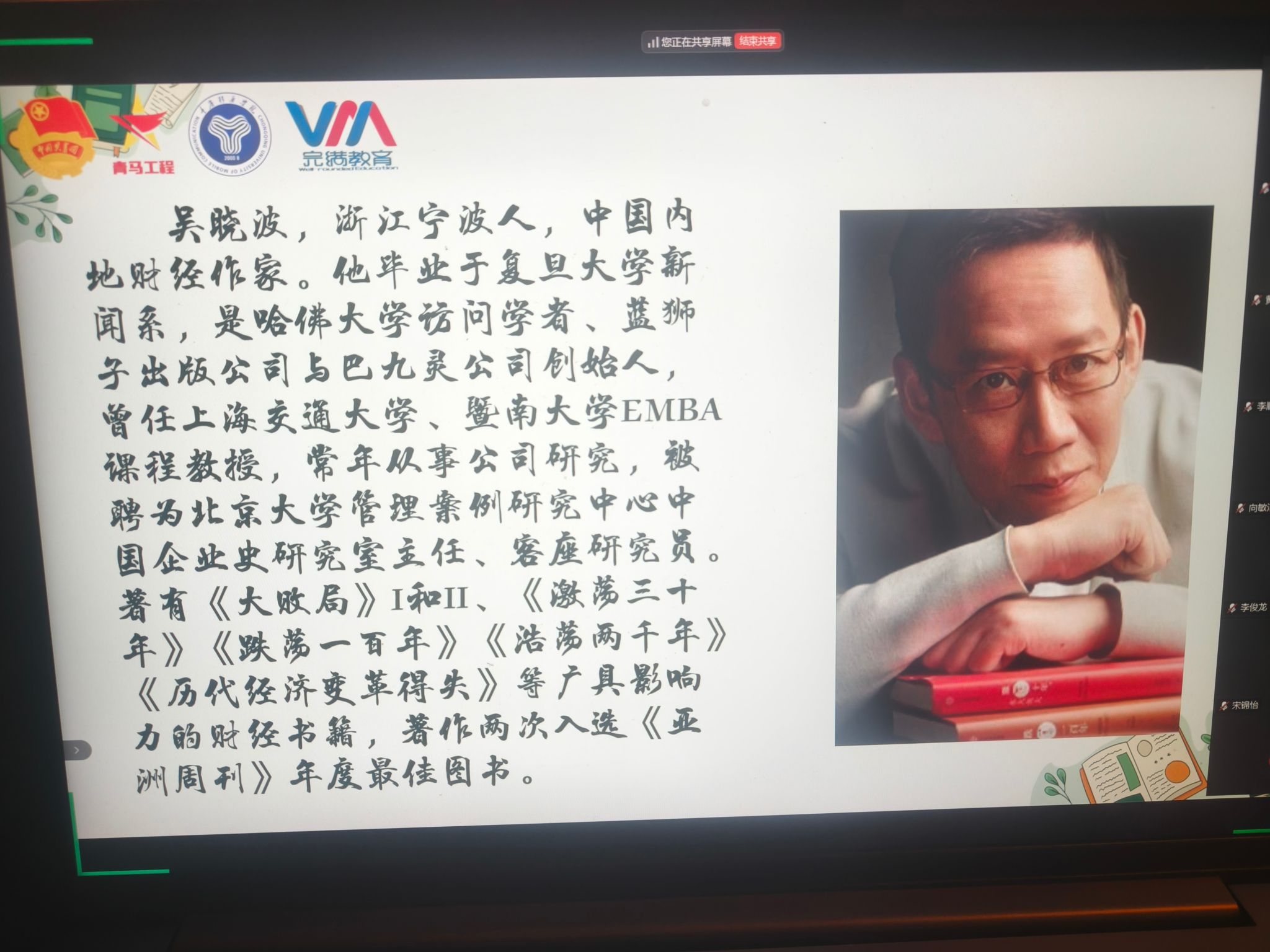 来自校团委的代麒麟同学分享了《巴菲特传》。他借以巴菲特经历表达了青春是匆忙的,把握机遇,追寻自己心中所想,心动的同时不如付诸行动,学会简洁地去做并不容易的事,而这也是我们所应具有的。