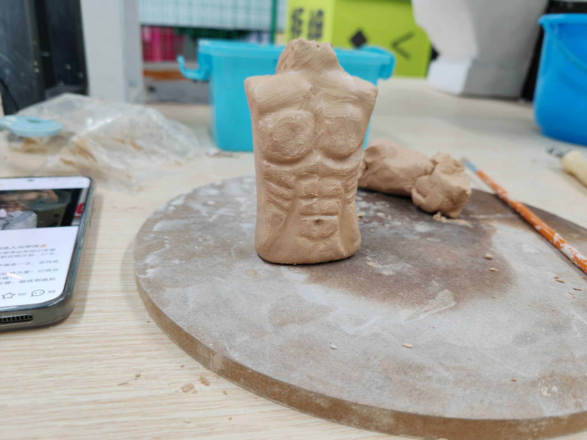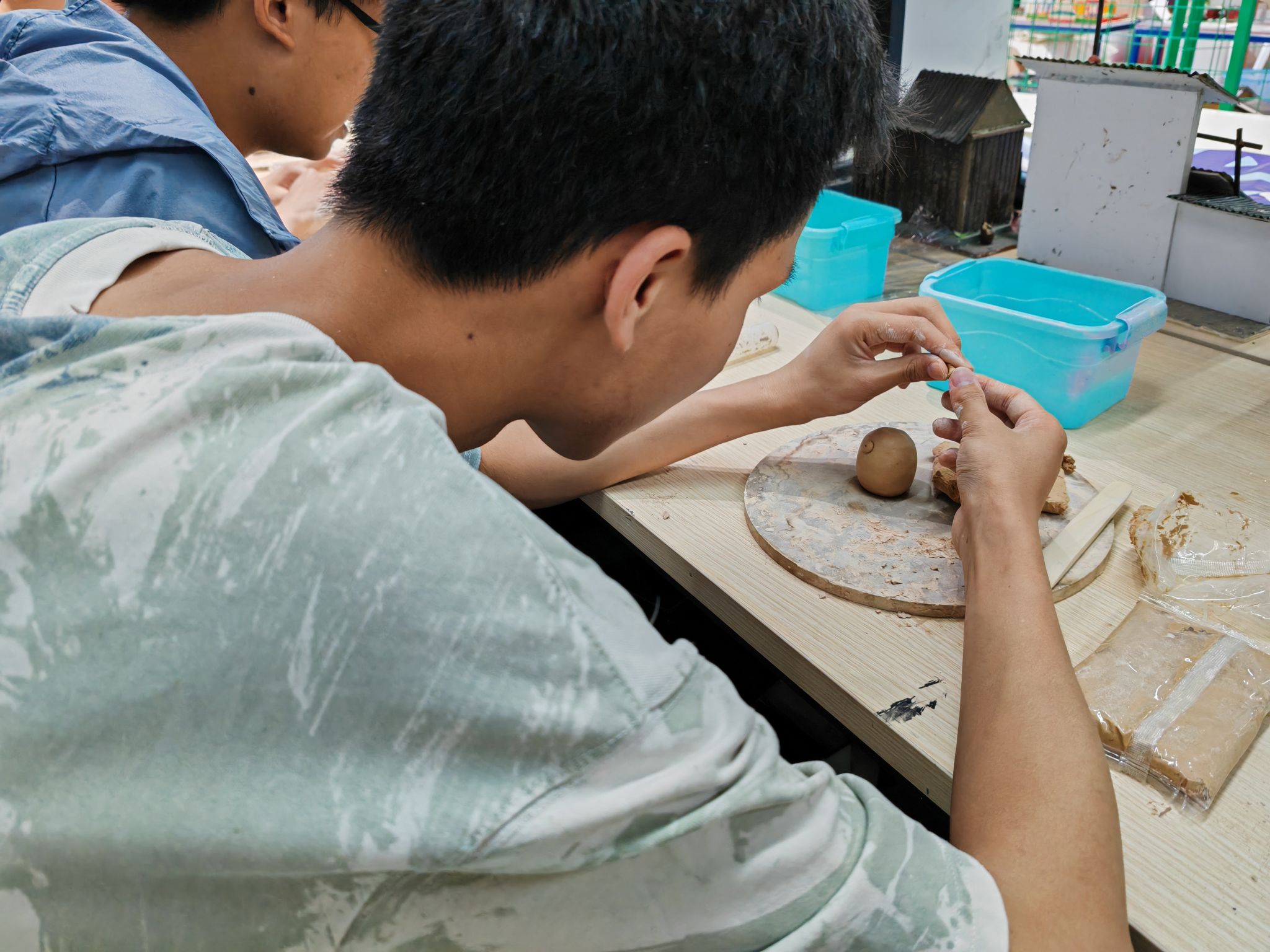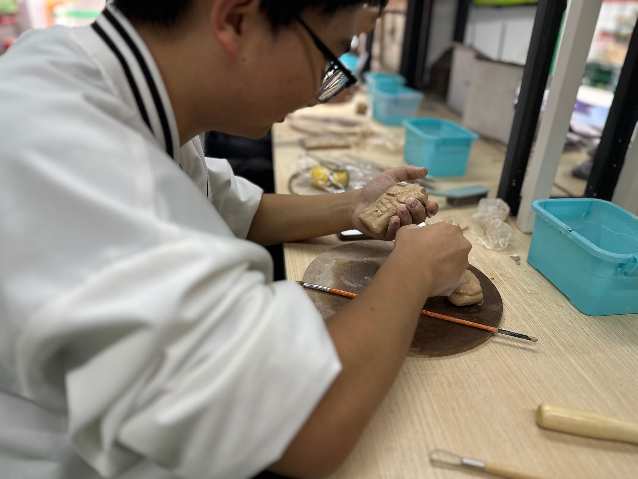 桌上整齐码放的陶泥还带着湿润气息,同学们迫不及待地展开创作:搓、捏、刻、粘……一双双沾满泥浆的手在光影中翻飞。