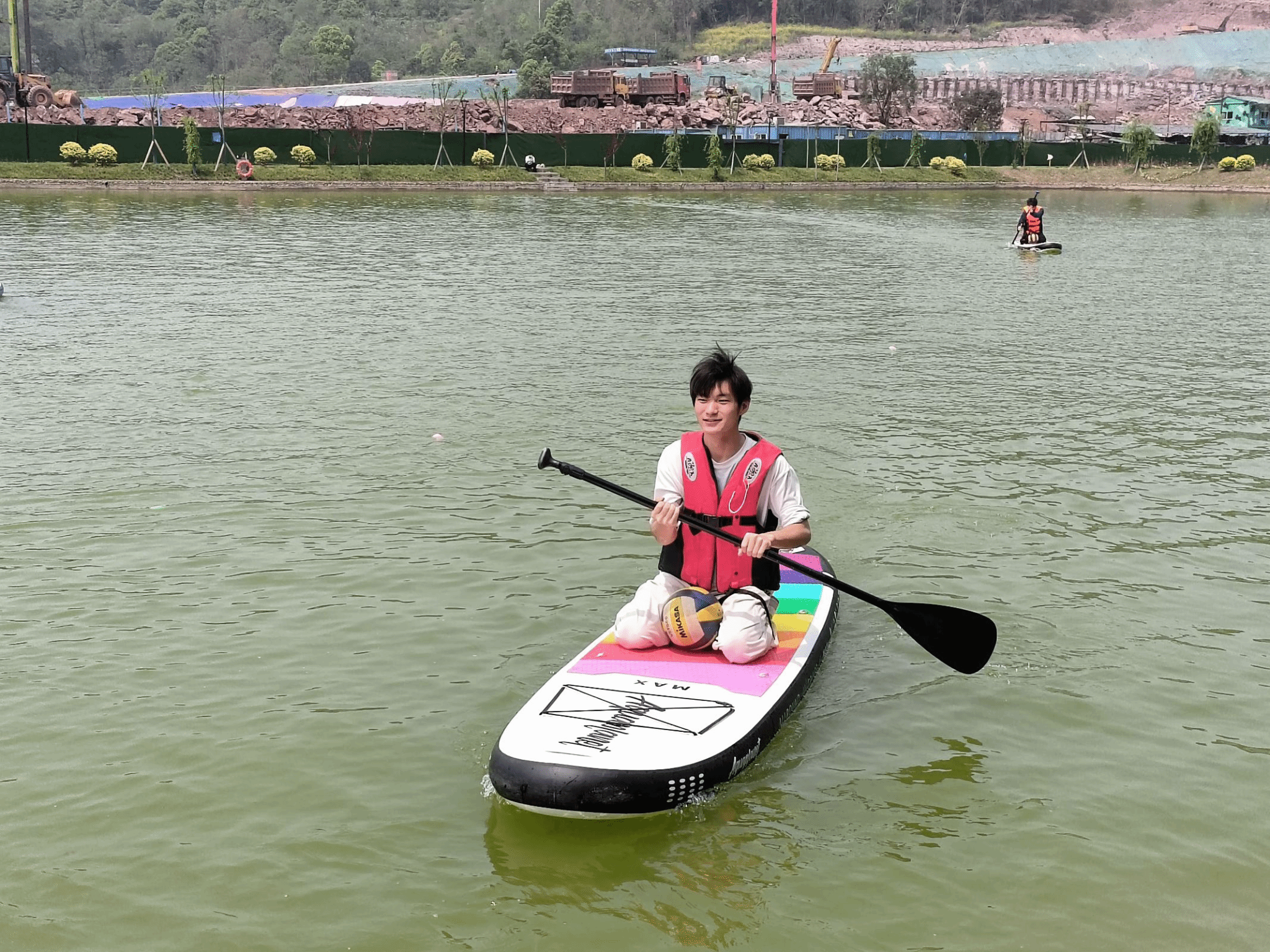 “以为桨板只是单纯‘上去划水’,没想到运输排球时差点摔成‘落汤鸡’! 特别是在第二个项目中,为了能捞到球,结果失去平衡掉进水里两次,其实水里挺凉快的,真的!”