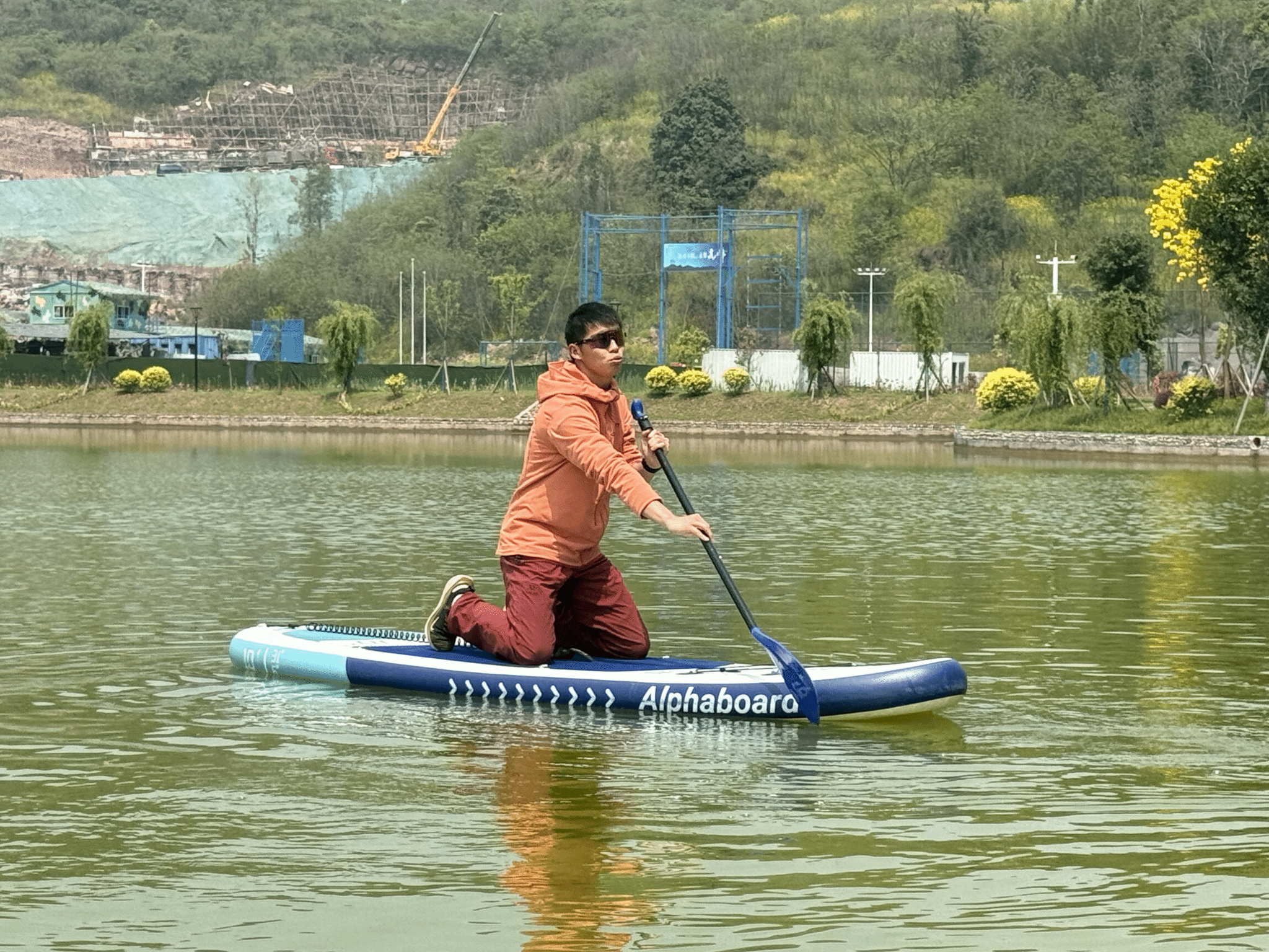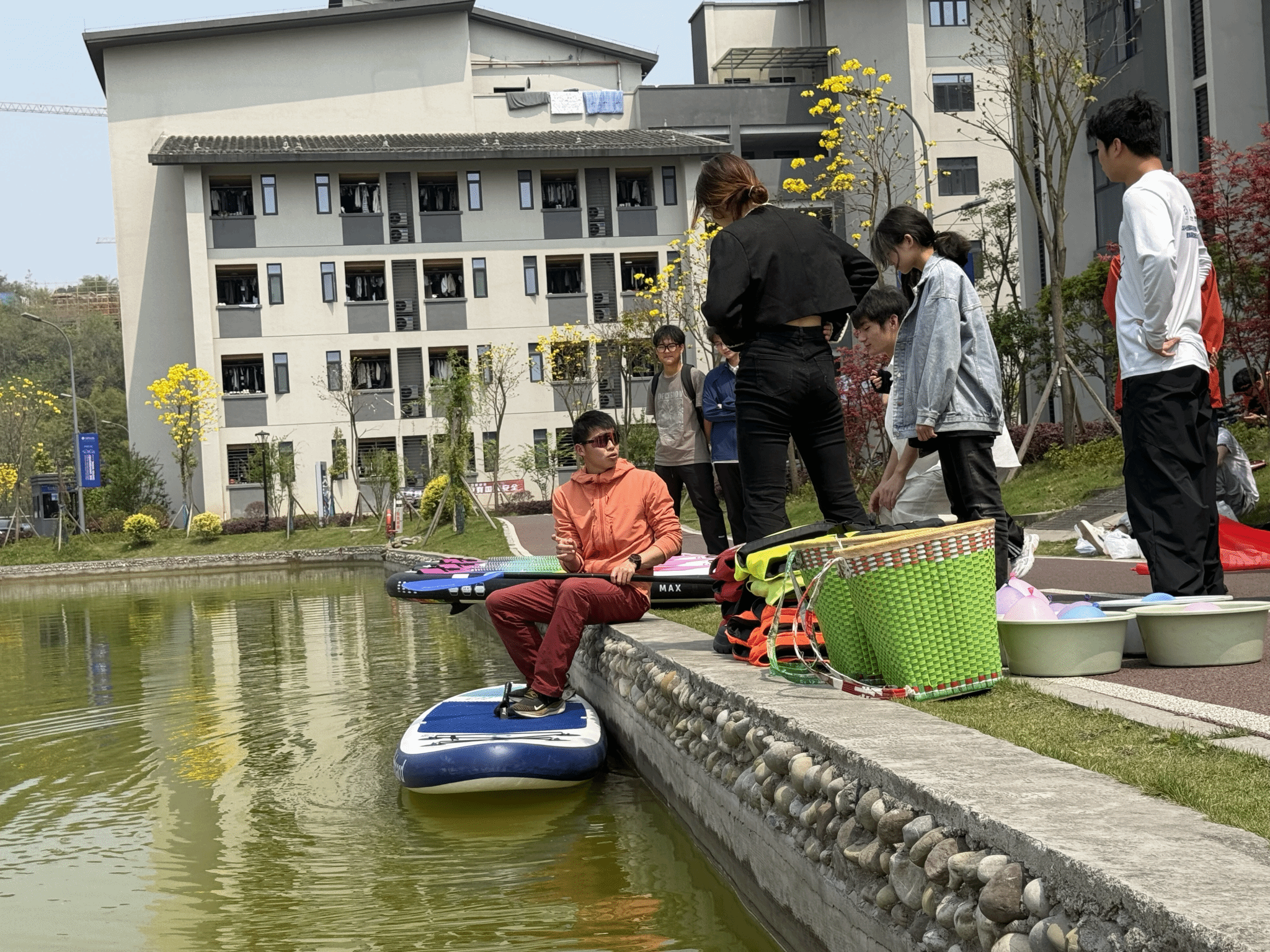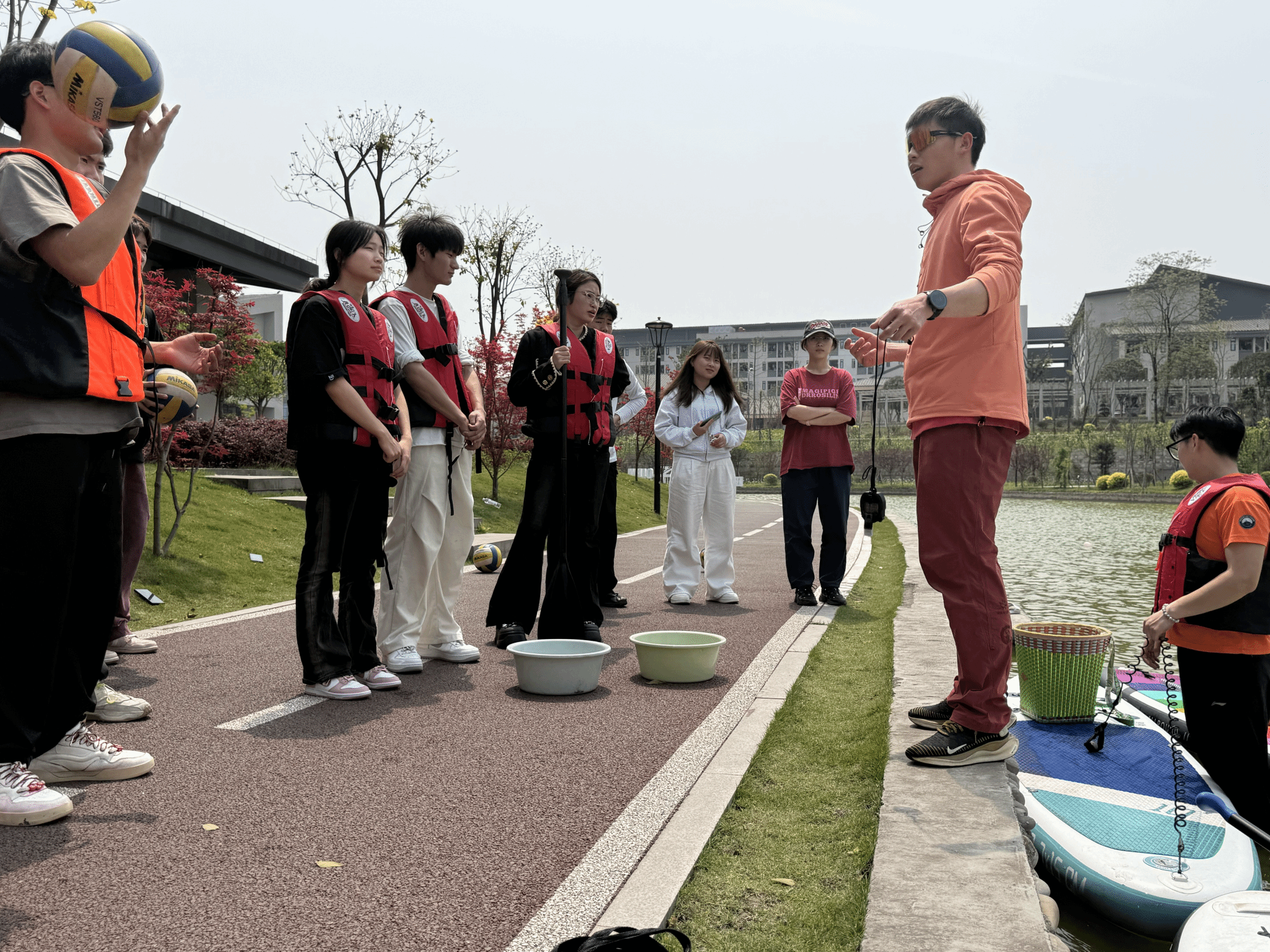 本次活动邀请到了营地训练中心教练王宁老师,并在王教生动细致的教学中正式拉开帷幕。“握桨时虎口对准桨叶,重心下沉,膝盖微曲——”王宁教练讲道,“就算落水也不必紧张,因为我会把大家捞起来。”王宁教练幽默的教学形式,引发了阵阵掌声。此外,专业教练团队的成员们也一一为同学们现场演示救生衣的正确穿戴方式和桨板操作技巧,包括落水自救、平衡控制等安全要点,为本次活动奠定了安全的基石。