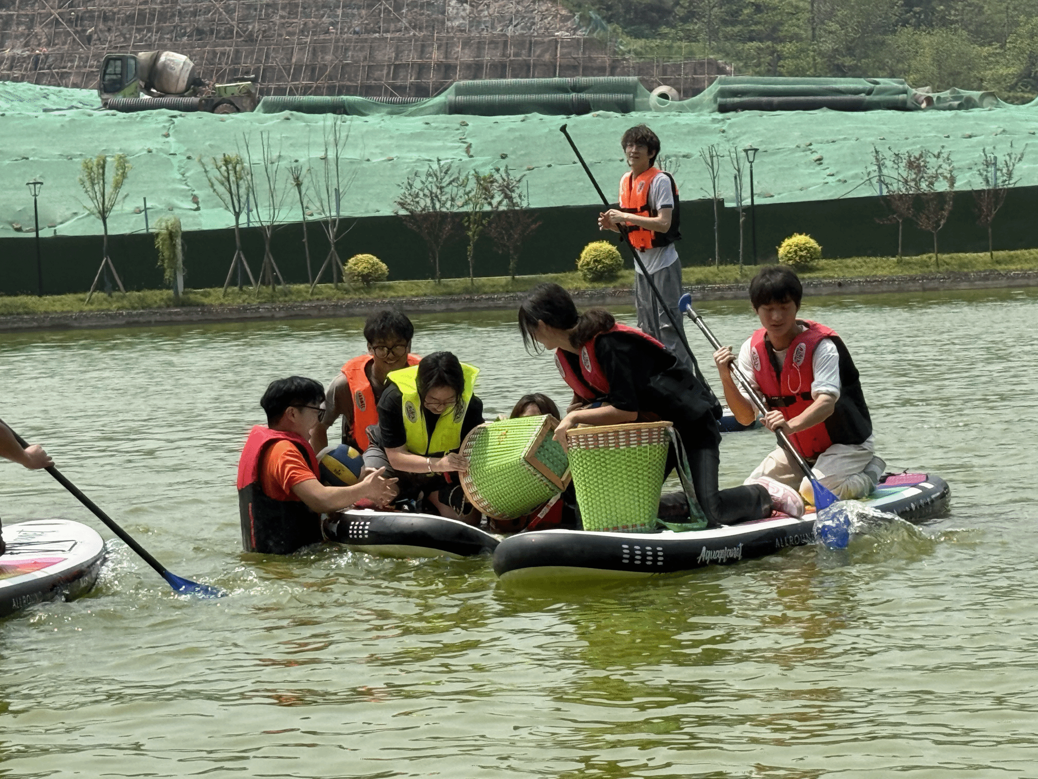 赛事初期,一队凭借经验丰富的队员在首项比赛中取得领先优势,然而在第二个名为"桨板贪吃蛇"的竞技项目中遭遇逆转。该项目的竞赛场景设置在漂浮着三十只彩色气球和六个排球的湖面上,要求每支参赛队伍两人共乘一块桨板协同作战:船尾队员需全力划桨推进,船头队员则需手持背篓精准捕捞漂浮物。尽管一队在开局阶段保持领先,但二队通过策略性利用规则盲区,直接实施了抢夺一队背篓的战术操作,最终实现了比分反超。