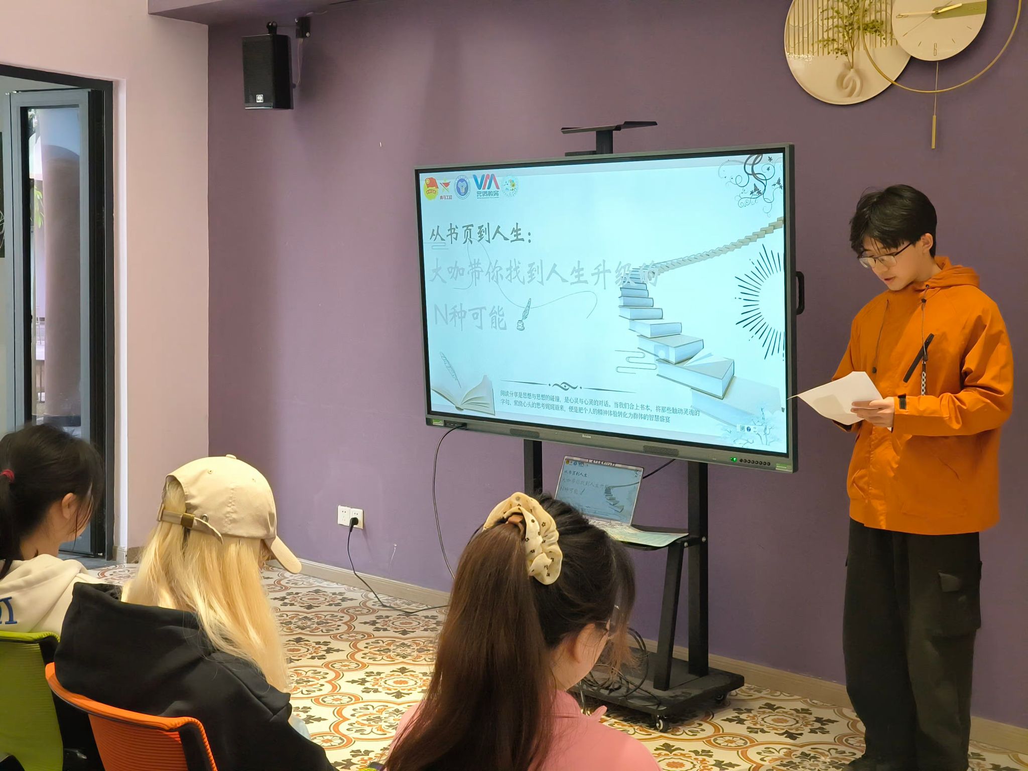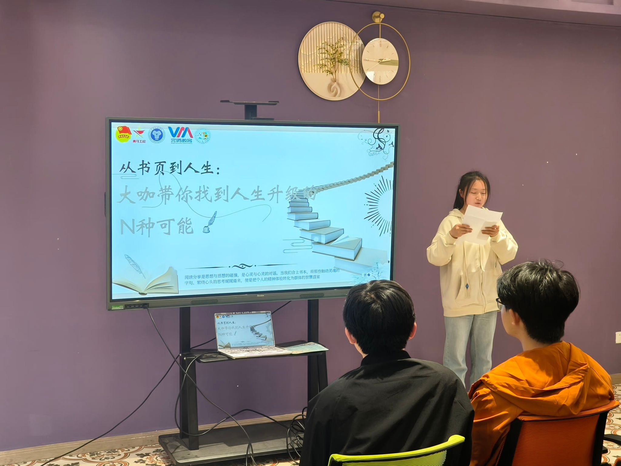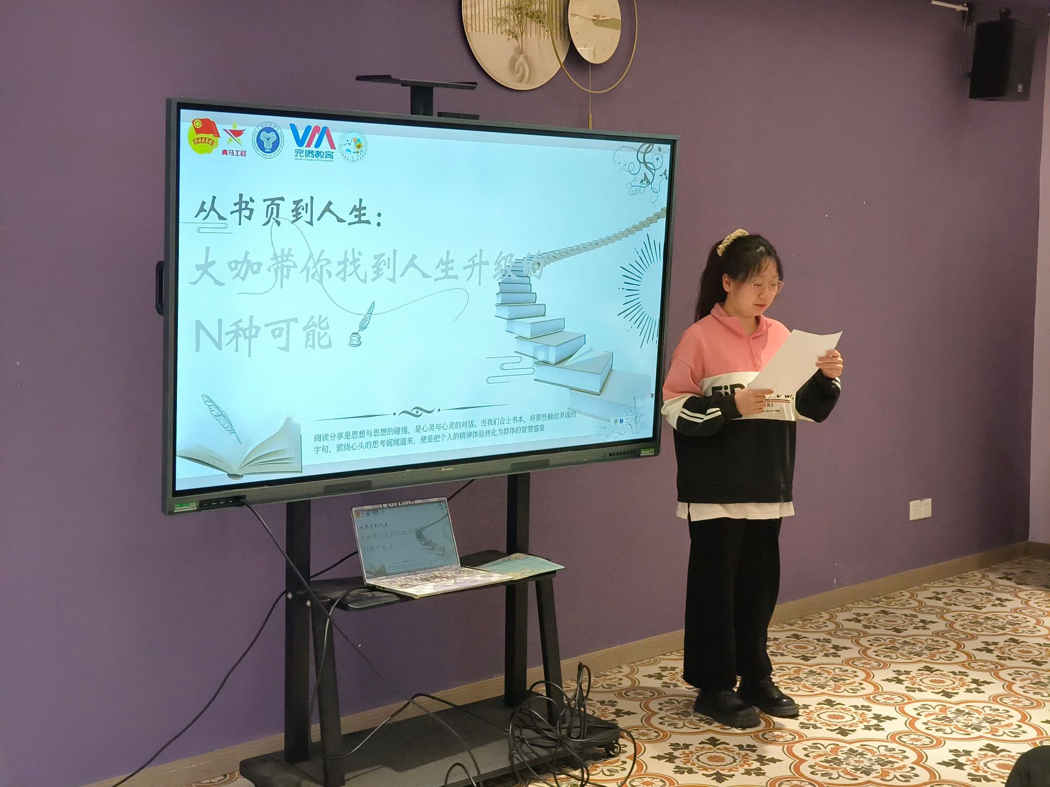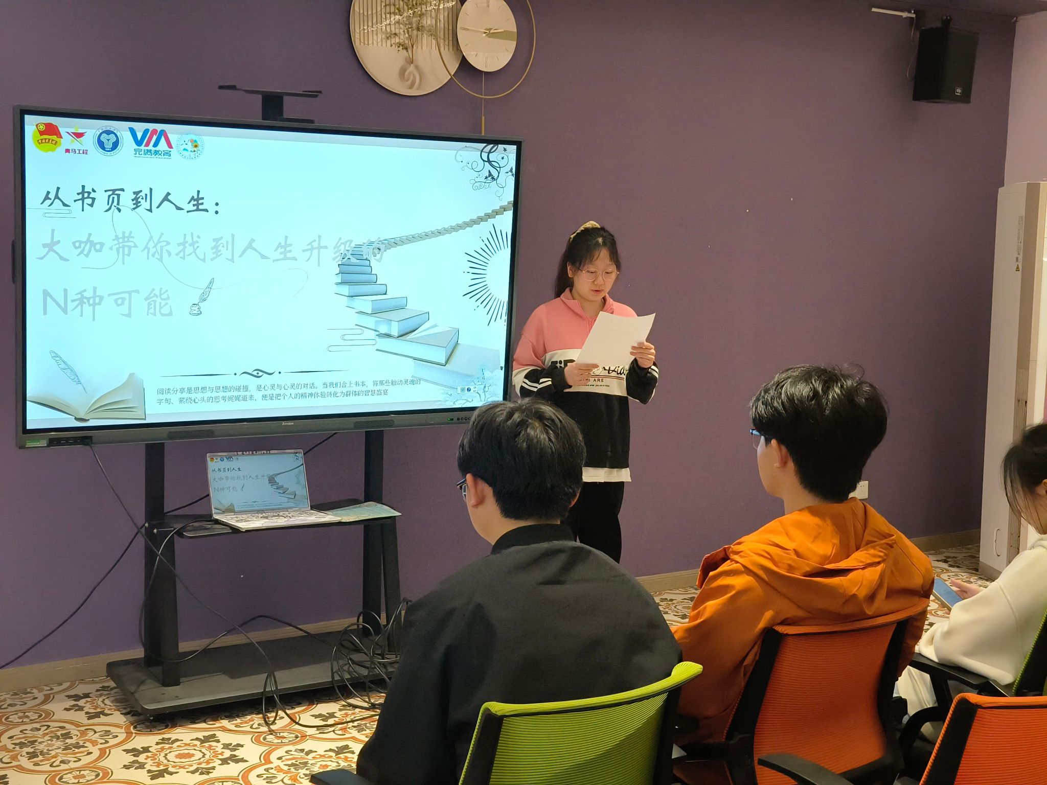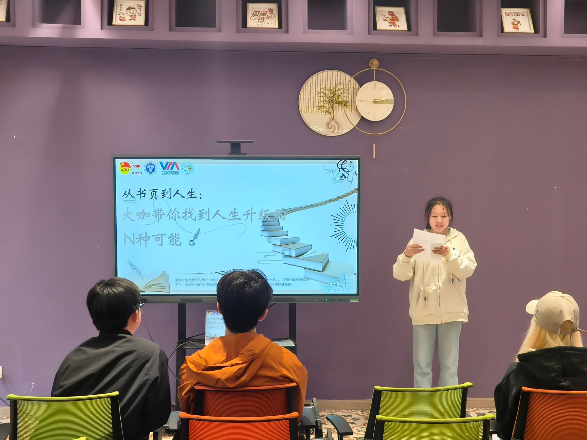 世界读书日的这场阅读分享会,对我来说是一次难忘的经历。在“思想领航”环节,我尝试用情景演绎的方式分享了我喜欢的书中金句,得到了同学们的认可,这让我备受鼓舞。这次分享会也让我看到了自身的一些不足,比如在表达和逻辑方面还需要加强。但我相信,通过不断地阅读和分享,我能够不断提升自己!