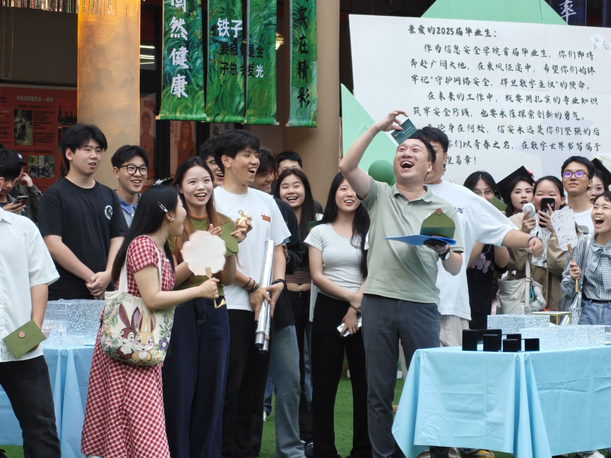 当《再见》的旋律响起,礼炮“砰砰”炸开星空,大屏幕开始“回忆杀”暴击:《致那时的我们》里,有熬夜敲代码的熊猫眼,有夺冠时的“表情包式欢呼”,还有毕业照里故意搞怪的剪刀手……不知道谁先红了眼眶,信息安全学院王宁院长说“愿你们此去如星辰,各自璀璨;愿信安永远是你们回首时的灯塔,照亮归途;更愿我们相约在更高处重逢,那时定是满目星辰,遍地花开。”这份期许,连同定制U盘里珍藏的点点滴滴,都将成为毕业生们奔赴山海时最温暖的行囊。
