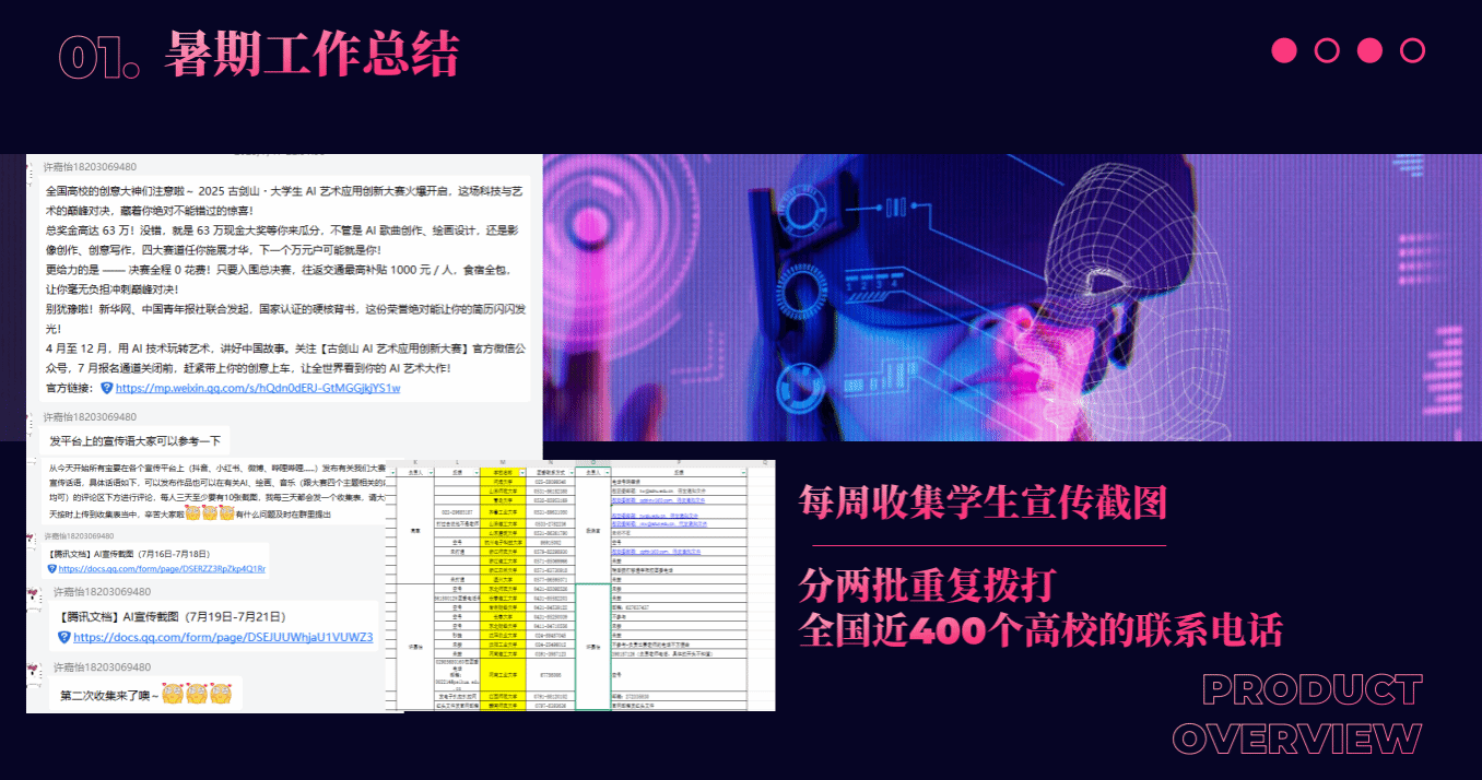 会议伊始,校团委姜馨怡就暑期团委工作部署、报名推进情况、作品收集与评审手册完善等对近期工作进行了整体汇报。校团委根据大赛性质组建20名志愿者为外宣团体,通过电话汇报与邀请、抖音小红书等媒体平台广泛发布,形成宣传网络,各赛道针对赛事属性定向邀请专业高校进行作品收集。经过暑期各赛道对宣传的加强,报名数据进行了质与量的提升,总体数据达到:AI音乐赛道共35个高校,95份作品;AI绘画赛道共59个高校,273份作品;AI影像赛道共168个高校,780份作品;AI创写赛道共180个高校,629份作品。