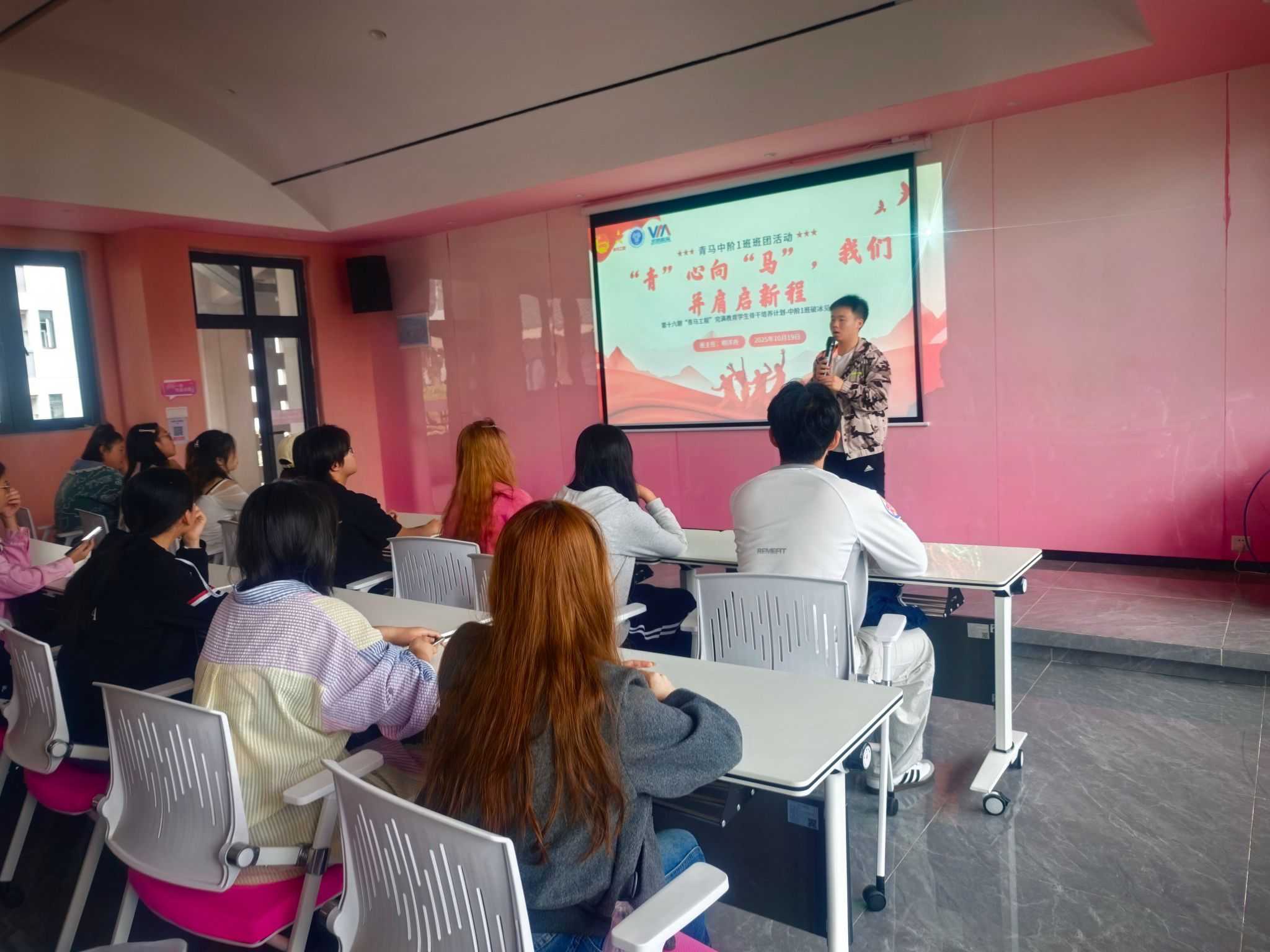 2025年10月19日,第十六期“青马工程”完满教育学生骨干培养计划中阶一班破冰见面会在丁山书院白羊座·演讲培训室顺利举行。本次见面会以“‘青’心向‘马’,我们并肩启新程”为主题,通过互动交流破冰、团队建设聚力,帮助学员打破陌生壁垒、深化彼此认知。这场温暖相聚,让中阶一班的同学们凝聚一心,共同开启属于他们的“闪耀”之路,携手逐光前行。