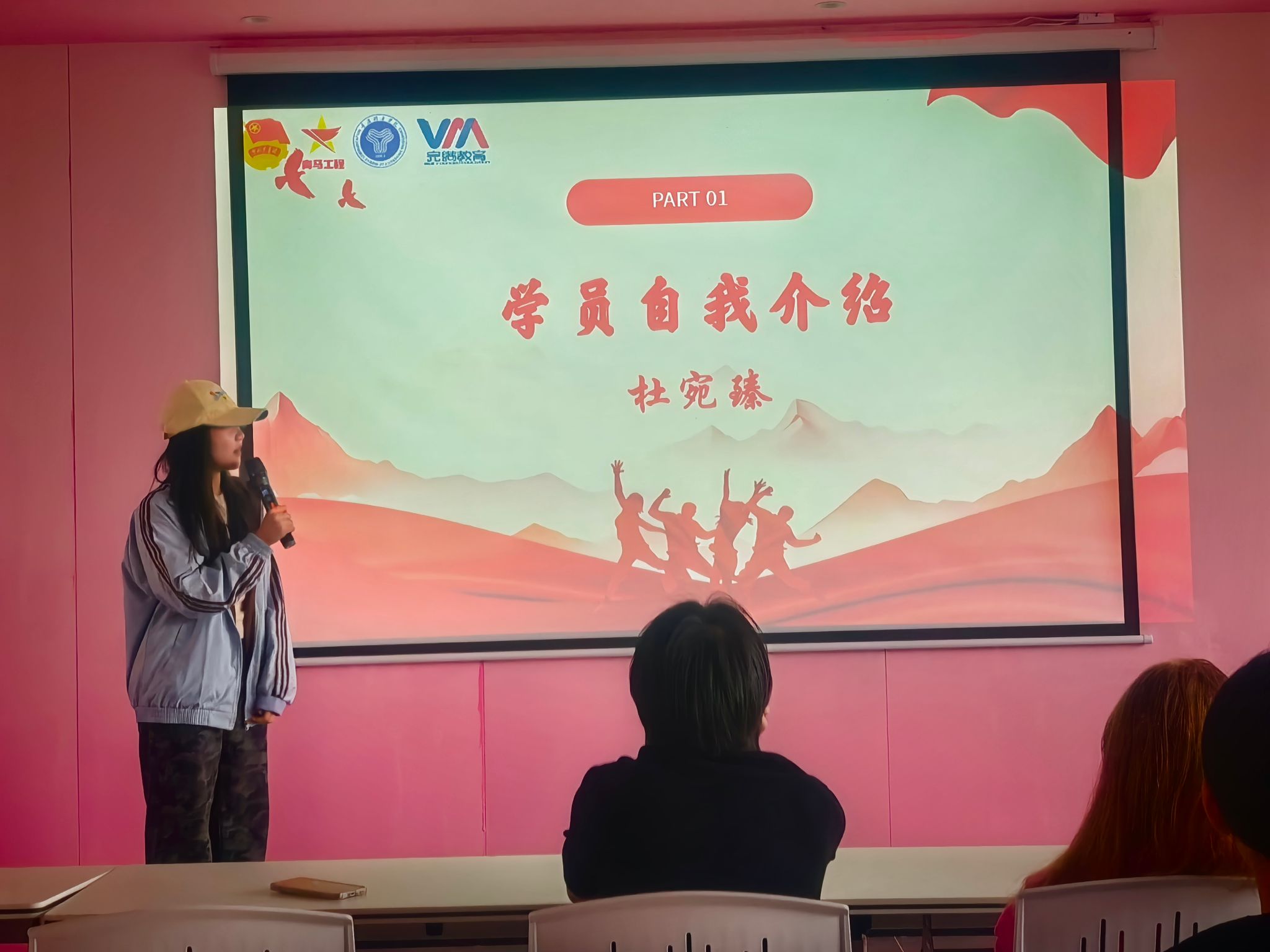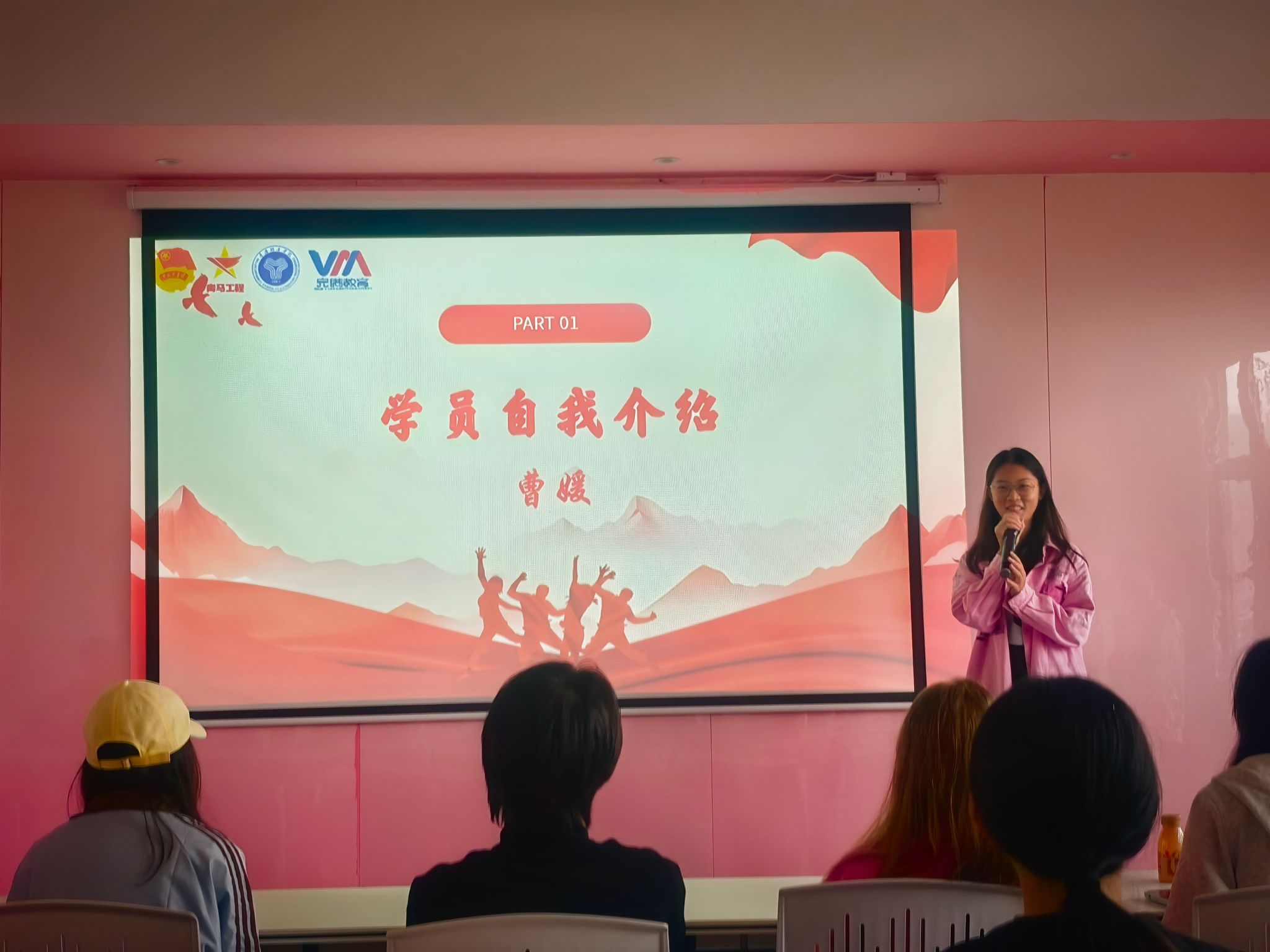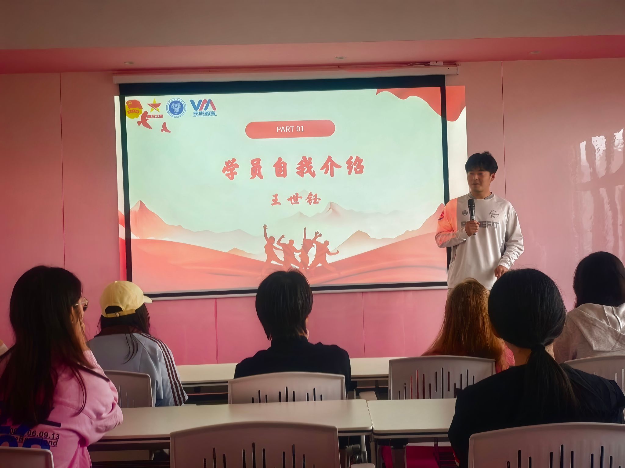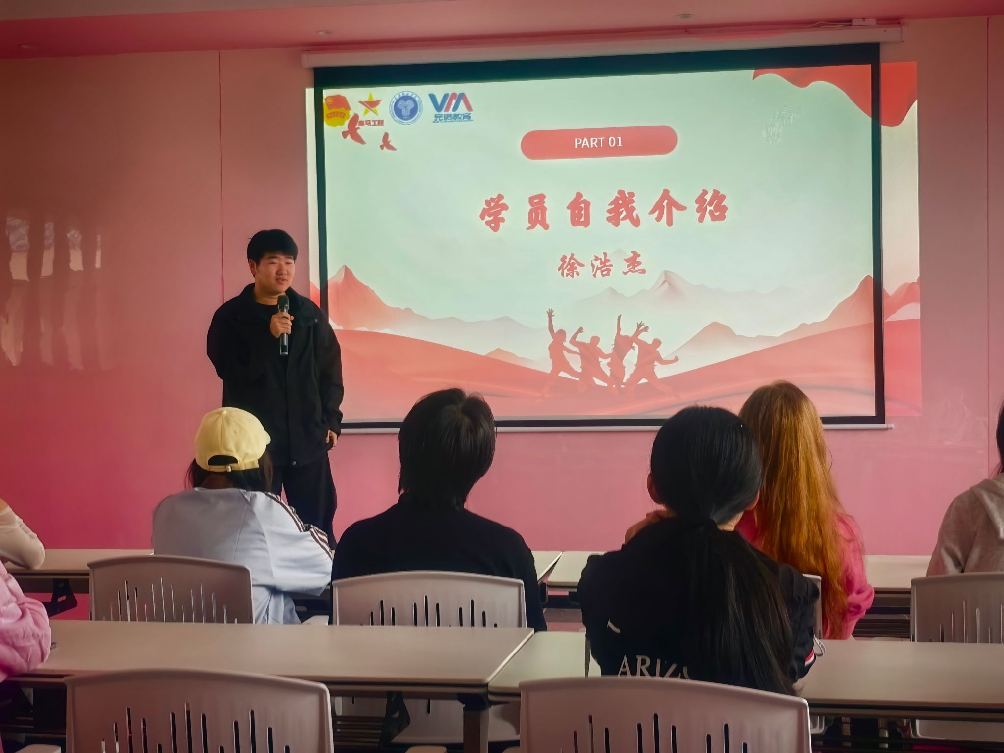 见面会伊始,班主任明洋舟上台对同学们的加入表示热烈欢迎。为让学员快速融入集体,班主任首先进行自我介绍,拉近与学员们的距离。在轻松温馨的氛围中,引导大家依次进行自我介绍——从所在学院到兴趣特长,再到加入青马完骨中阶一班的初心与期待,每一段分享都让彼此的陌生感逐渐消融,现场欢声笑语不断。有学员提及各类特色活动中的实践经历时,引发了大家的强烈共鸣,相似的成长轨迹让这个新集体迅速凝聚起情感纽带。