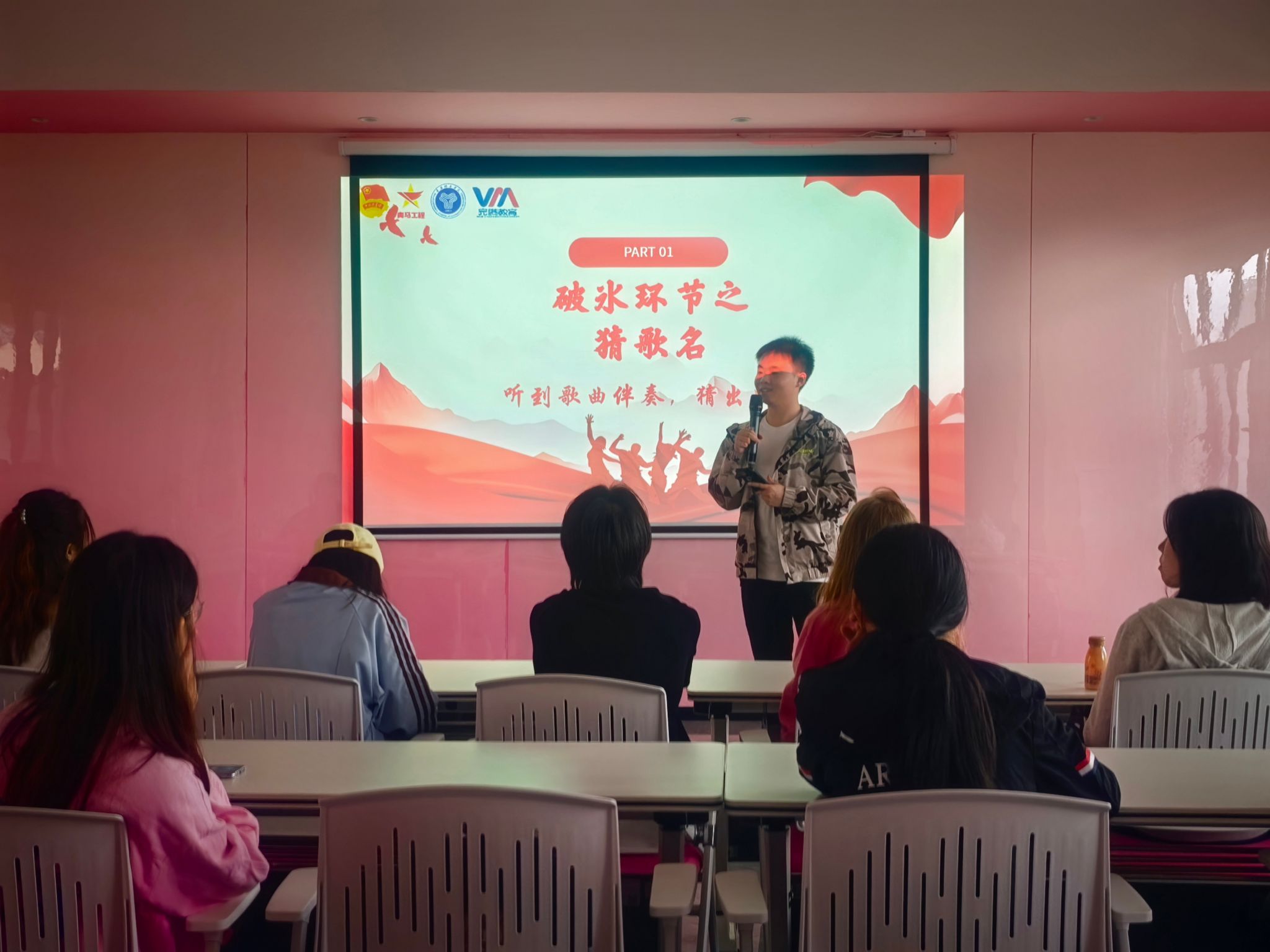 随后进行的“猜歌名”游戏同样精彩,现场循环播放经典流行歌曲的伴奏片段。学员们踊跃抢答,一听到前奏便立刻举手报出歌名,展现出极强的音乐敏感度;有几位学员因一时回忆卡顿急得轻拍桌面,可爱的反应引得全场哄笑。错答与秒答的反差萌、熟悉旋律带来的共鸣感,让大家在欢乐中进一步记住了彼此的性格特质。