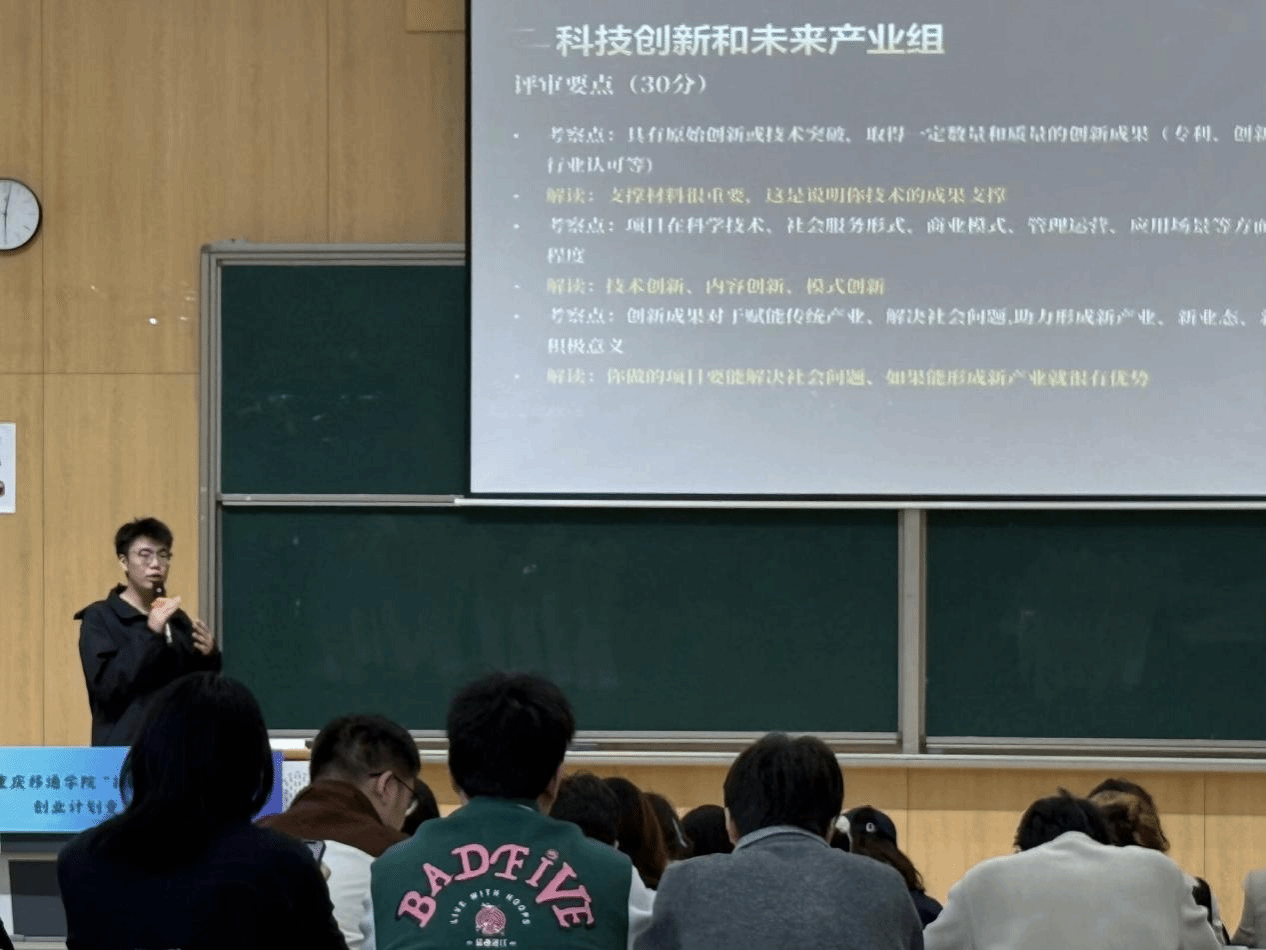 老师特意进行赛前引导,既肯定了同学们前期筹备的积极性,也清晰传递出对大家的期望。老师提到:“希望大家能在路演中展现出项目的创新价值与团队的思考深度,更期待你们能通过这次模拟,发现不足、积累经验,为后续正式参赛打下坚实基础。”这番话让台下同学们精神愈发集中,原本略带紧张的神情逐渐转变为坚定。