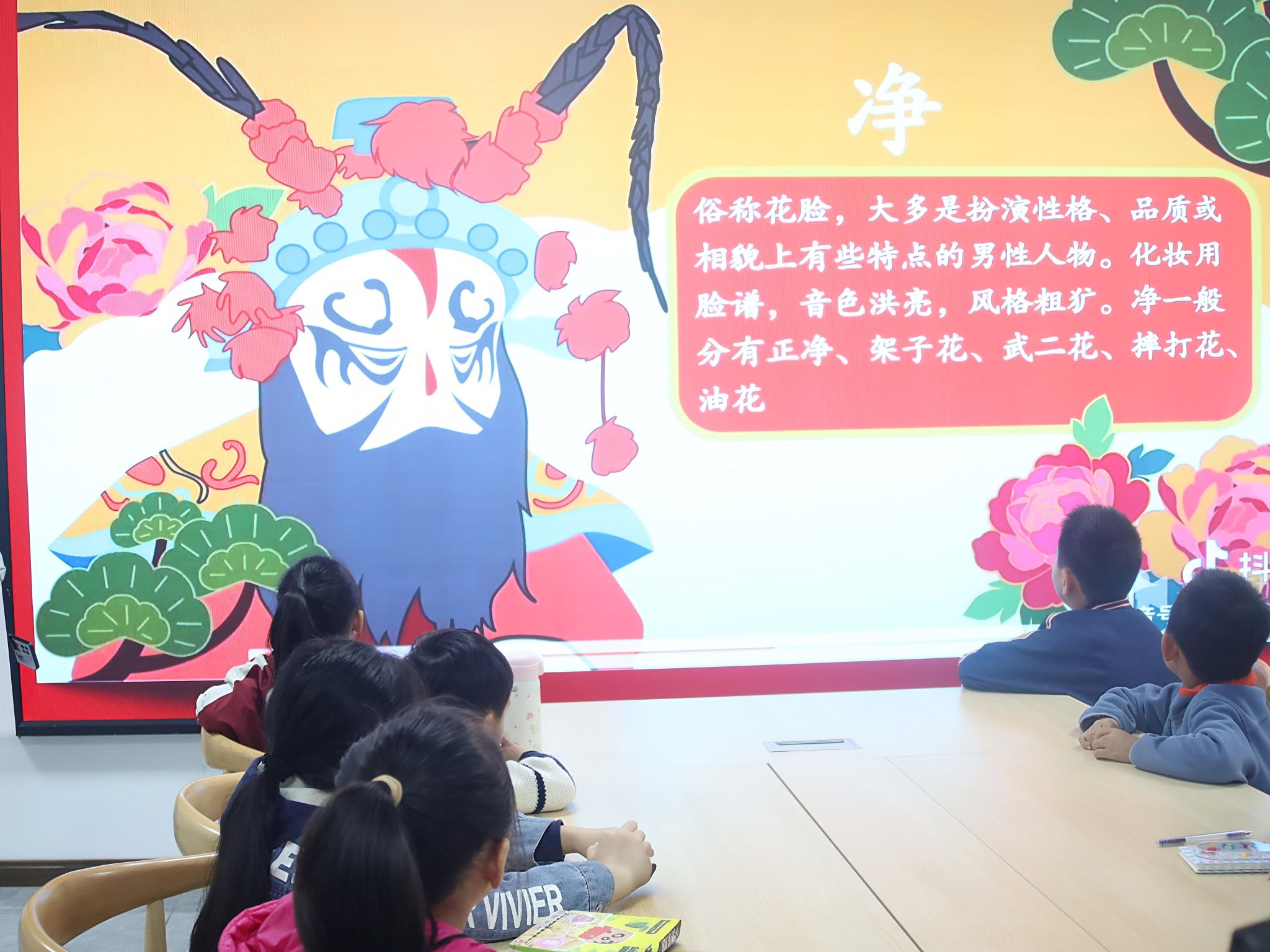 脸谱纹样配对小游戏将活动氛围推向小高潮。主持人通过PPT呈现日托月纹、眉纹等脸谱纹样图,而右侧则是打乱顺序的“光明磊落”“聪明过人”等寓意标签。孩子们纷纷举手抢答,现场互动频频,随后主持人逐一对纹样与寓意进行深度讲解,在游戏中轻松记住传统纹样的文化密码。