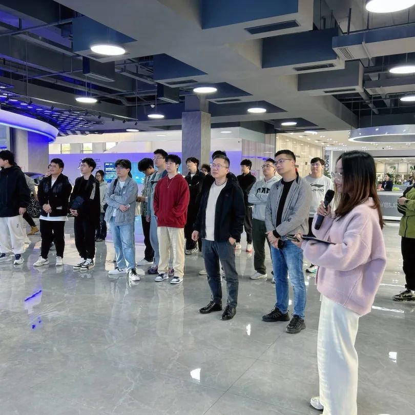 在长安科技园专业讲解员的引导下,师生依次参观了企业历史文化展厅、核心科技展区与智能汽车展馆。通过影像资料、实物模型及互动装置,同学们深入了解汽车工业百年脉动。从1862年上海洋炮局的工业火种,到新时代"香格里拉计划"的新能源蓝图;从蓝鲸动力平台的技术突破,到L4级自动驾驶的智慧跃迁。全息沙盘动态演绎"新四化"转型轨迹,数字孪生技术还原整车开发全流程,让课本中的工业4.0概念在智能总装线上生动呈现。