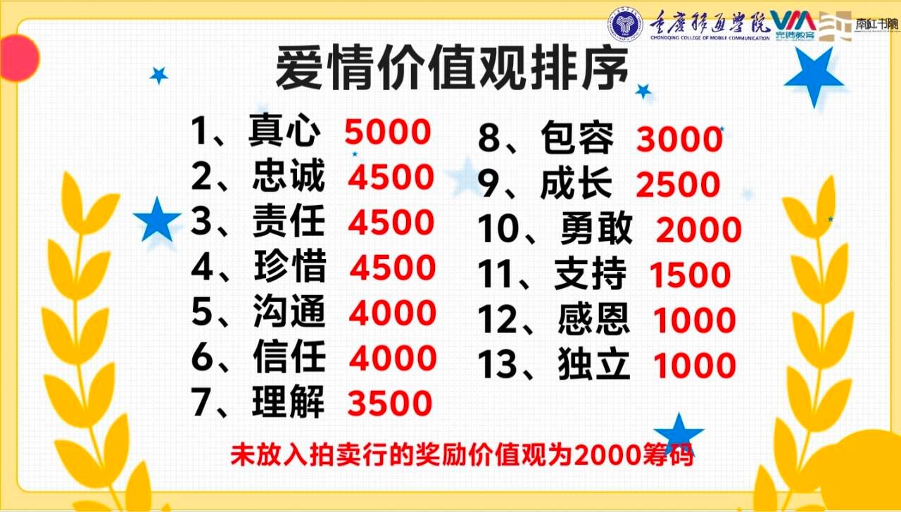 活动焦点——爱情价值观拍卖会。依托线上“爱情观指数”投票,学子们怀着“今日势必拿下最佳爱情观”的决心,摄像头此刻正记录着“第一次”、“第二次”喊声的彼伏。爱情价值观由多重不同价值观交织而成——真心、忠诚、责任与珍惜以构筑爱的基石,独立、感恩则为爱增添色彩;“爱”寓意着坚守与珍视,是独立个体在尊重中共同成长的必修课题。活动中通过量化实际数据的方式,直观呈现着学子们对它们的独特诠释。