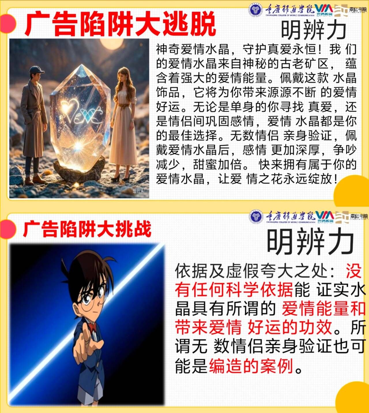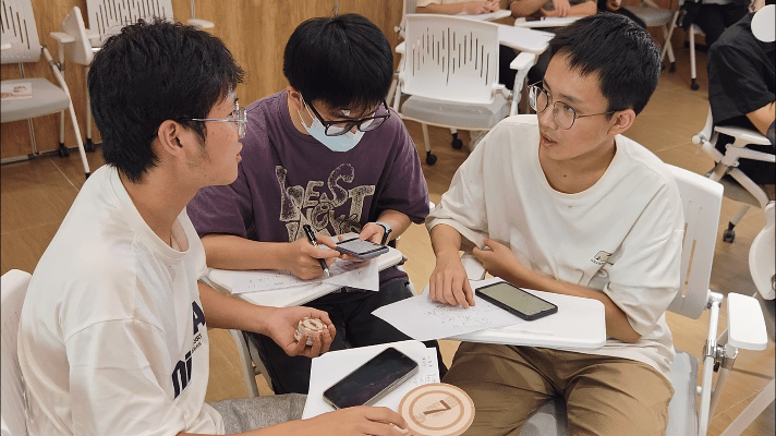 学子们需“识夸张、辨真伪”以找出“爱的广告”文案中的不实之处,并提出“理与据”的质疑。神秘谜题以“思考之力”牢牢锁住众人的目光,学子们在一起,就像火柴遇到火星,智慧的点子在讨论中“噌噌”往外冒。
