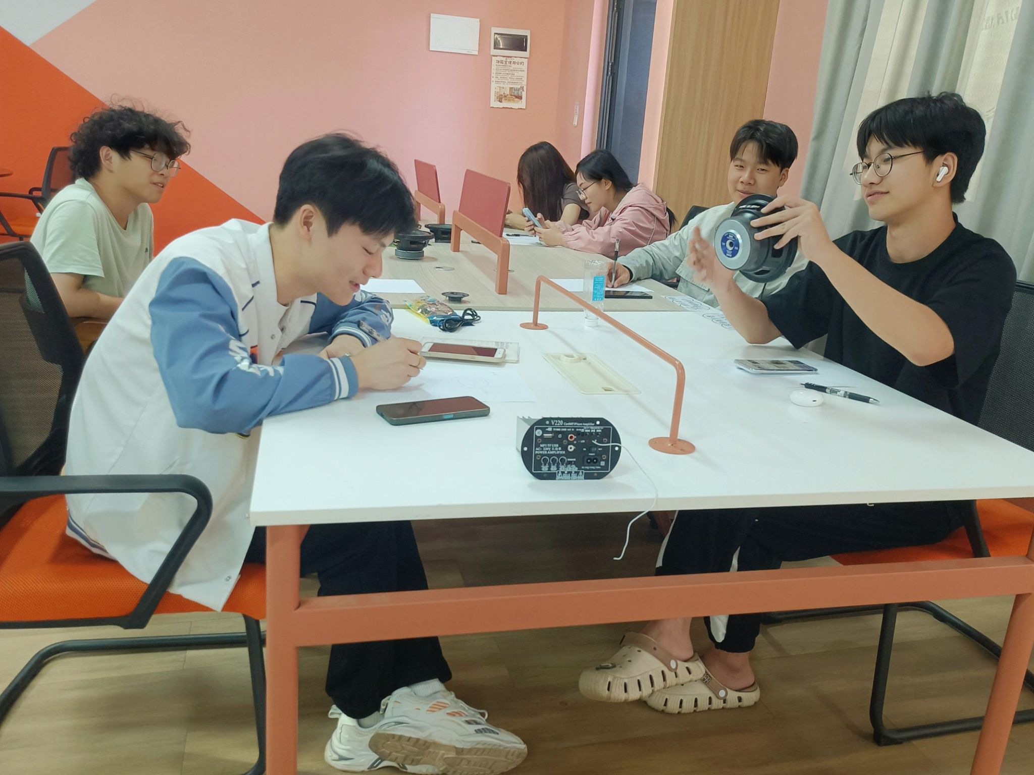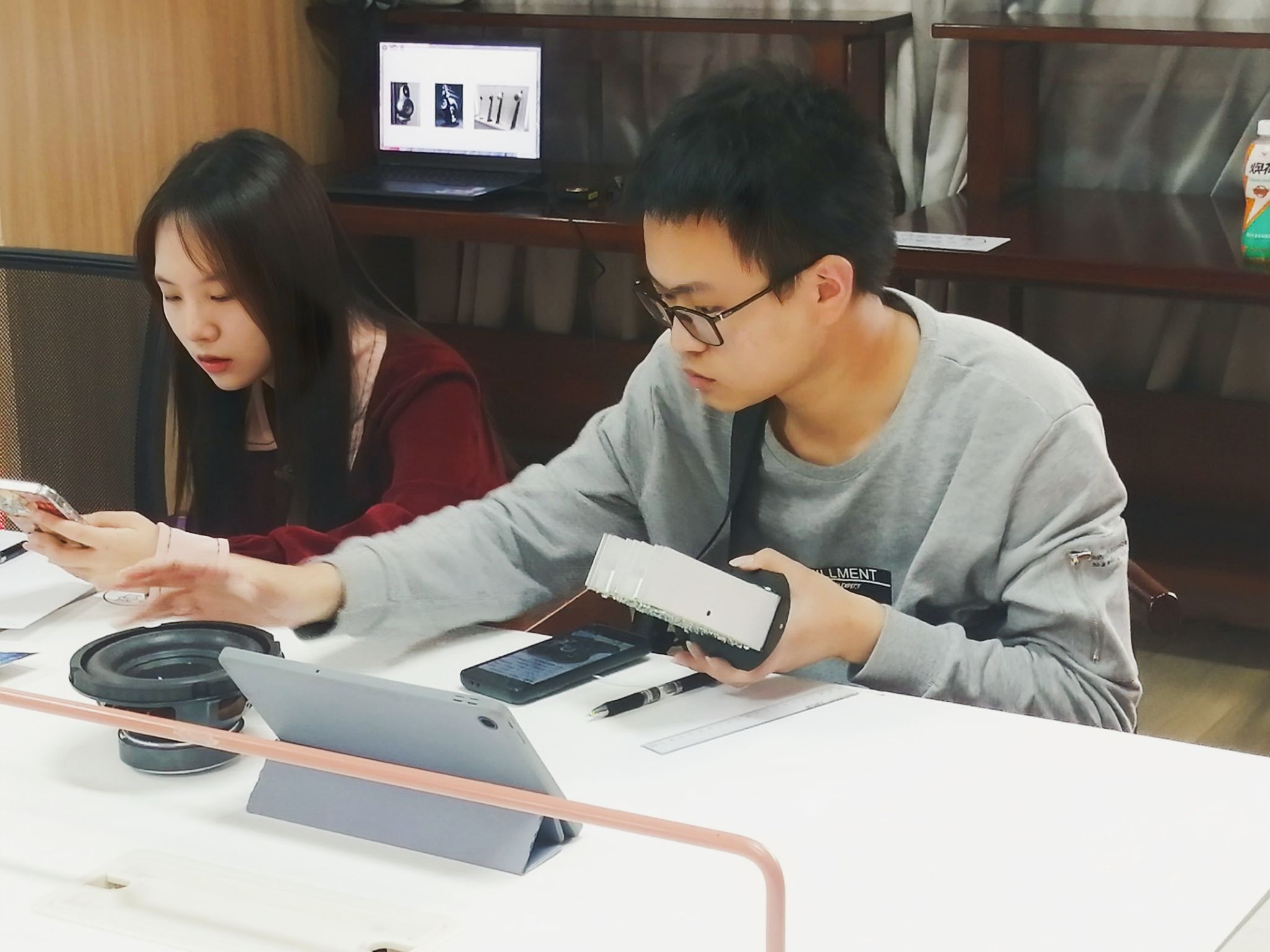 在廖老师的指导下,“音响设计师”们开始进行音响外观的设计。大家亲自测量组件的尺寸,灵感在小组间碰撞与融合,创造出属于小组独一无二的音响作品。