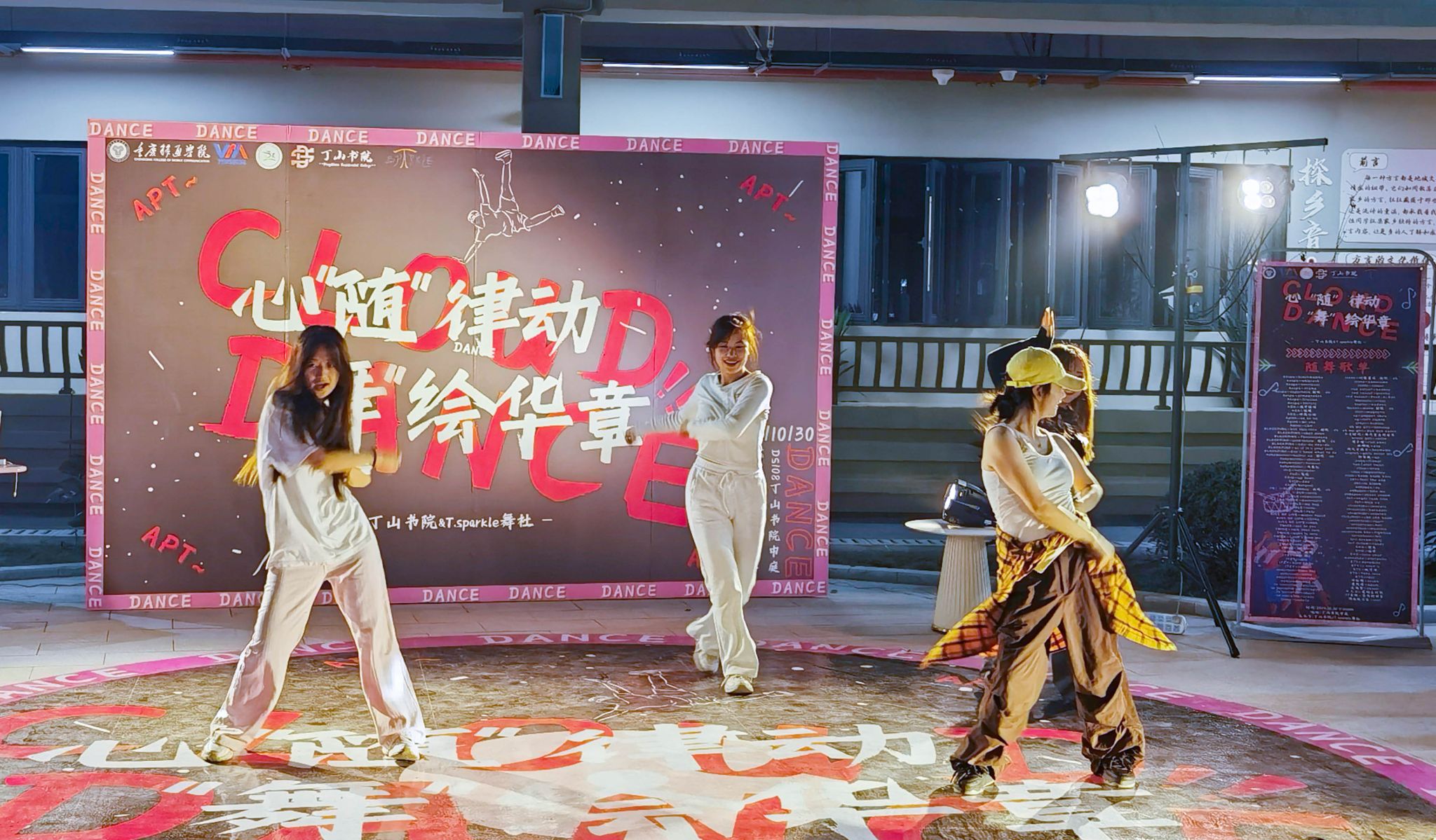 为促进社区共享理念,打破传统校园界限,构建更加紧密、多元的学习与生活社群。丁山书院携手T.sparkle舞社于10月30日在丁山书院中庭开展了一场别具一格的舞蹈盛宴——“书院一小时”“心‘随’律动,‘舞’绘华章”随舞活动。以书院为平台,随舞为载体,为校园文化建设增添一条亮丽的风景线。