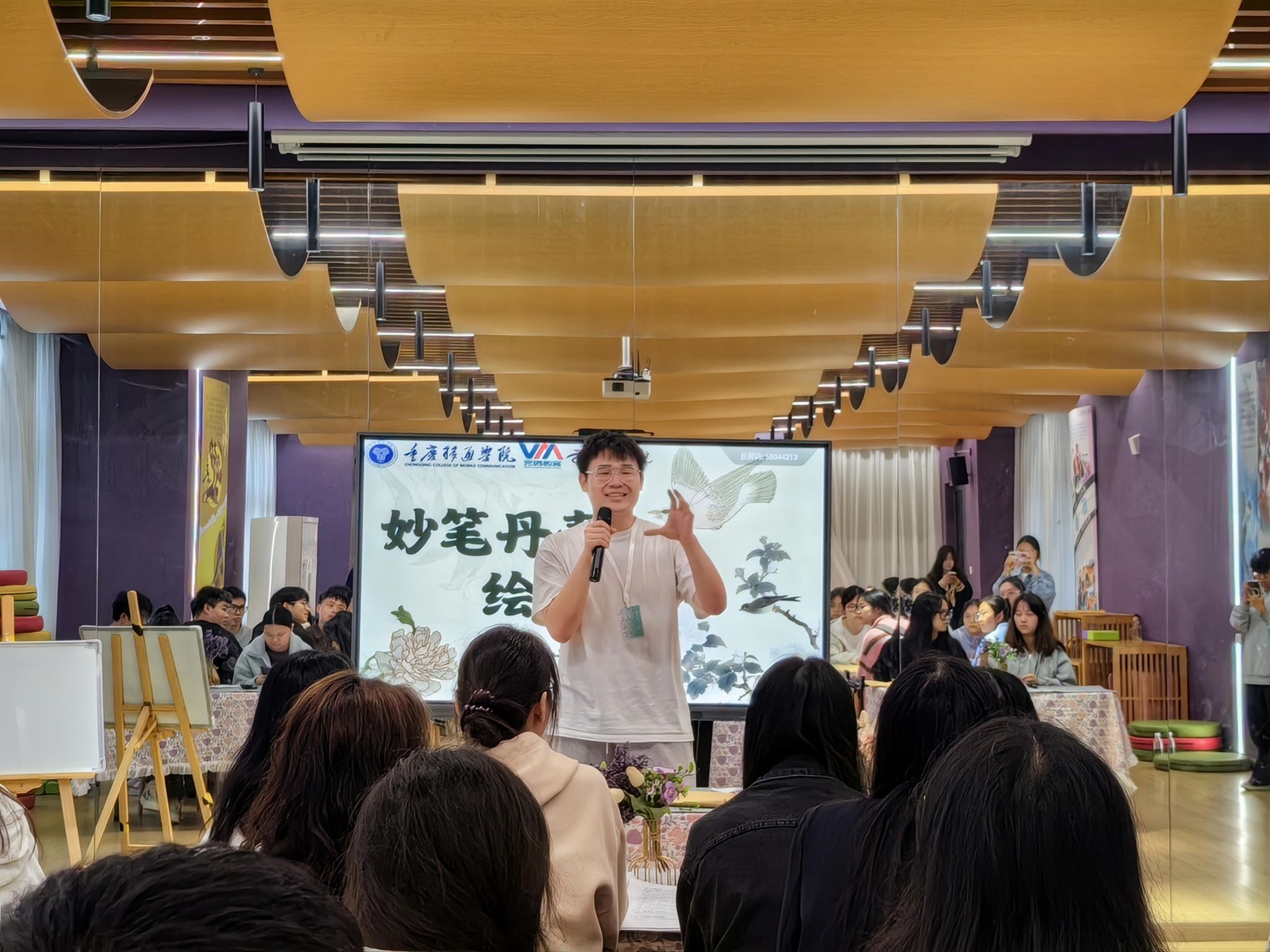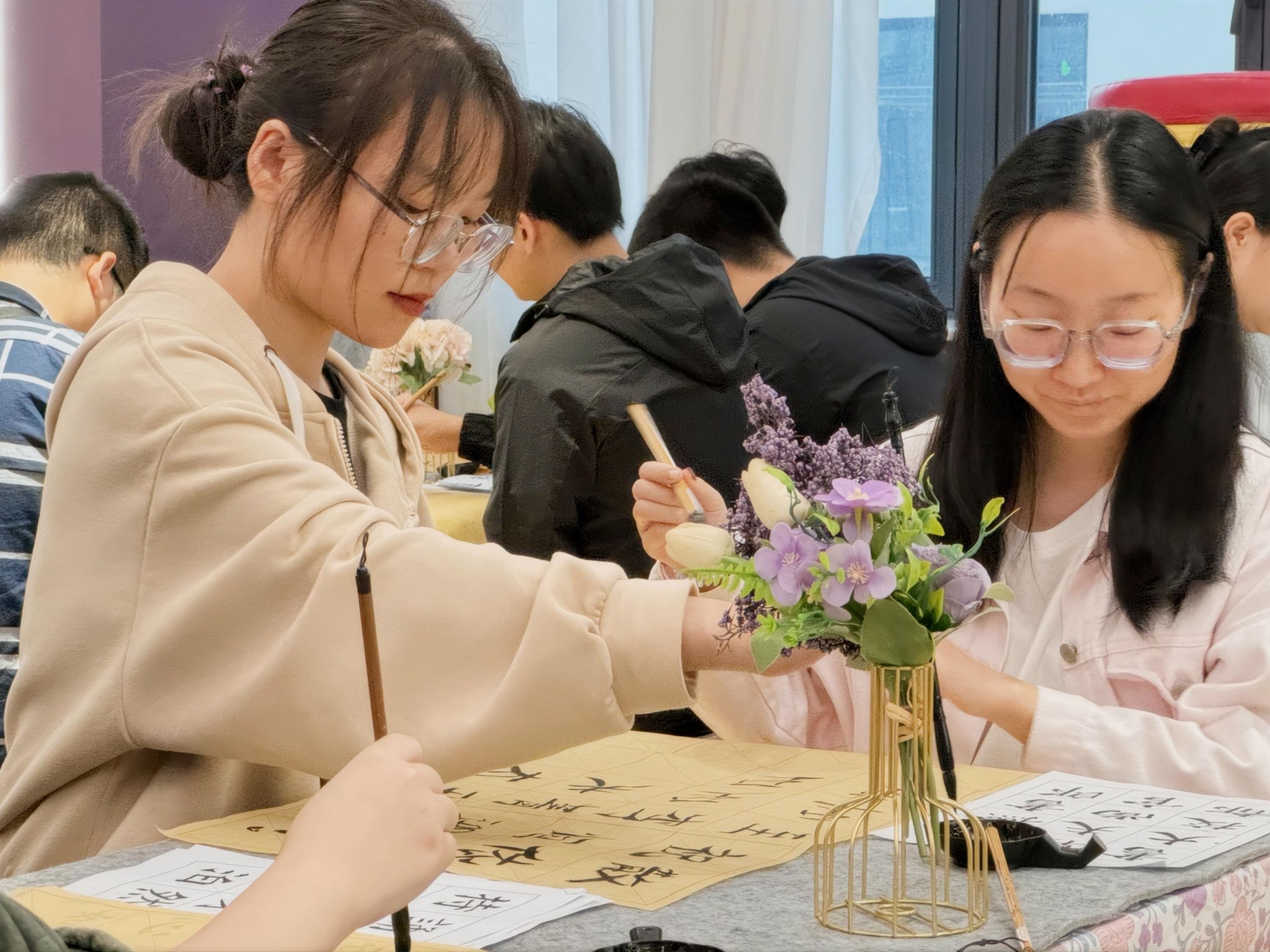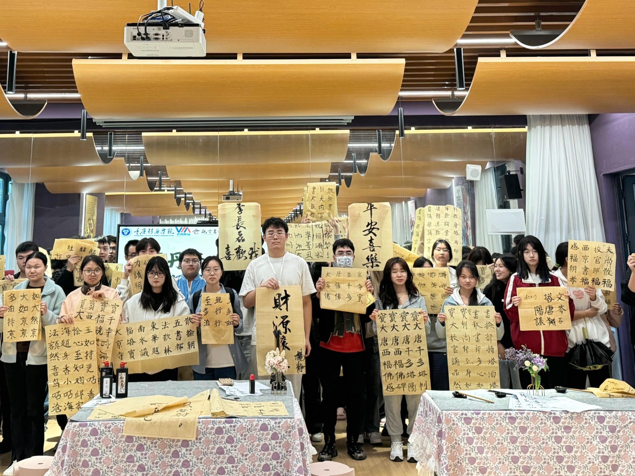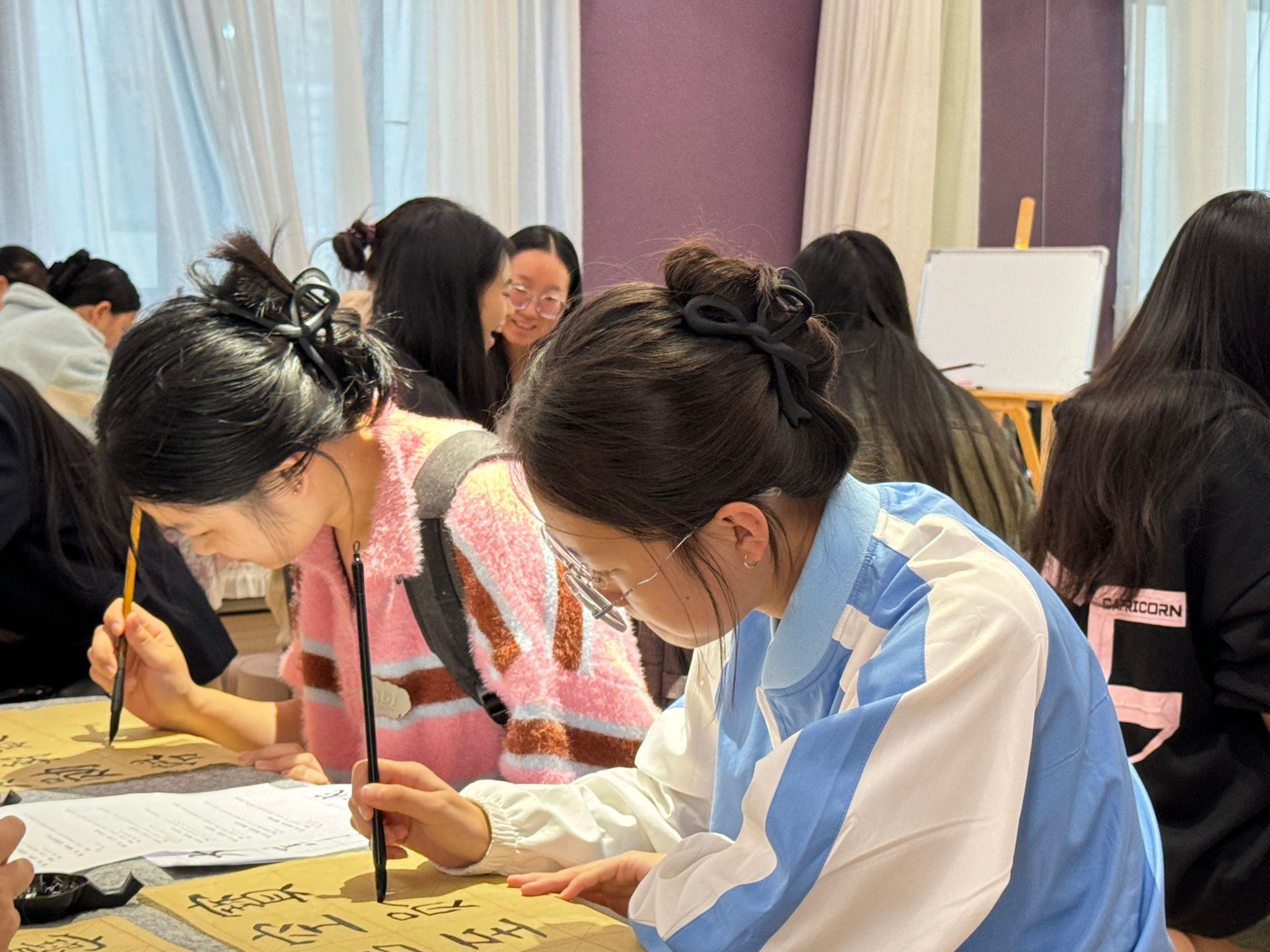 研墨、挥毫,当墨线出现在纸张上,开合疏朗,荡出笔锋,同学们就开始与颜真卿笔会。为弘扬国粹之美,给同学们提供一个感受书法艺术魅力的平台,观云书院联合青花墨字书画社,于11月1日在观云书院GY106夏至·排练厅,成功举办“妙笔丹青绘古今——书法体验课第8期”活动,本期活动以“颜体结构掌握”为主题。