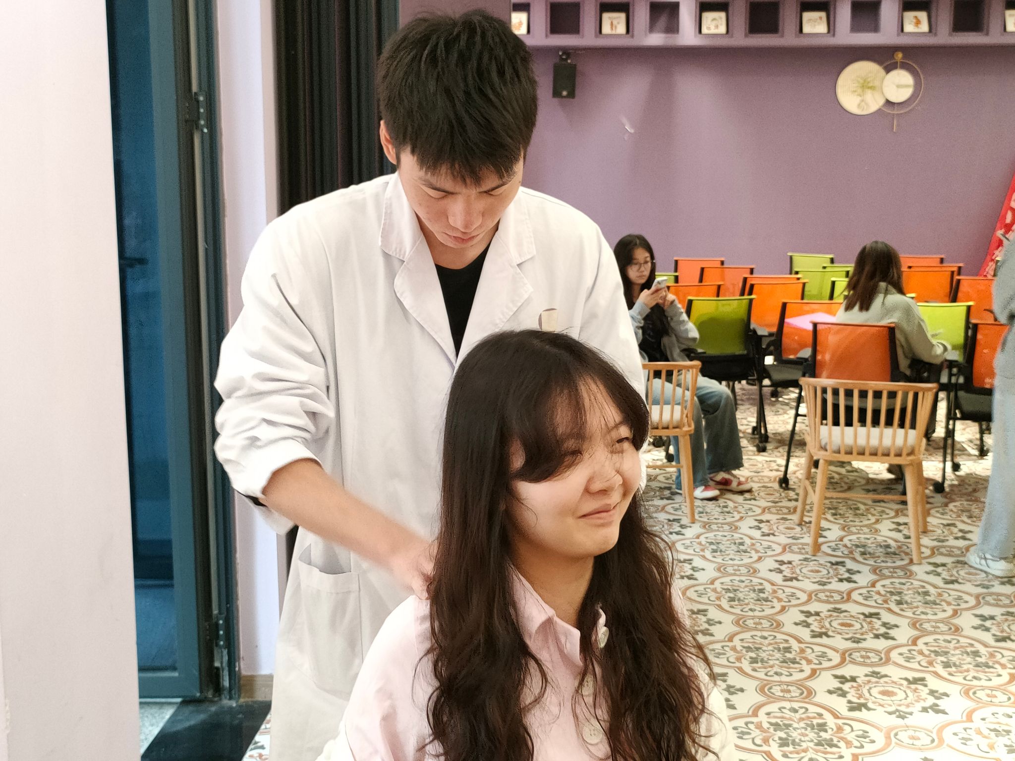 在这里,同学们整齐地排成一列,面对银针略有胆怯。中医们手法精准,银针如丝,轻轻刺入体验者脖颈、手腕、手指等部位的穴位。随着银针的深入,体验者的神情从紧张转为放松,享受着银针带来的奇妙变化。这不仅是一场身体的体验,更是一次心灵的洗礼,让同学们深刻感受到了中医的博大精深。