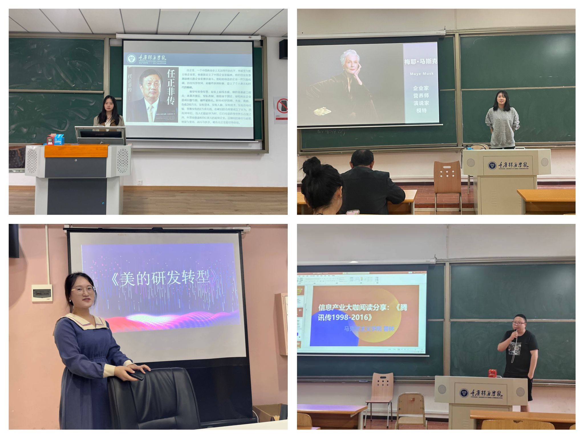 数字经济与信息管理学院(綦江校区)为陶冶学生们的高尚情操和趣味,数字经济与信息管理学院于10月开展了“红色印记·智慧启航”大咖阅读交流会主题活动及“阅读大咖传记,探索财富奥秘”——信息产业大咖传记阅读分享会人物系列之特斯拉专场、“以书会友,智启未来”信息产业大咖传记阅读分享会人物系列之马云专场,创新性地采用“击鼓传花”趣味游戏与“你心目中的特斯拉”趣味绘画的方式加深同学们对大咖特斯拉的了解,希望同学们从大咖的传奇故事中汲取人生智慧并成为有责任有担当的新时代青年。马克思主义学院(合川校区)10月10日,形势与政策教研室、中国近代史纲要教研室的老师组织举办了以“阅读启迪智慧,大咖共话书香”为主题的大咖阅读分享活动,共计开展信息产业大咖系列活动4次,覆盖师生300余人次。