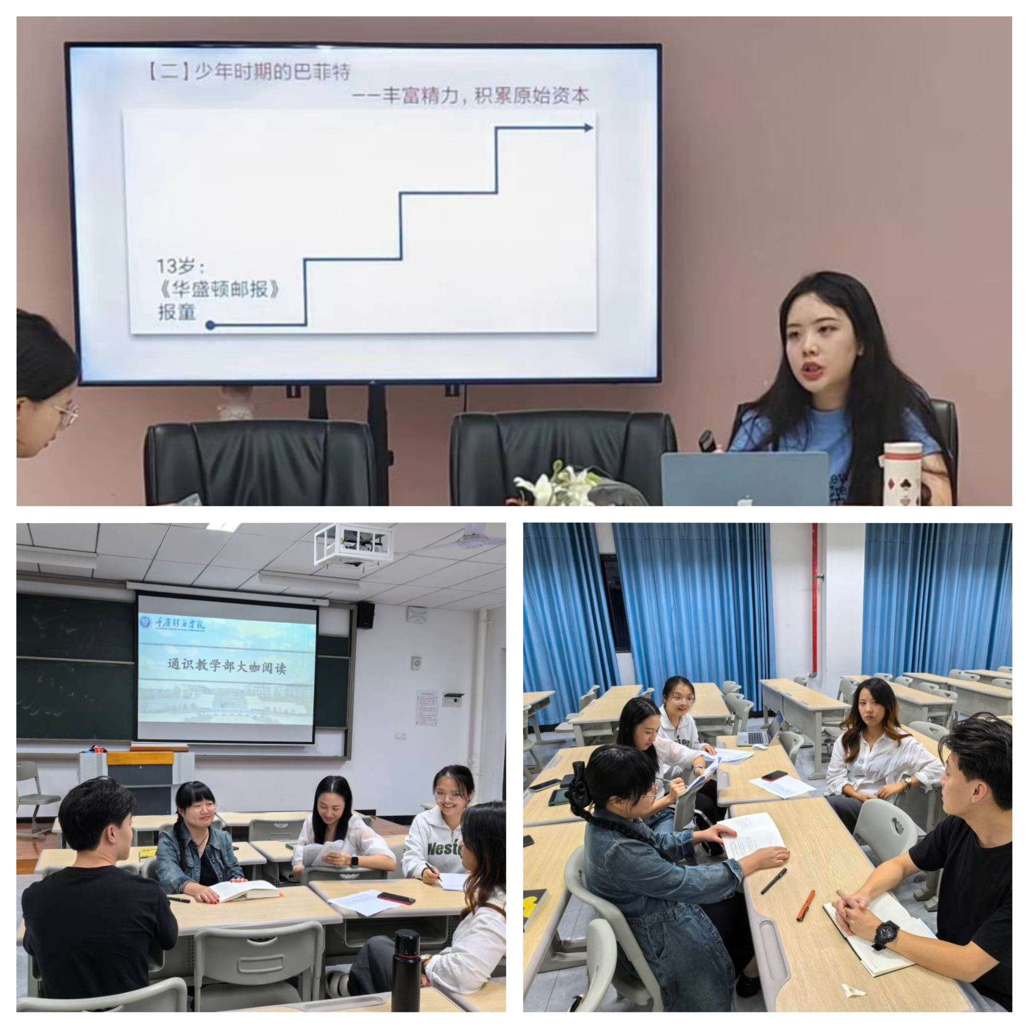 通识教学部(綦江校区)教师共同阅读并探讨了《董明珠与格力》和《俞敏洪与新东方》两部重量级企业家传记,并在阅读分享环节围绕“企业家精神与通识教育”这一主题展开了热烈的讨论。通识教学部(合川校区)为了培养学生的批判性思维,激发其创业精神和创新能力,通识教学部联合别都书院在别都书院多功能研讨室举办了一场以《巴菲特传》为主题的大咖传记阅读分享活动。