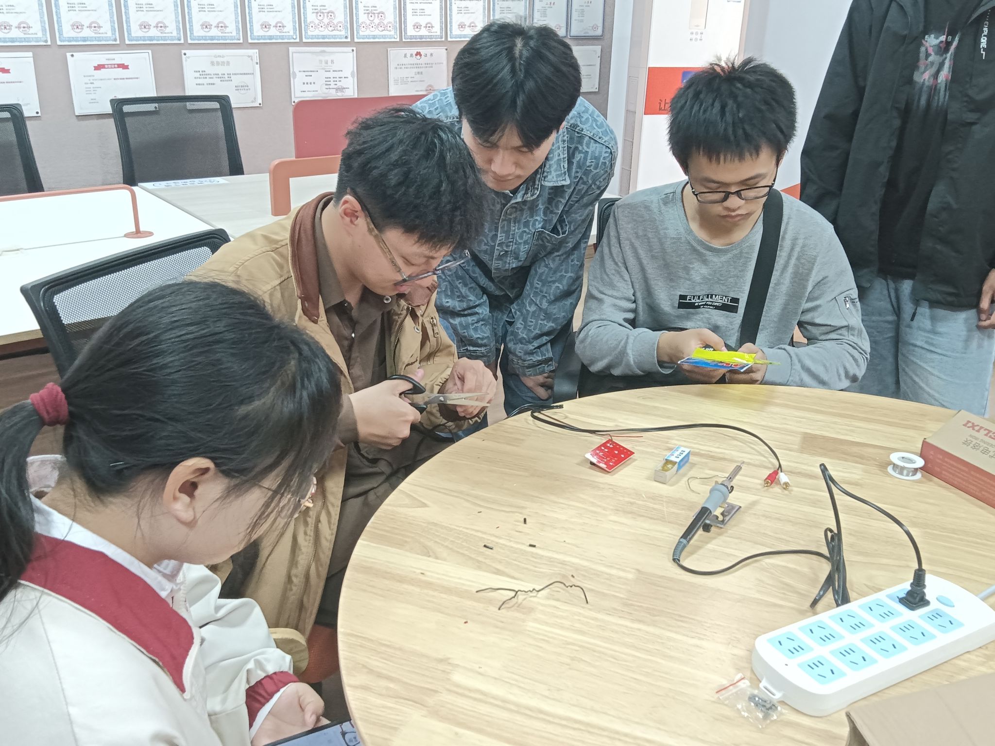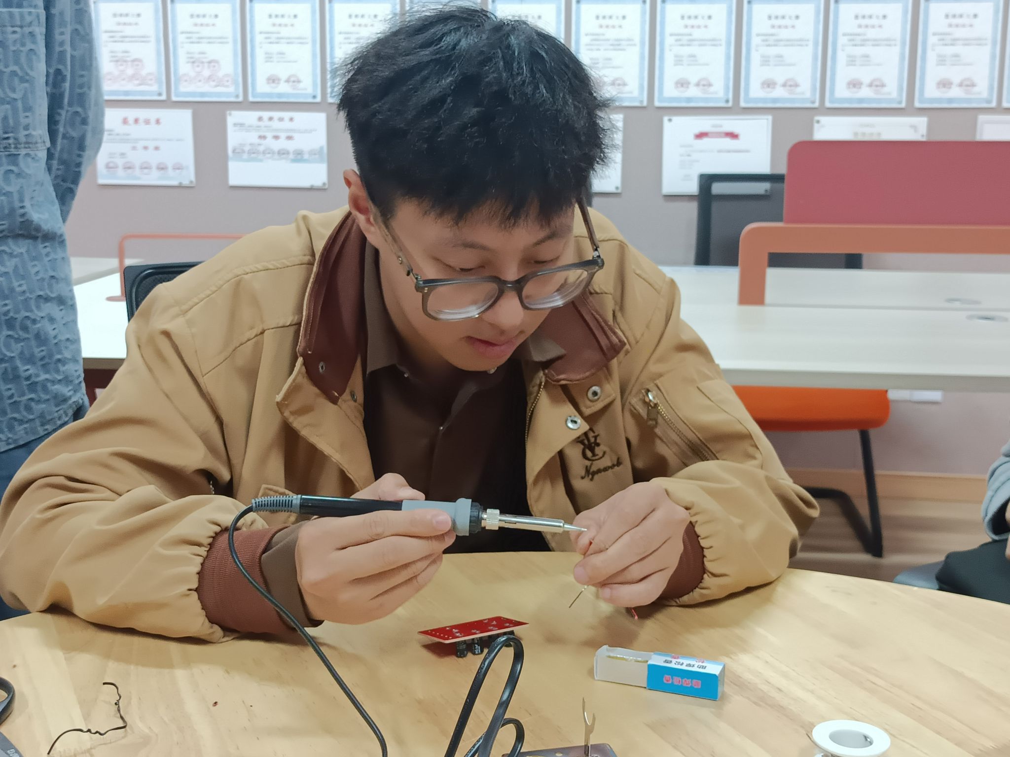 焊接过程中,廖老师将锡丝比作胶,形象地解释了锡丝在焊接中起到连接的作用。预热后的电烙铁凭借220度的高温将锡丝熔掉并快速覆在铜丝上,再与电路板拼接。熔化后的锡将铜线包裹在板子的接口处,冷却后又成了坚硬的锡块,让铜线牢牢固定在电路板上。焊接过程中,廖老师边操作边讲解,同学们也积极提问,现场教学氛围良好。
