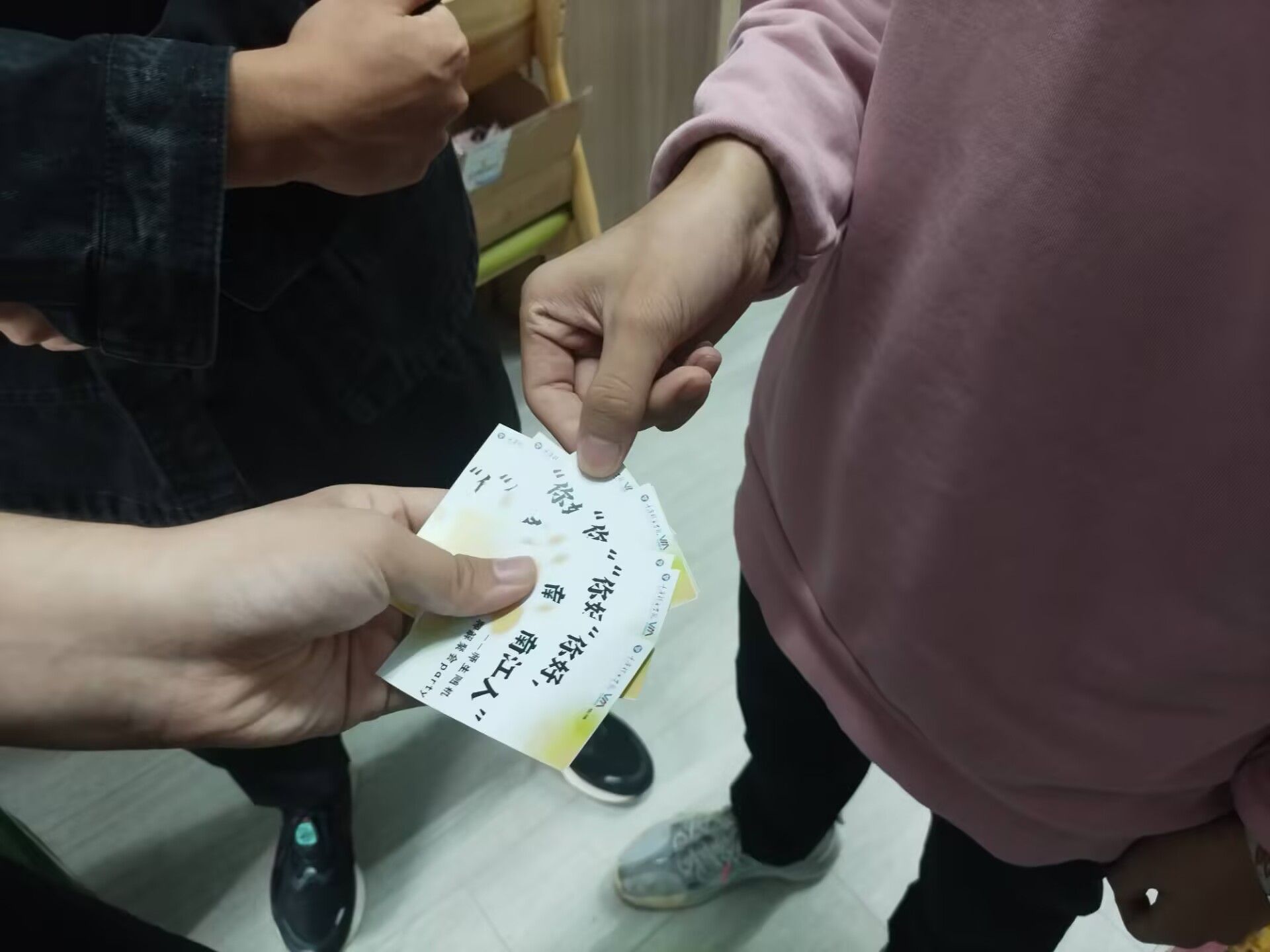 活动前夕,书院导师刘雯走近南江书院寝室,诚挚邀请M101的五位南江人参加“你好,南江人”师生随机聊解聚会。本次活动采用抽签的方式决定活动形式(师生共同完成的十件小事),增添了未知与惊喜,让每位参与者都能在活动中寻找属于自己的舞台。这份特别的安排,不仅加强了师生间的情感纽带,更促进了心灵深处的共鸣,共同书写属于南江书院的精彩篇章。