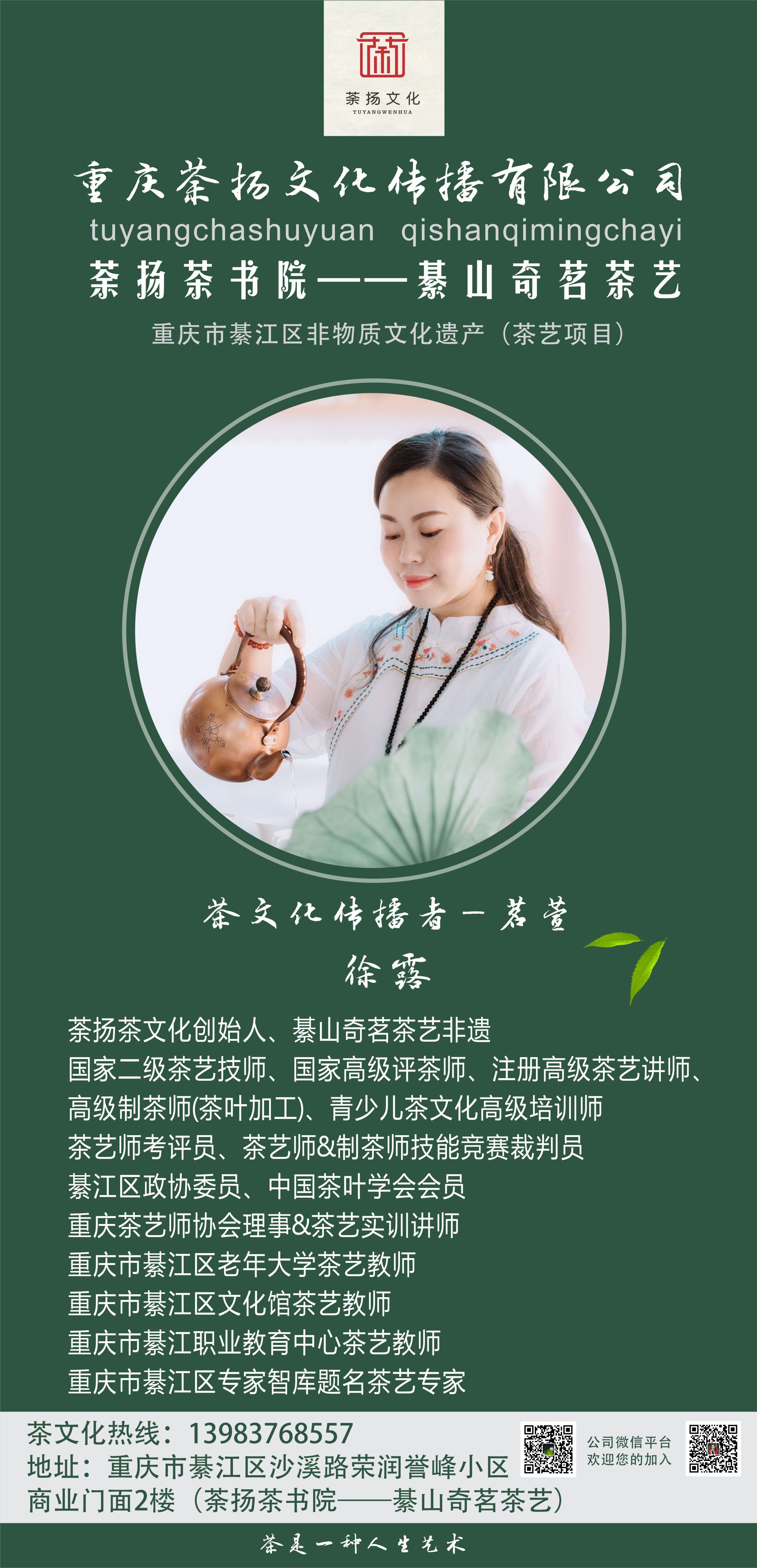 徐露,綦山奇茗茶艺非遗传承人、国家二级茶艺技师、国家高级评茶师、注册高级茶艺讲师、高级制茶师(茶叶加工)、青少儿茶文化高级培训师,茶艺师考评员、茶艺师&制茶师技能竞赛裁判员,綦江区政协委员、中国茶叶学会会员,重庆茶艺师协会理事&茶艺实训讲师,重庆市綦江区老年大学茶艺教师,重庆市綦江区文化馆茶艺教师,重庆市綦江职业教育中心茶艺教师,重庆市綦江区专家智库题名茶艺专家。拥有资深的茶艺教学经历,在重庆市内多所校园开展过茶文化传播的相关课程,同事一直致力于传播中国茶文化的事业。