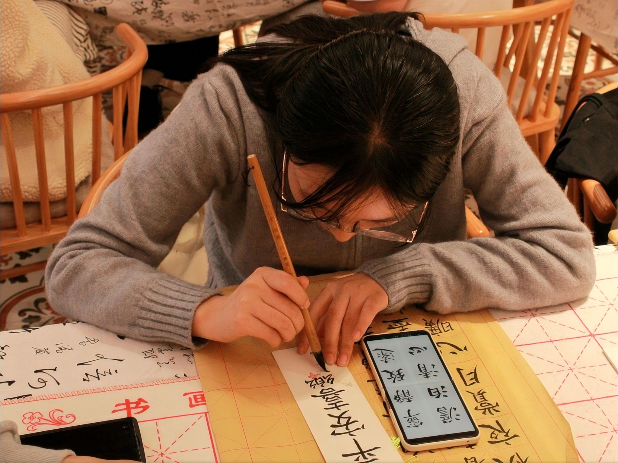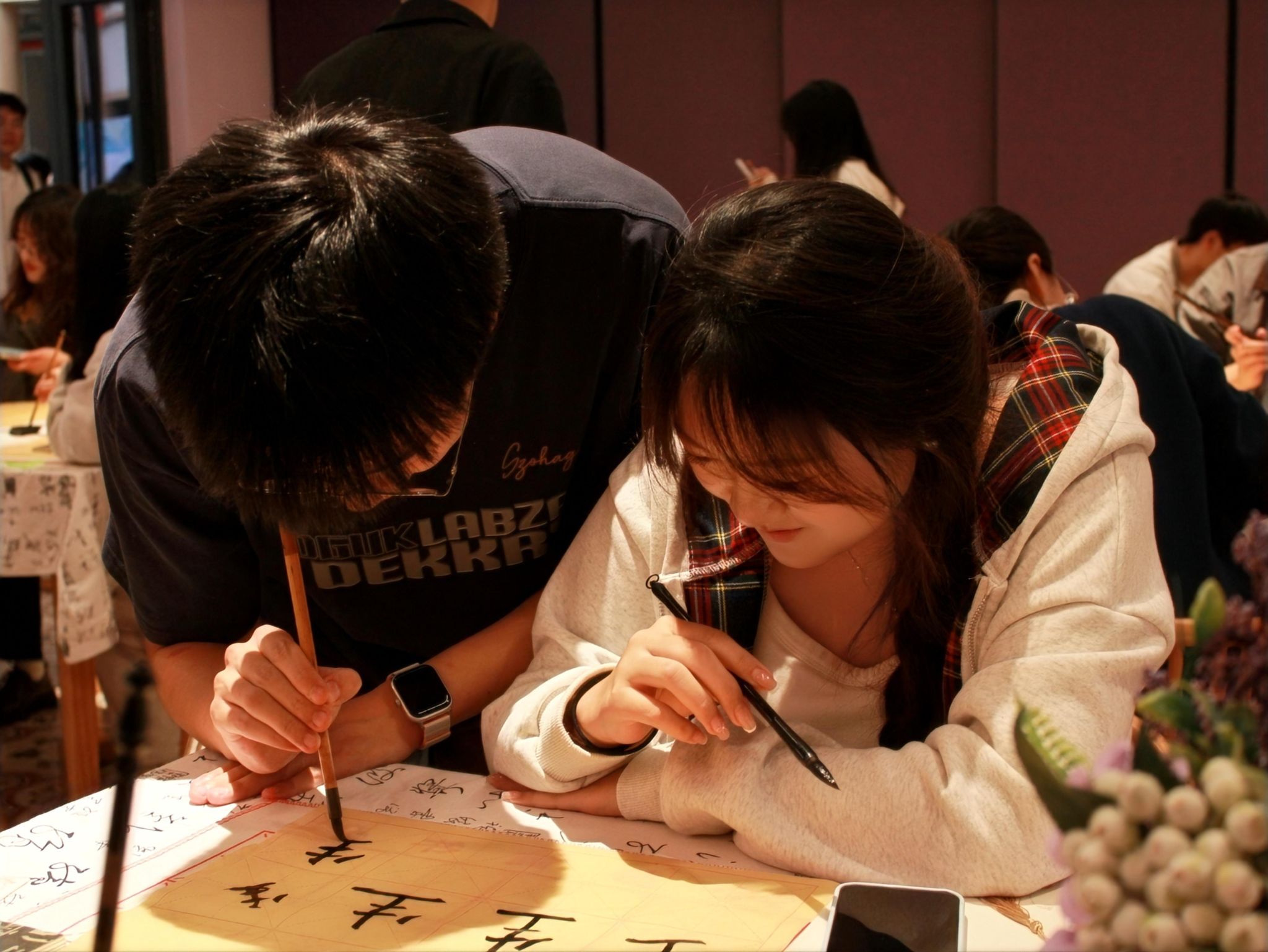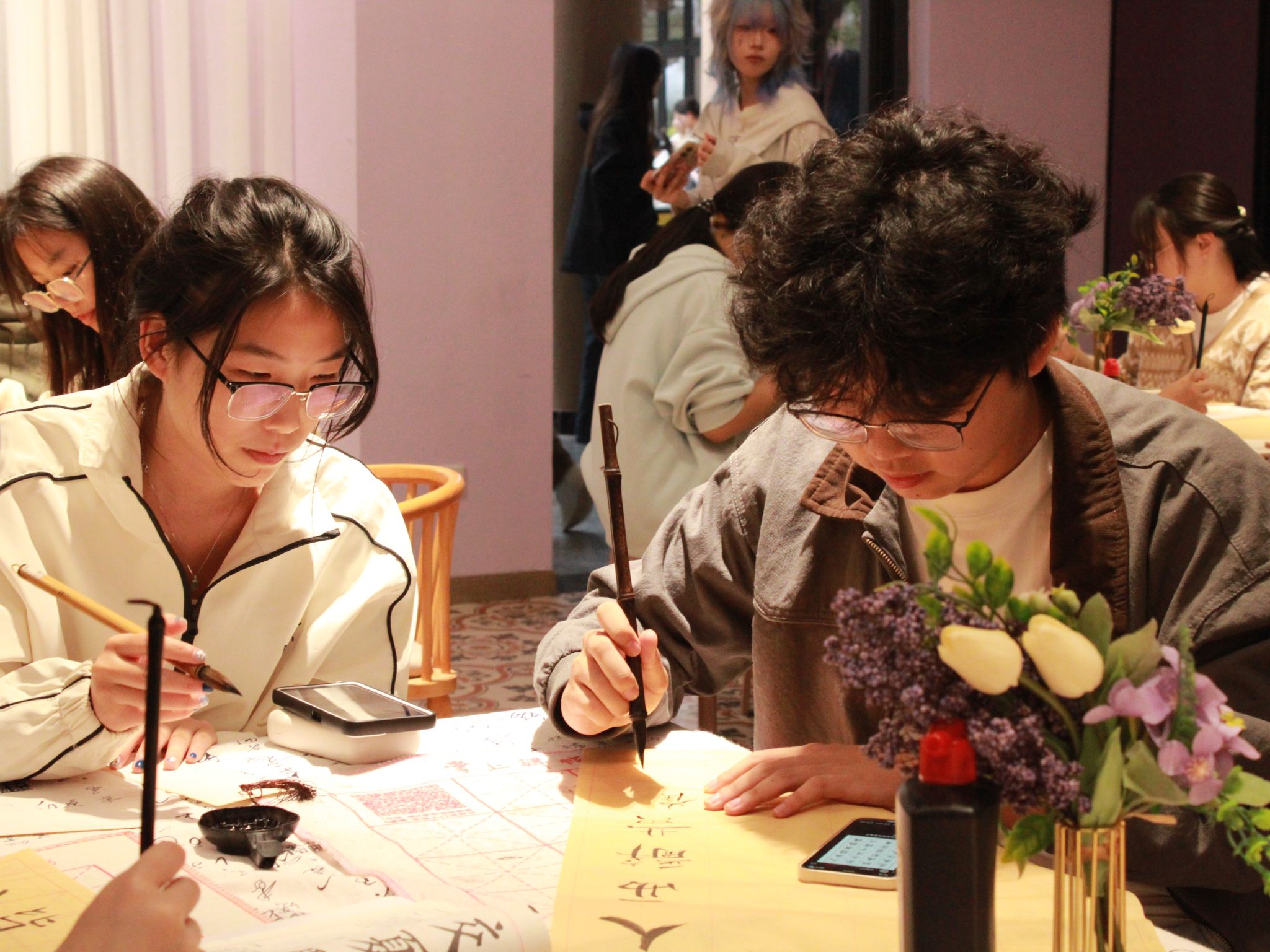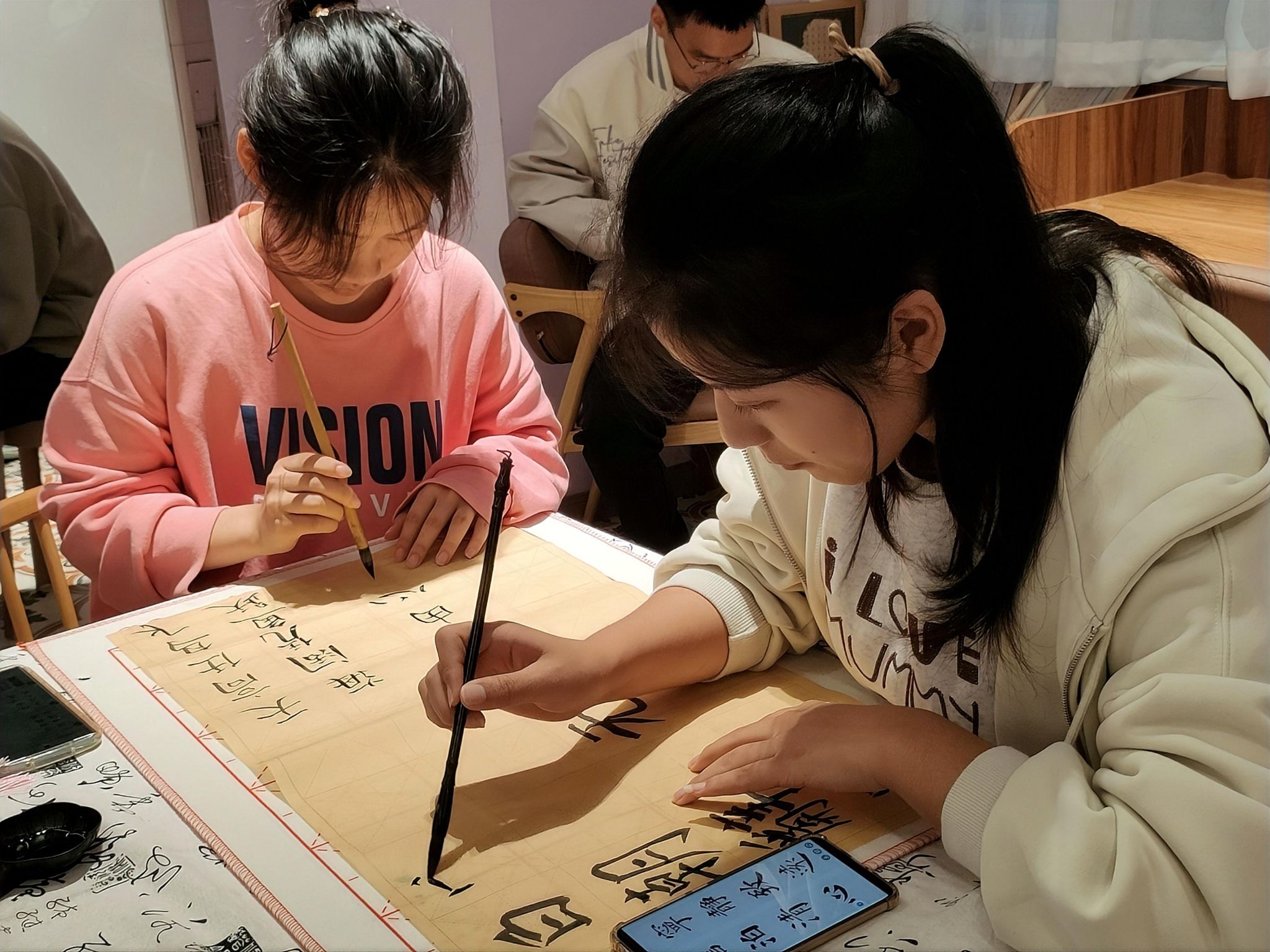 同学们轻蘸墨汁,宛如与古人对话般用心书写,力量与优雅的交织,刚直与敦厚的融合,尽显颜体书法之真谛。在这一方小小的天地里,一个个墨字仿若精灵般从纸上跃然而出,带着古人的智慧与今人的热情,在空间中舞动。