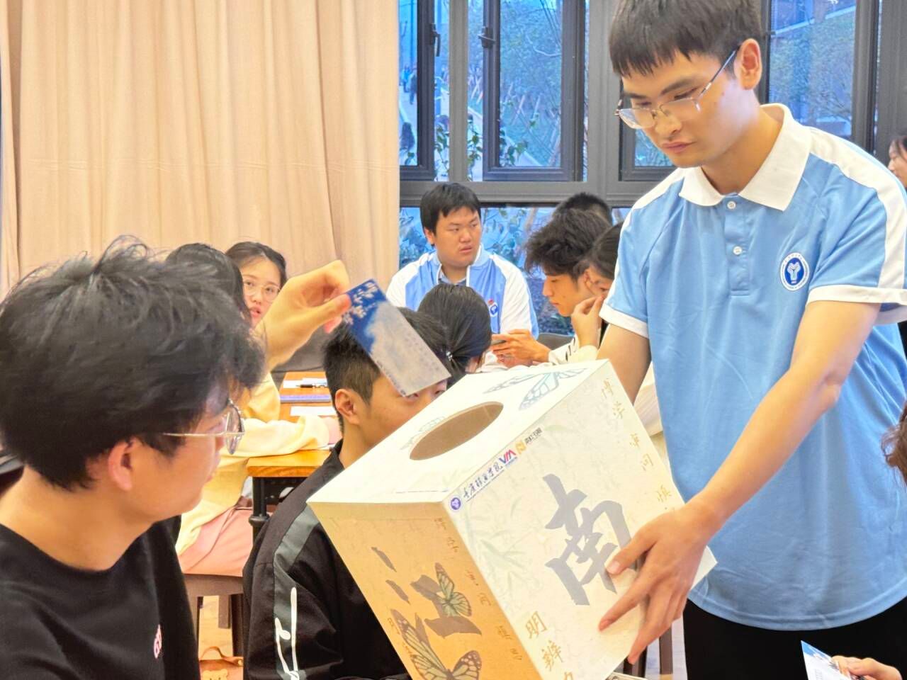 《解忧杂货店》讲述的是一家废弃杂货店连接不同时空,小偷三人组在此收到过去咨询信,他们凭借对历史的了解回信,改变咨询者命运的故事。活动中,学子们匿名写下他们的“烦恼”,将其投至解忧信箱中,而那一个个充满爱与希望的故事,也正悄然落入“天使”怀中。