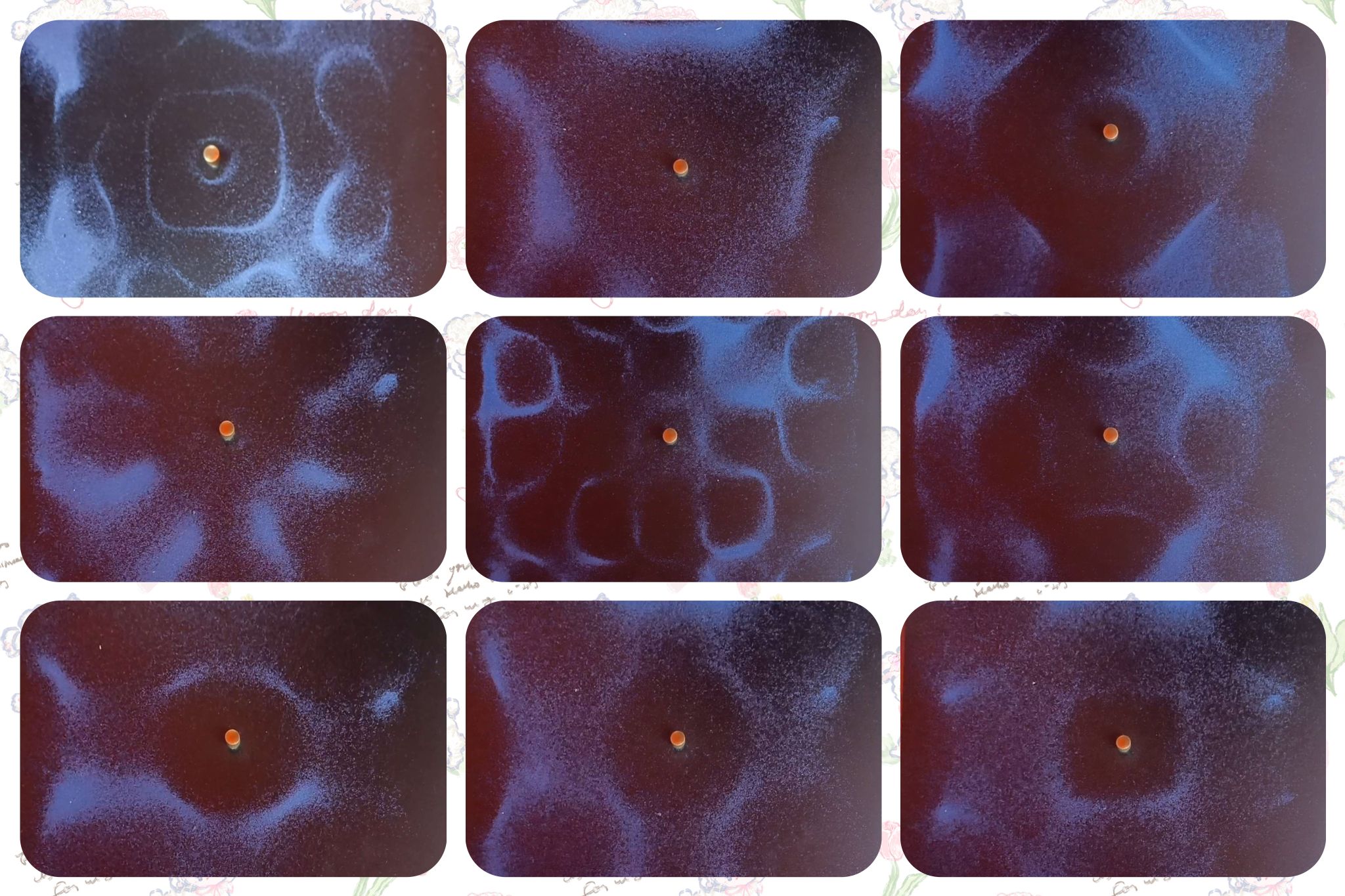 在古剑书院的功能室里,声音仿佛被施上了“魔法”,克拉尼装置上的沙粒随着声音的频率波动展现出千变万化的形态。这一幕让在场的所有人惊叹不已,原来发声不仅仅是产生振动那么简单,不同的声音、不同的音调,竟能勾勒出如此丰富多样的图案,继续探索声音形态的无限可能。