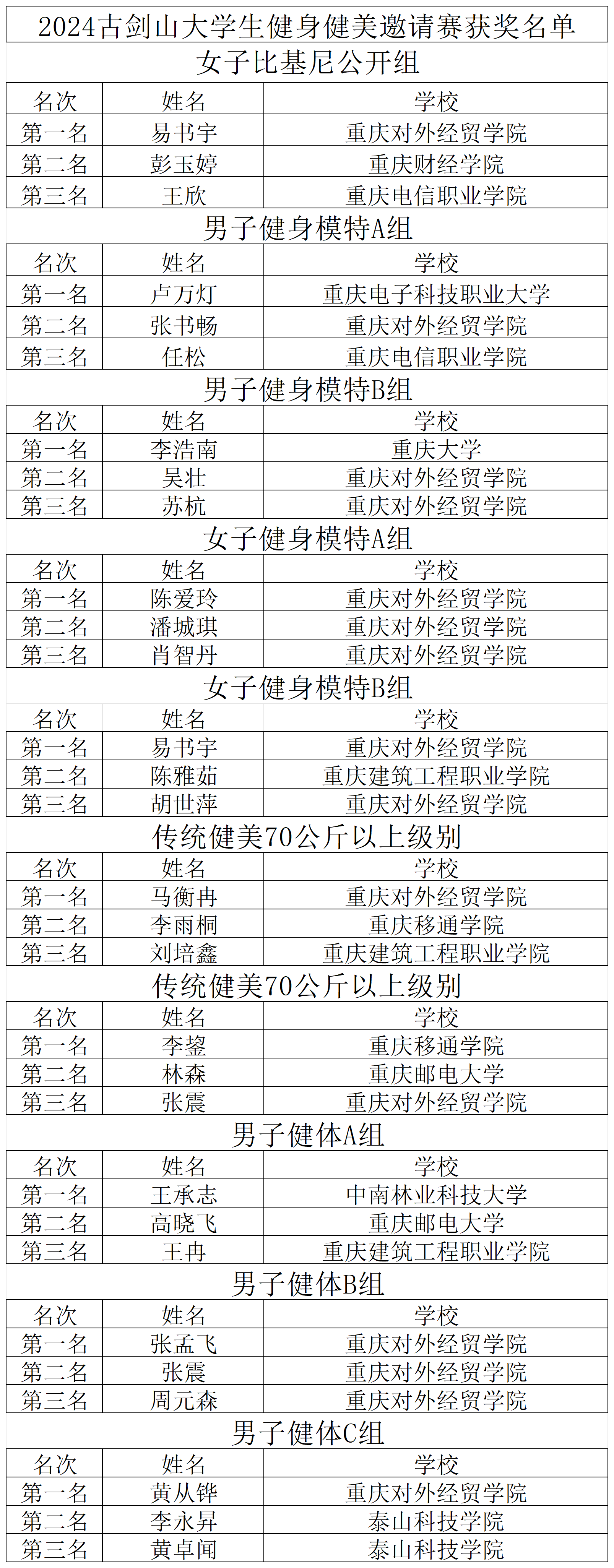 本届大赛以“焕发青年力量”为主题,深入践行“更高 更快 更强 更团结的”体育运动精神,希望每位运动员都能一展大学生的青春活力,呈现个人的健身成果,绽放自己的青春光彩。此次大赛不仅是对健美成果的精彩展示,亦是对青春力量的礼赞,来自不同国籍、不同地域、不同学校的青年因为共同的热爱来到了本次大赛,青年人的热情永远挥洒在奋斗的道路上。现将决赛获奖选手名单公示如下,如有异议请联络白老师:13321461483