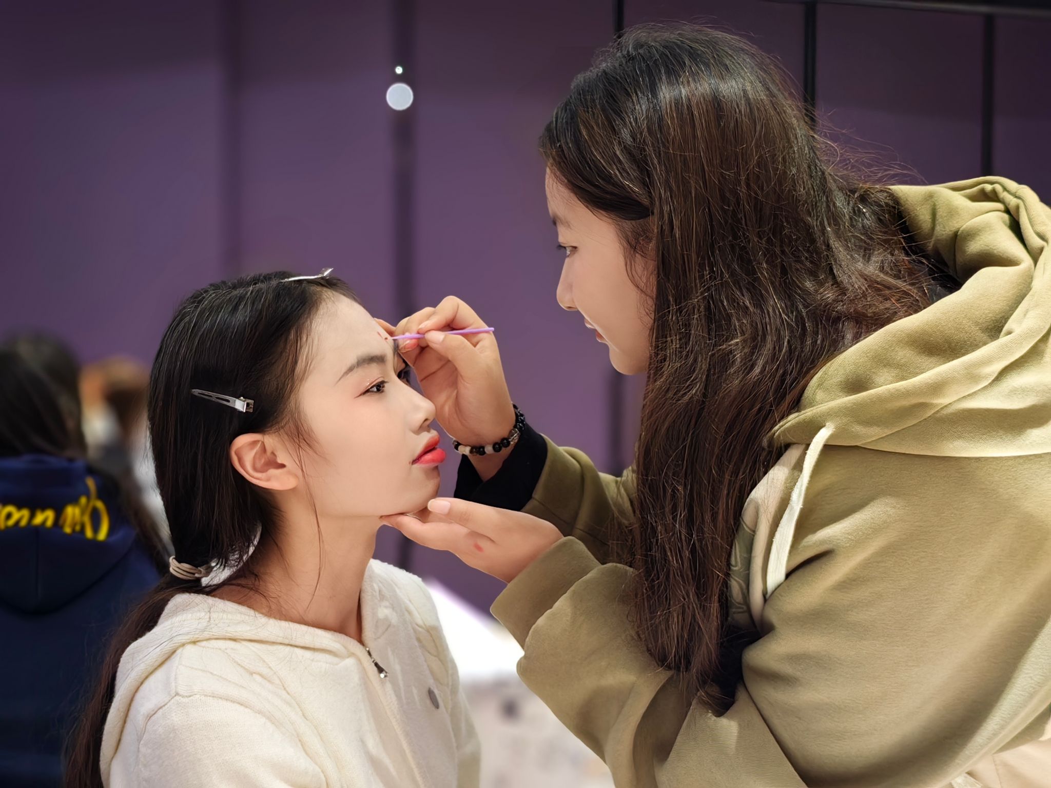 同学们抹胭脂、画黛眉、贴花钿、点面靥、描斜红、涂唇脂。大家一边化妆,一边交流心得,时不时上前观察演示组同学的动作,初次化妆的新手小白也在教学与练习中画出满意的妆容。一笔一划间,同学们仿佛穿越层层雾霭,去拥抱那千年之前的盛世。