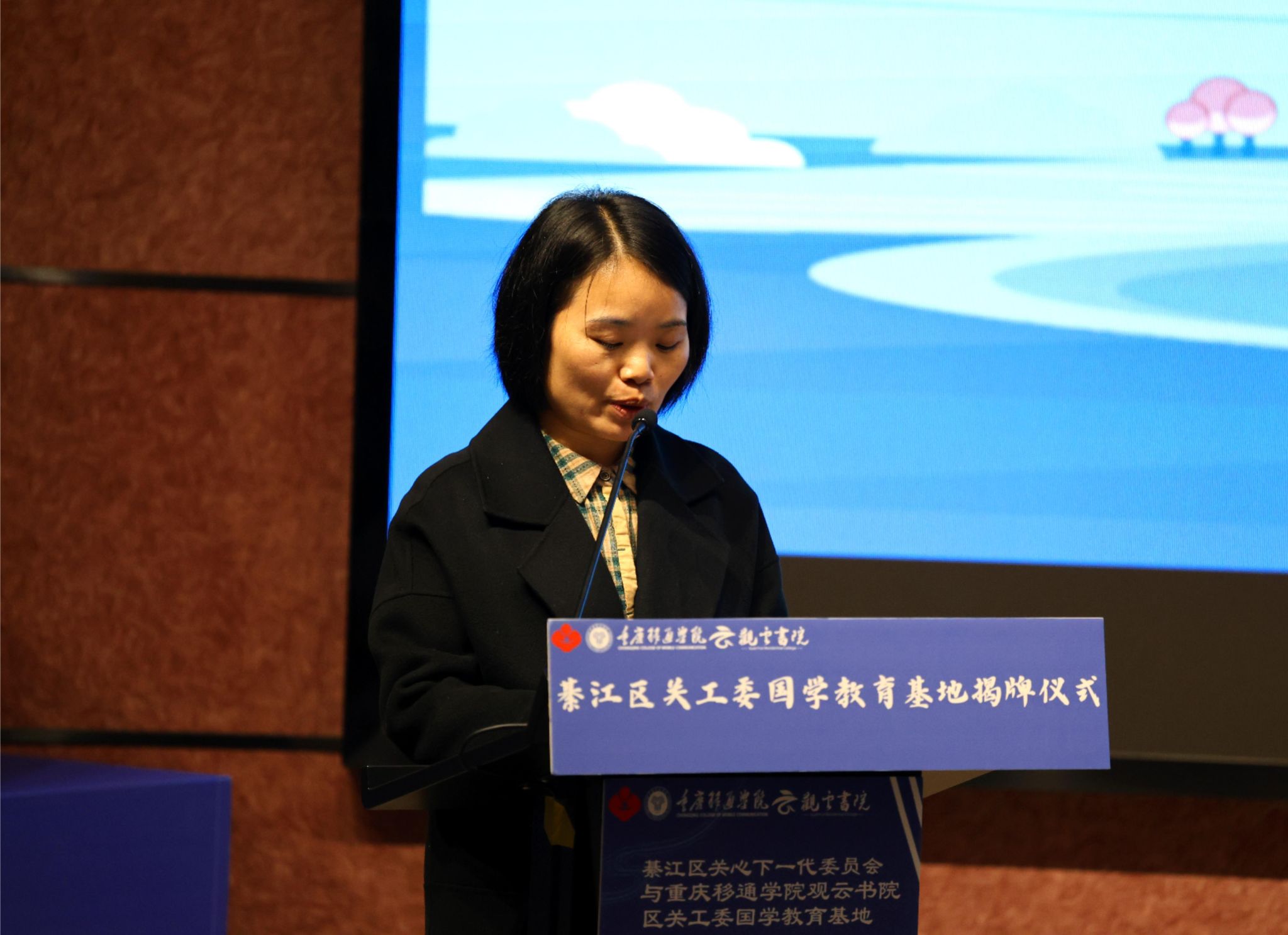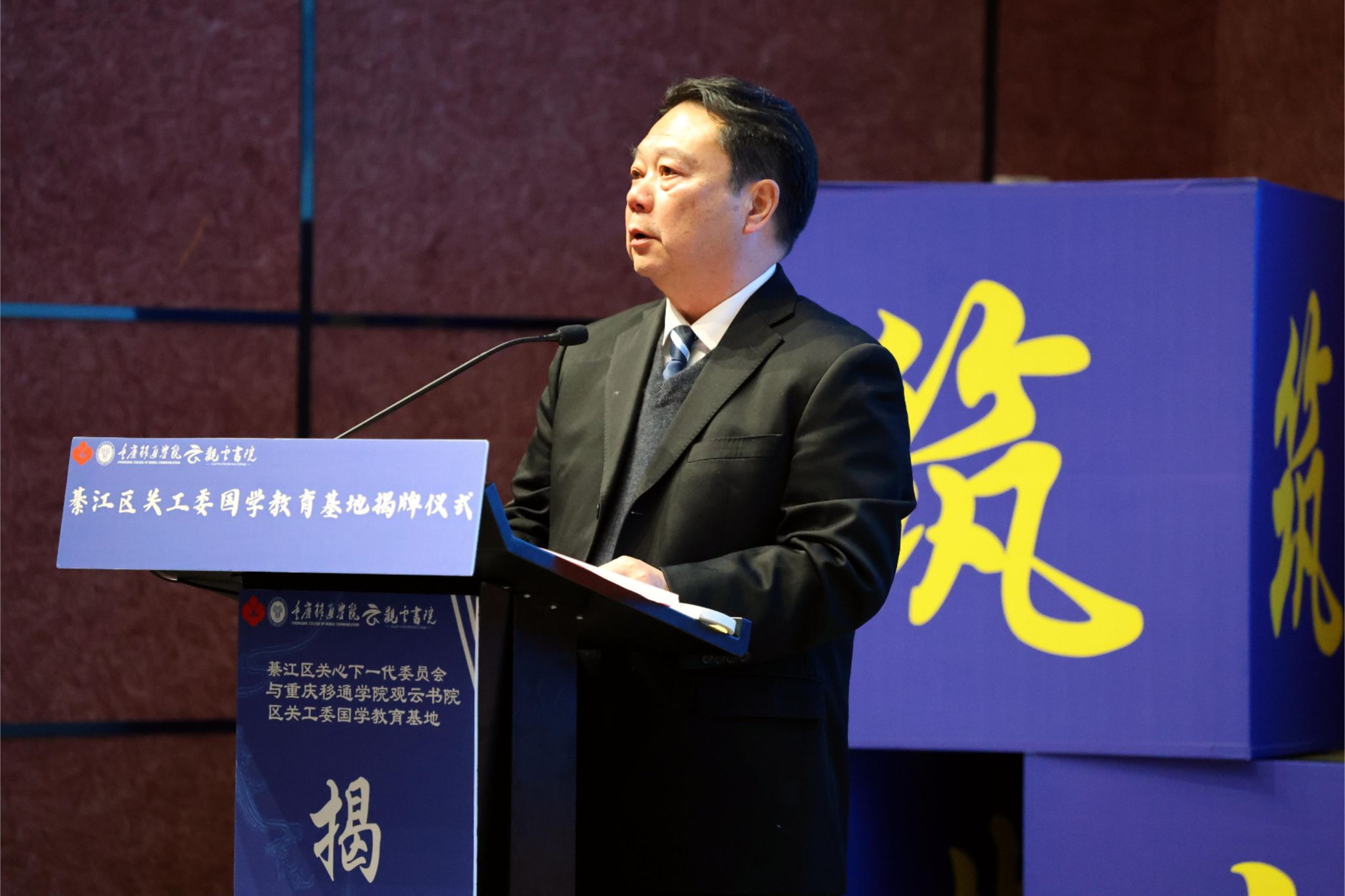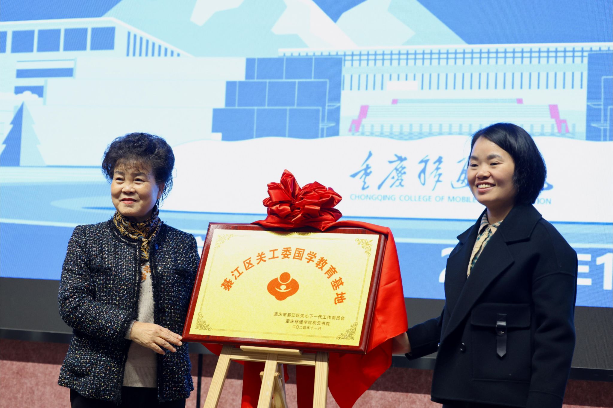 仪式中,綦江区关工委名誉主任杨昌茂、重庆移通学院校长助理谢银平共同为綦江区关工委国学教育基地隆重揭牌。