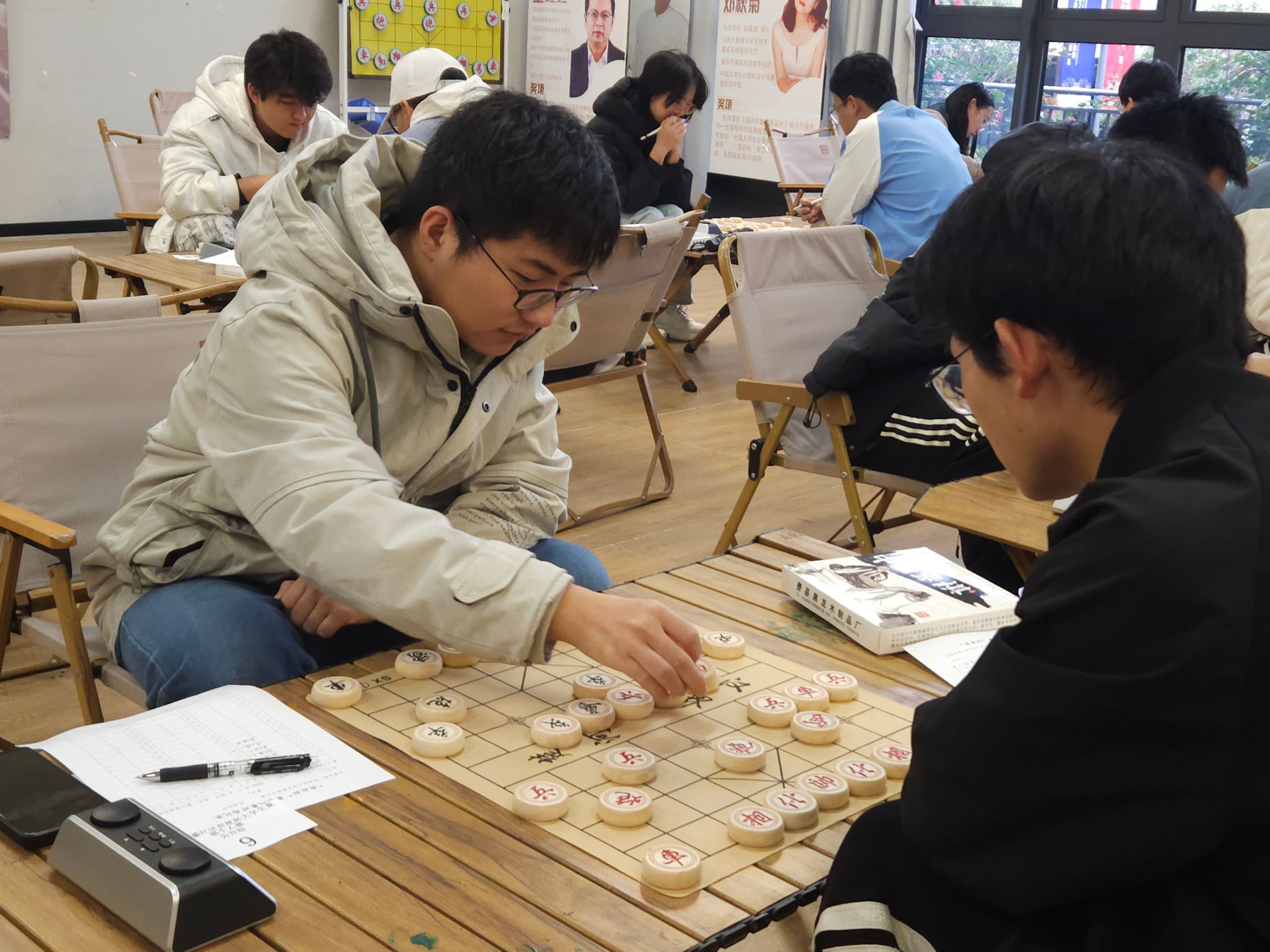 为了进一步推动棋艺文化的普及与发展,锻炼学生的逻辑思维和前瞻眼光,以棋育人,瀛溪书院和弈秋棋社联动綦江区三大棋协,打造“棋艺角”活动空间,积极开展象棋、围棋和国际象棋的课程教学,在重庆移通学院建设大学生棋类文化育人基地,以培养学生的逻辑思维能力、战略布局能力、分析判断能力和临机应变能力。为推动“棋艺角”的运行和棋艺育人目标的实现,綦江区“弈秋杯”大学生象棋个人赛在瀛溪书院圆满举办。