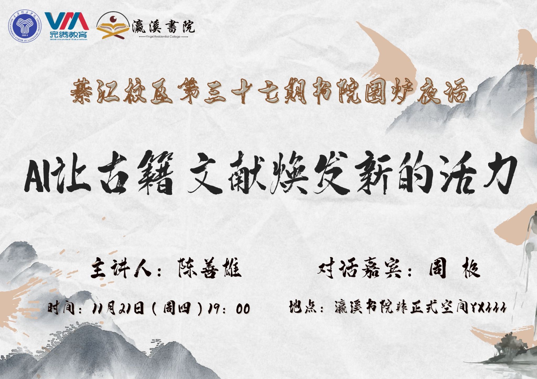 古籍文献所创造而出的文化价值是一个民族不朽的精神命脉,但在历史的长河中,古籍文献却仿若一颗曾璀璨闪耀如今却渐被时光遮掩光芒的明珠,正慢慢滑向被忽视的暗处。如今,随着人工智能(AI)技术渐入大众视野并被广泛应用,如同传承文化的“活力引擎”,为渐渐黯淡的古籍文献注入新的能量。为深入探讨AI技术在古籍文献保护与活化中的应用,为传统文化的传承与创新提供新思路和解决方案,瀛溪书院联合大数据学院举办了第三十七期书院围炉夜话,邀请西南大学计算机与信息科学学院陈善雄教授作为本期主讲人,戏剧与影视学院周极老师作为对话嘉宾,二位老师就“AI让古籍文献焕发新的活力”这一主题与同学们讨论,梳理如何在数字化时代有效保护并利用这些古籍文献,让这份宝贵的文化遗产在新时代继续熠熠生辉、绽放光芒。