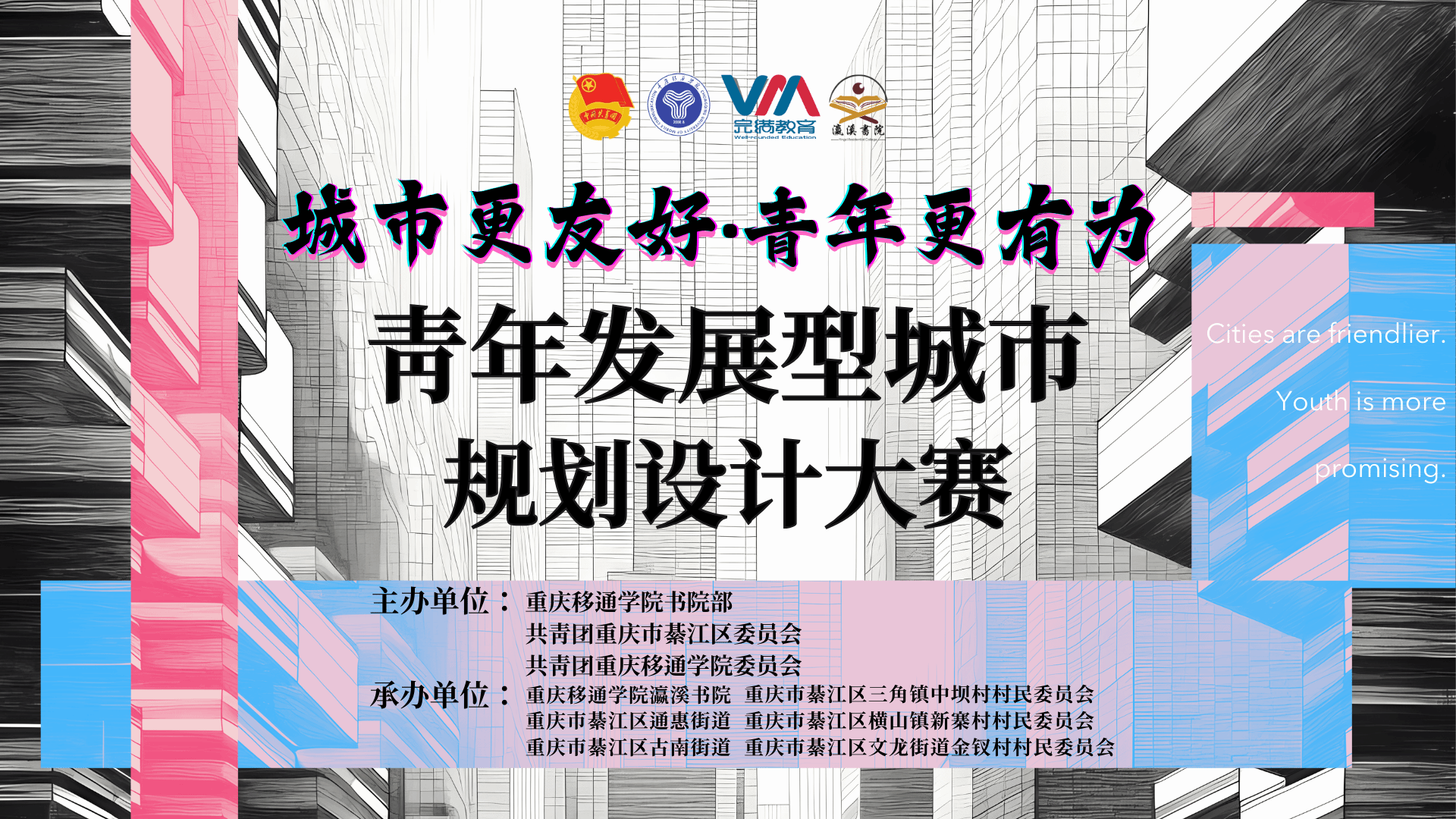 本次大赛由重庆移通学院书院部、共青团重庆市綦江区委员会、共青团重庆移通学院委员会主办,重庆移通学院瀛溪书院、重庆市綦江区百步梯、十字金街、中坝村、新寨村、金钗村承办。旨在通过重庆移通学子前瞻性思路规划设计,让学生走出课堂,观察真实的城市,力求为綦江区部分街道、乡镇的可持续发展提供一份可供参考的全面规划和实践指导,既是对专业教育的补充,也是助力青年城市发展。