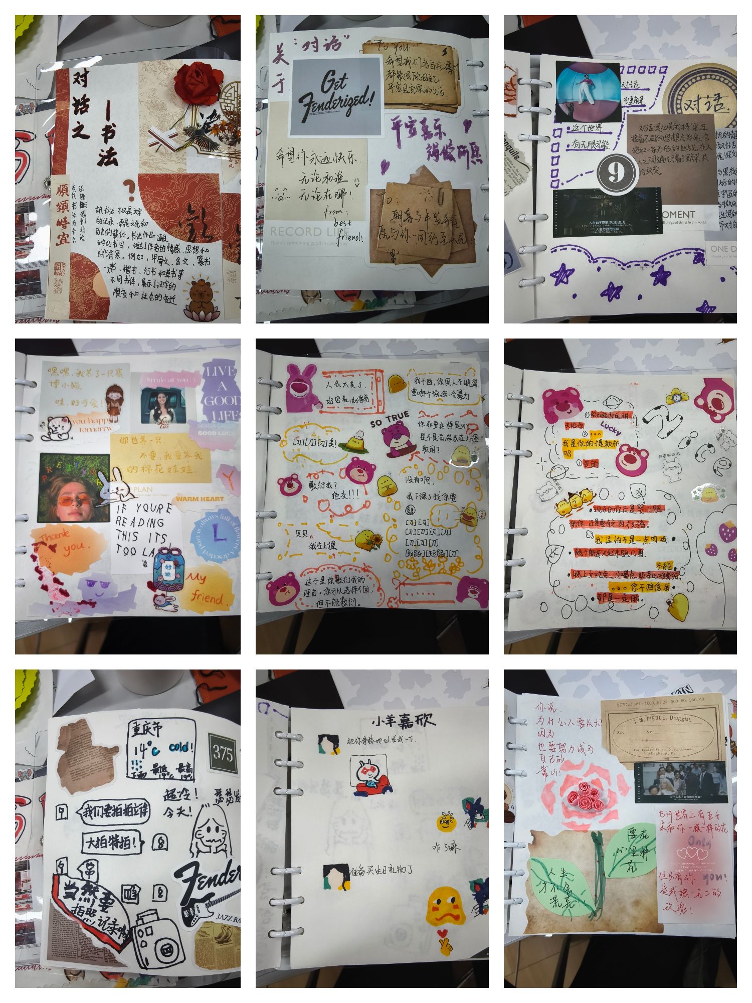 第三期活动则以“对话”为创作核心,邀请参与者通过手账与亲友、自然和内心对话。同将家庭的温馨时刻、和朋友的趣味聊天及自我审视的感悟记录在手账中,让记忆中的画面得以生动再现。这一过程不仅培养了同学们的共情能力,更让他们对内心世界的洞察与表达有了更为深刻的体会与实践。