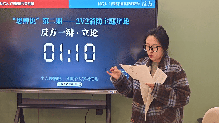 该辩题聚焦于人和人工智能未来发展趋势及关系。正方一辩陶利雅同学迅速亮出观点“人工智能足以胜任消防员的职责,在当今科技快速进步的背景下,人工智能在消防领域的广泛应用是行业变革的必然趋势,其低成本、高效率的优势不容忽视。”