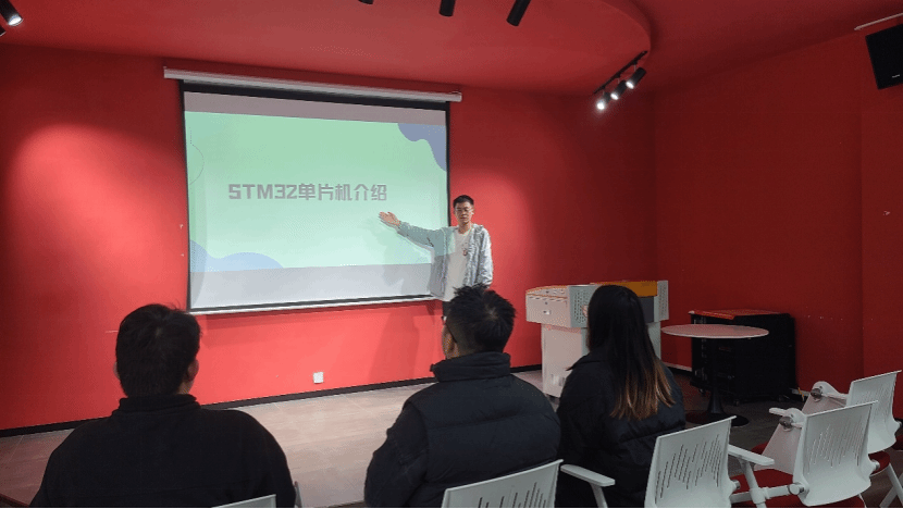 第四位发言的同学是2023级通信工程专业的黄瑞同学,他主要谈到暑期中自学STM32单片机开发的心得体会。在介绍STM32芯片的开发环境和功能特点基础上,给同学们分享了他在其中钻研的酸甜苦辣。最后,他给同学们分享了用STM32芯片所开发的几个小型电子产品,包括LED灯闪烁,LED流水灯,点亮屏幕,以及光敏电阻控制蜂鸣器。通过这些小型的电子产品制作,让他积累了基于STM32芯片的开发经验,也收获了自信。