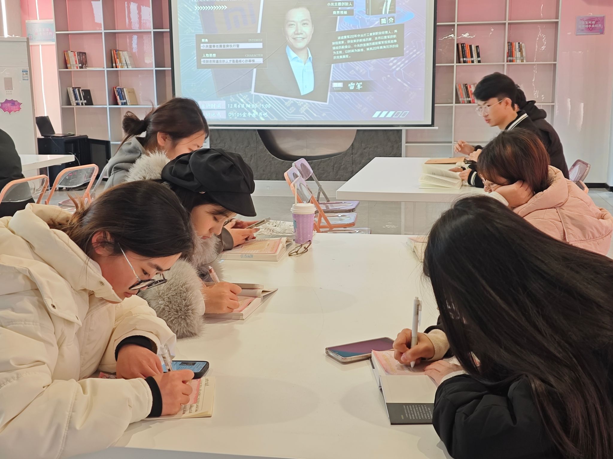 活动开始,细腻轻柔的背景音乐响起,活动室内的氛围开始变得宁静,只留同学们的翻书声音回荡其间。同学们手中紧握着本次的主题书籍《雷军传》,沉浸在字里行间,仿佛置身其中,正与小米创始人雷军进行一场面对面的交流。同学们手中翻阅的不仅仅是文字的堆砌,其中的内容记录了雷军从名不见经传到其手下小米品牌已然人尽皆知,这之间的奋斗历程为在场的每一位读者提供了一扇洞悉创新精神与奋斗精神的窗口。同学们专注的眼神、偶尔的批注,每一处细微的神情与动作都无一不透露出他们对这位大咖的敬佩。
