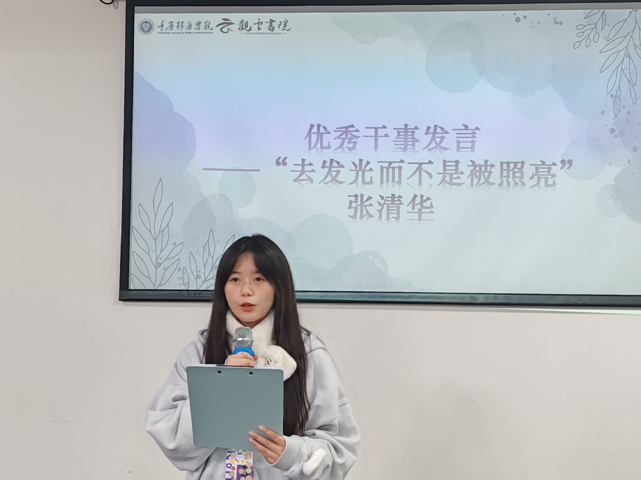 同时,此次表彰大会也邀请了各项获奖人员代表发言。优秀千事代表张清华带来演讲《去发光而不是被照亮》,每一个人都是属于自己的一抹光,点点微光也能汇聚人间星河。对于他们而言,这是一直努力后被发现的肯定,也是未来继续前进的动力。希望每位干部干事都能以此为榜样,继续向前发光发热。