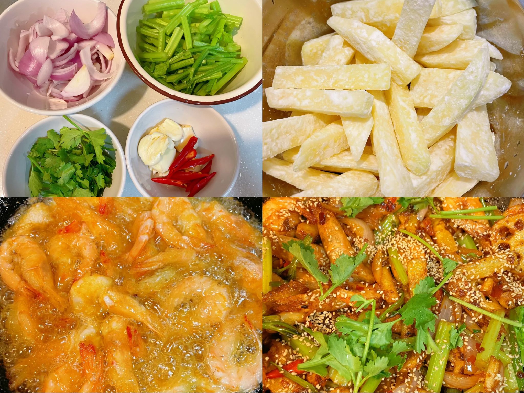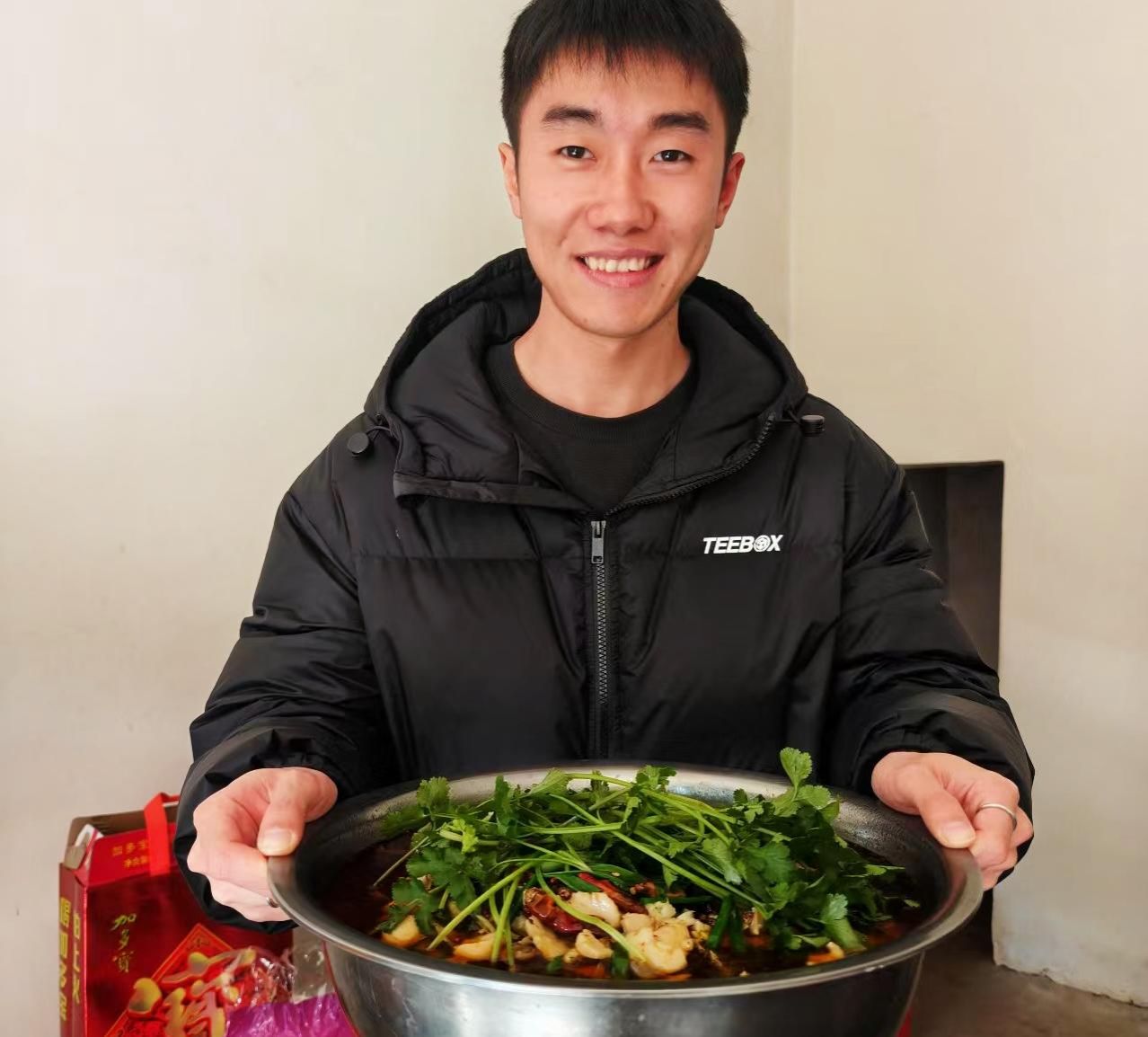 来自成都的周旭通过视频展示了制作干锅虾的过程。他将鲜活的虾剪去虾须,腌制后用油煎至金黄酥脆,再加入土豆片、莲藕、洋葱等配菜。锅中倒入干锅酱料,伴随着“滋滋”作响的声音,麻辣的香气瞬间弥漫开来。视频中的干锅虾色泽红亮、虾肉饱满,配上土豆与莲藕的软糯,让人隔着屏幕都忍不住咽口水。