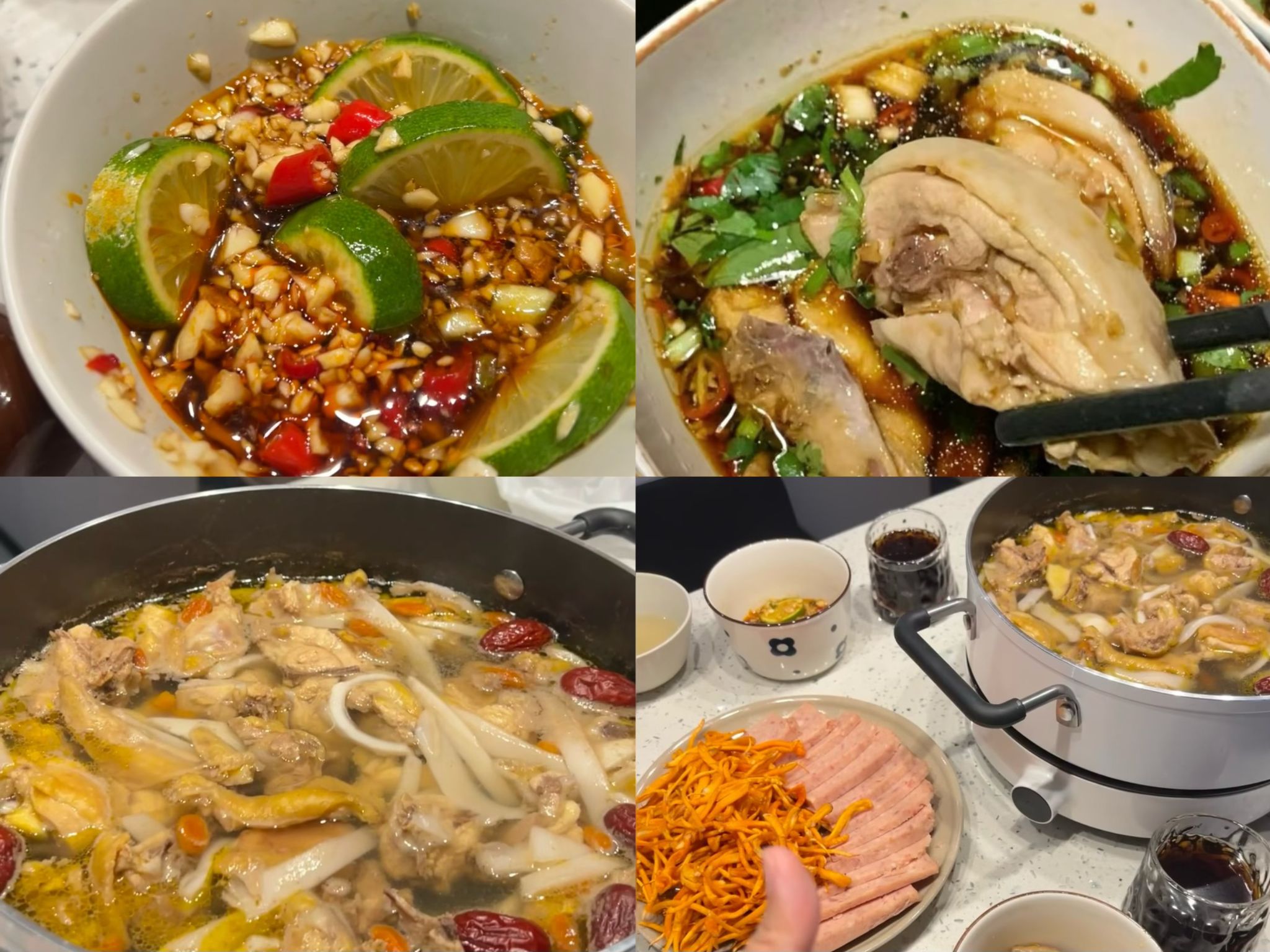 来自三亚的肖嘉伟分享了家乡特色的椰子鸡火锅。他将新鲜的椰青水倒入锅中作为汤底,加入椰肉条增添清香,再将切块的文昌鸡放入锅中炖煮。鸡肉在椰汁的浸润下变得鲜嫩多汁,汤底清甜爽口,搭配海南特有的黄灯笼辣椒酱,别有一番风味。这道菜不仅是三亚年夜饭的经典,更是海岛风情的完美体现。